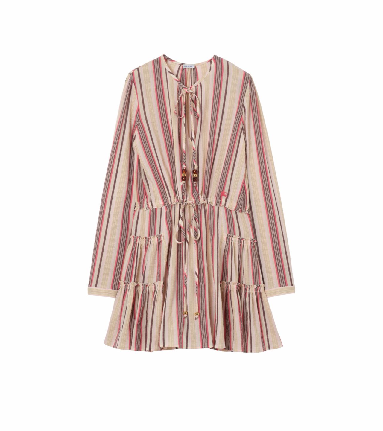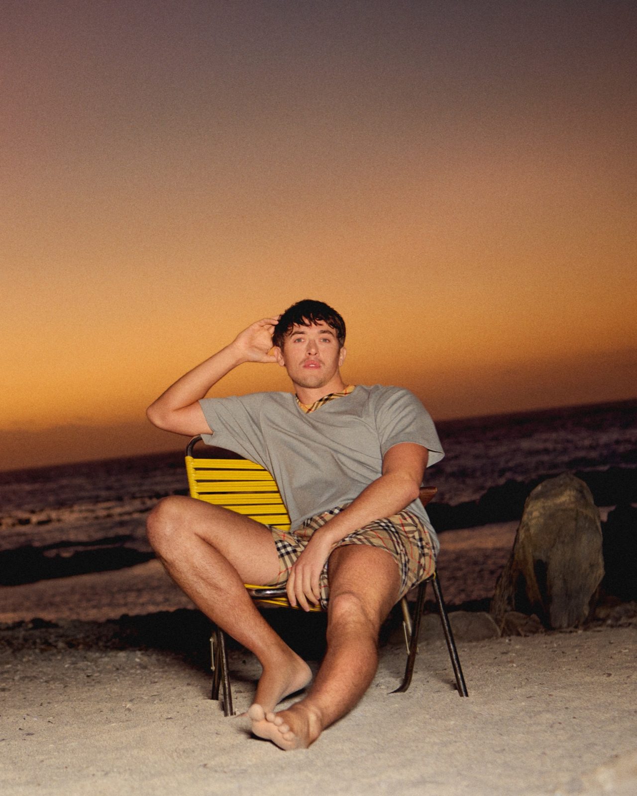 本コレクションのバーバーリーチェックは、アイコニックなサンドベージュを筆頭に、オーバジンパープルやコーンフラワーブルーの柔らかな色調で構成される。ビキニやスイムショーツなど、男女ともに水着を中心にラインナップし、レディースには軽やかなコットンボイルのカットソーやスカート、色調を統一したストライプのドレスが登場。ルックで腰に巻かれたウールシルクの鮮やかなスカーフも、夏のムードを一層引き立てる。メンズでは、リラックスシルエットのTシャツやショーツに加え、シーホース柄をあしらったシャツや肌寒い夕暮れに適した薄手のフードジャケットを取り揃える。