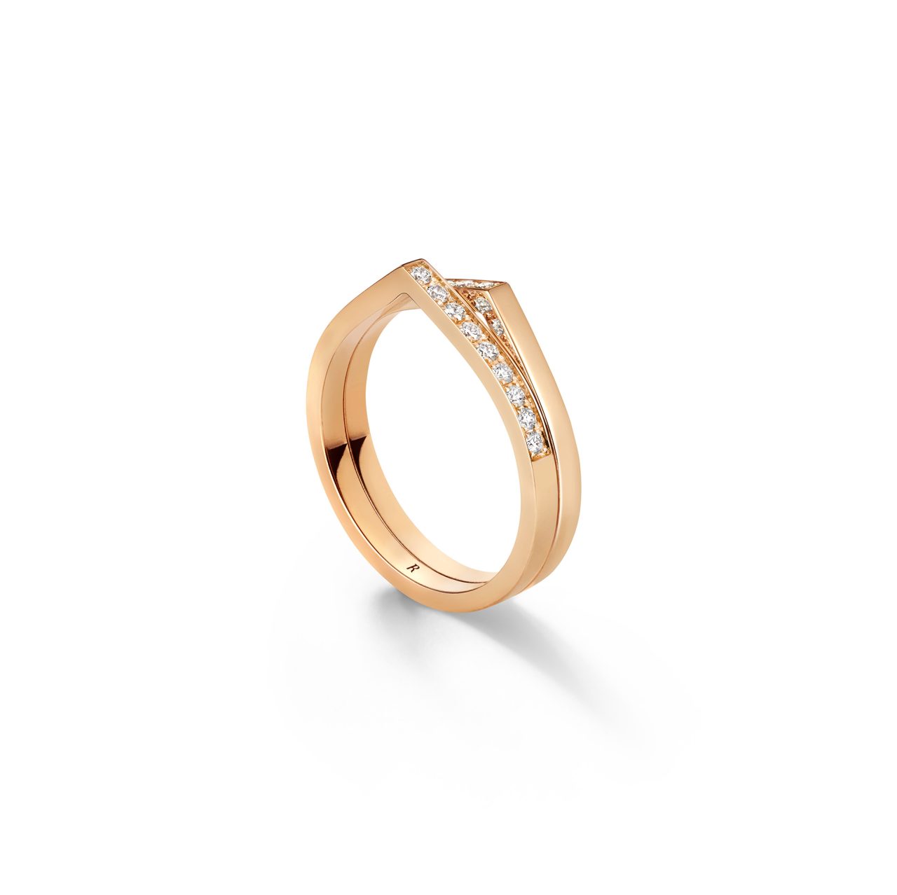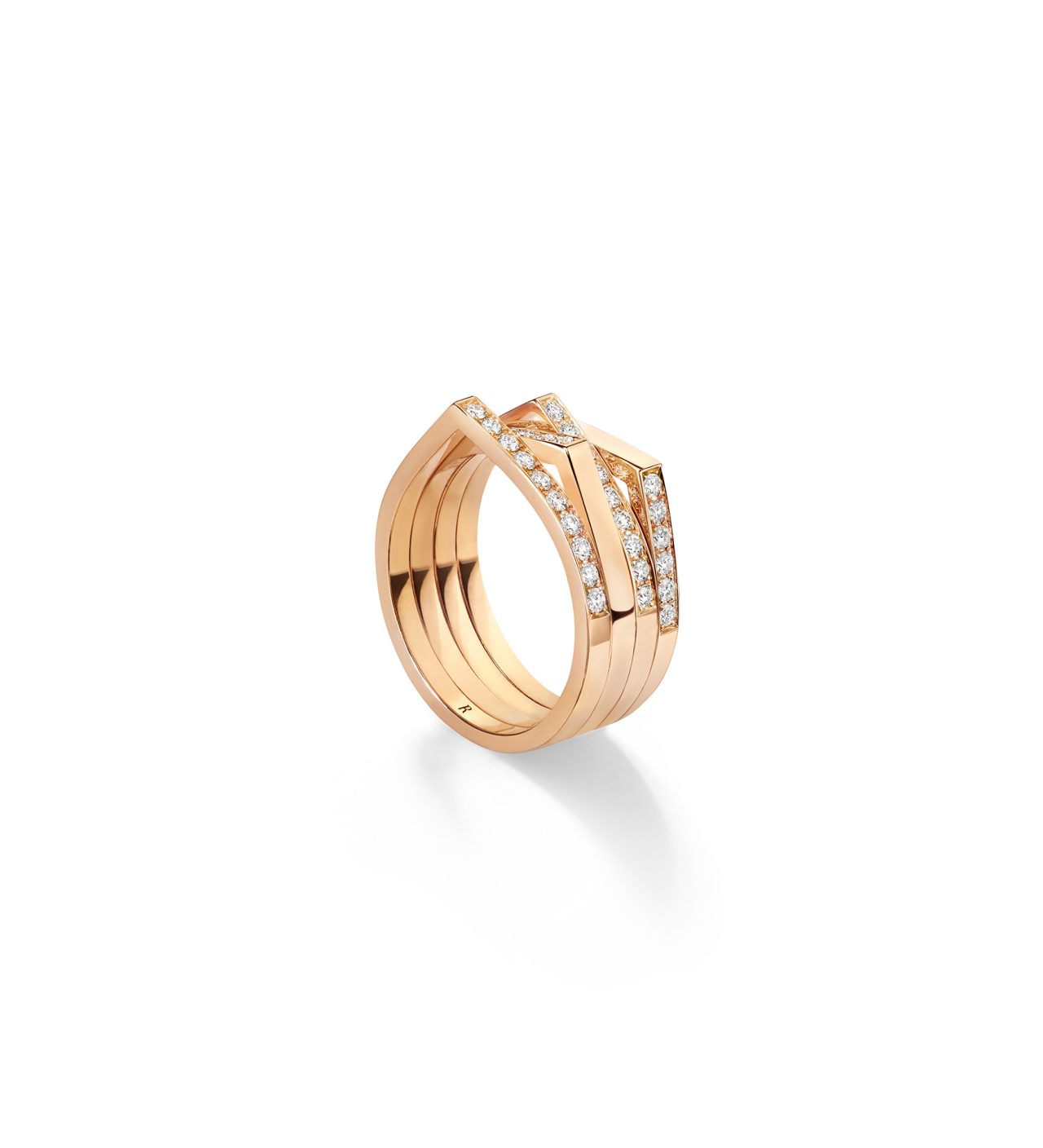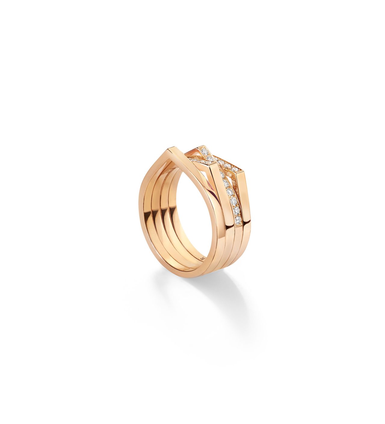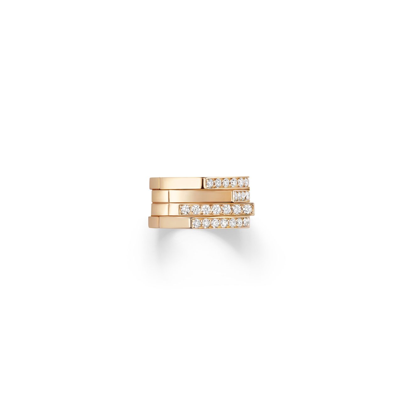 リングには、ハーフパヴェ・ダイアモンドをあしらった新作が登場。2連と4連の構成が、指先にリズミカルな美しさを生み出し、スタイリングにそっとアクセントを添えてくれる。