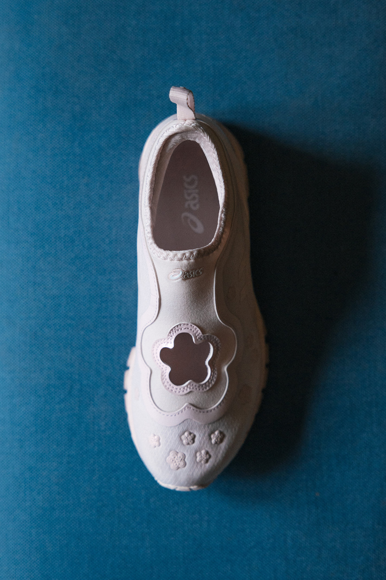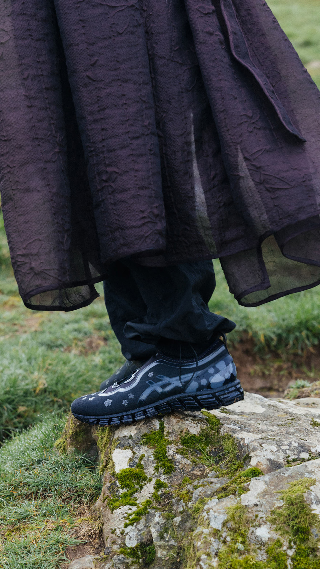 ASICS の象徴的なフォルムを、Cecilie Bahnsen の視点で再解釈した本作。トゥまわりとヒール部分にはアイコニックな花柄があしらわれ、フロントには足の甲がさりげなく覗くようなカットアウトが施されている。繊細なディテールが、足元に洗練された印象をもたらしてくれる。