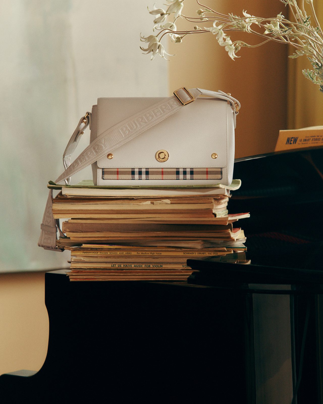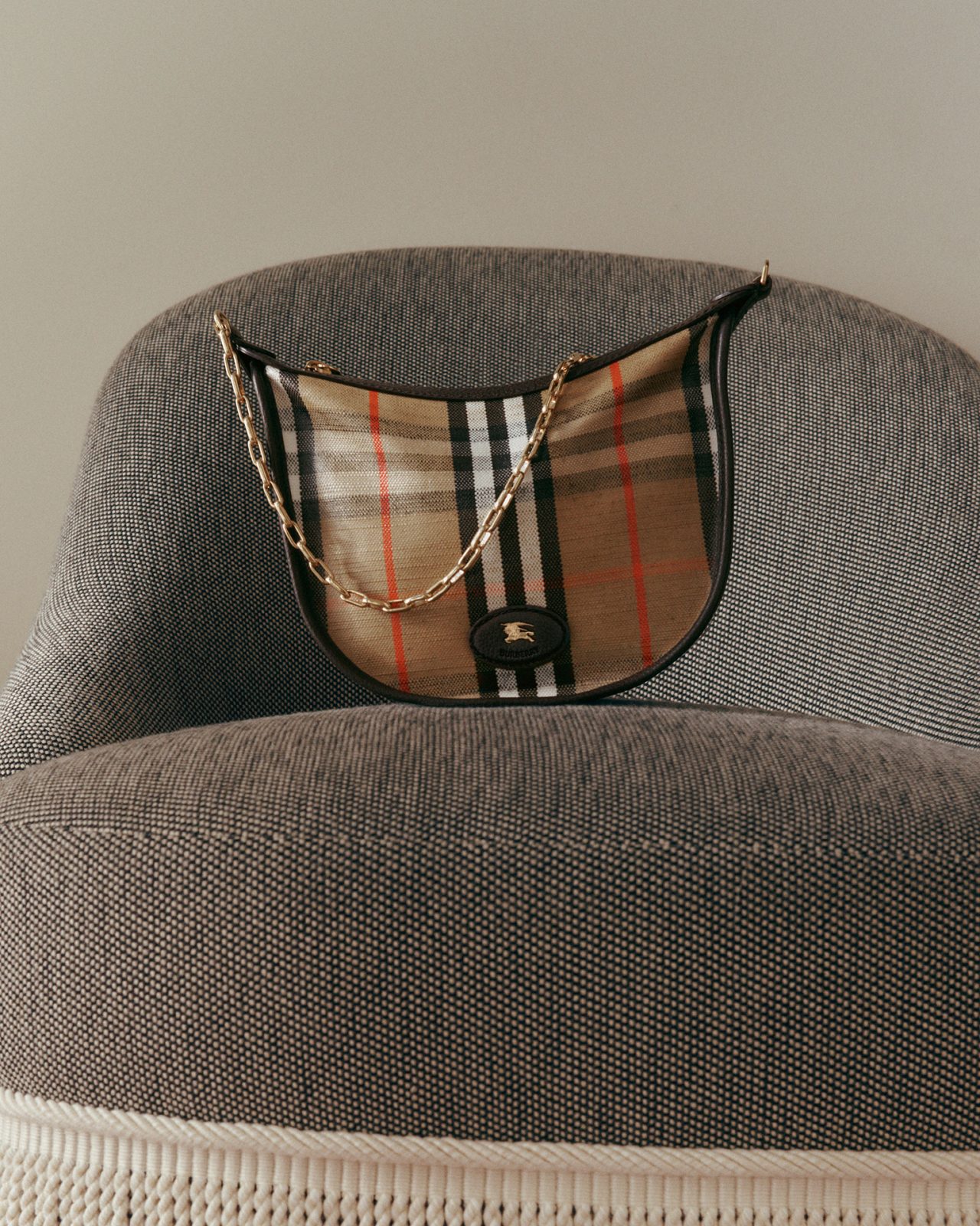 さらにアクセサリーでは、 Burberry らしいクラシカルな美学を体現するバッグがラインナップ。温かみを帯びた白の「コッツウォルズ」トートや、バーバリーチェックがさりげなく配された「ノート」バッグ、コンパクトながら確かな存在感を放つバニティバッグが並ぶ。