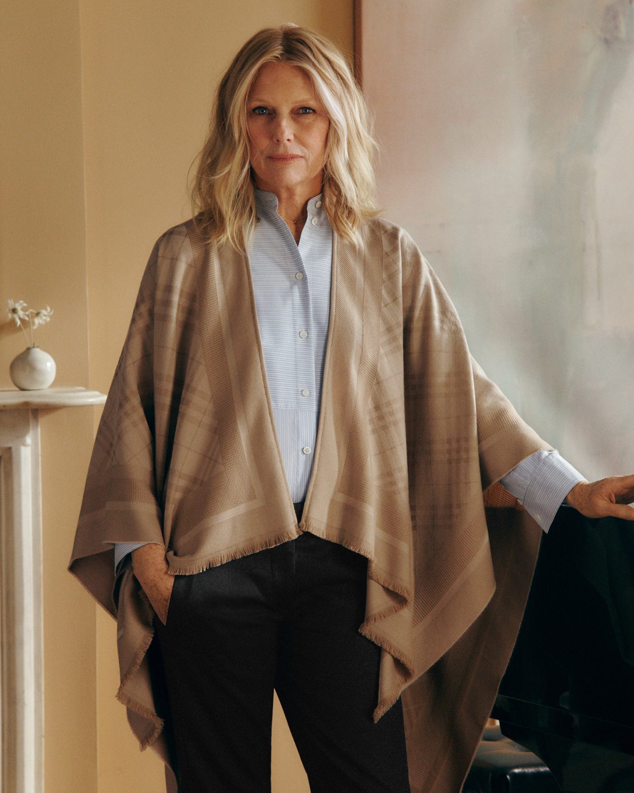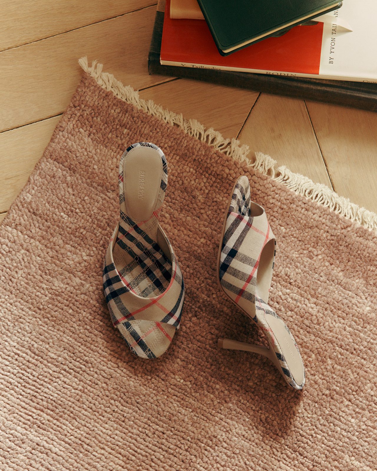シューズには、装いを引き締める「ミュール」や軽やかな印象の「エスパドリーユ」などが並ぶ。いずれもアイコニックなチェック柄を全面に配したデザインで展開される。さらにスカーフには、水彩画のようなチェックがあしらわれ、やわらかなニュアンスを添えている。