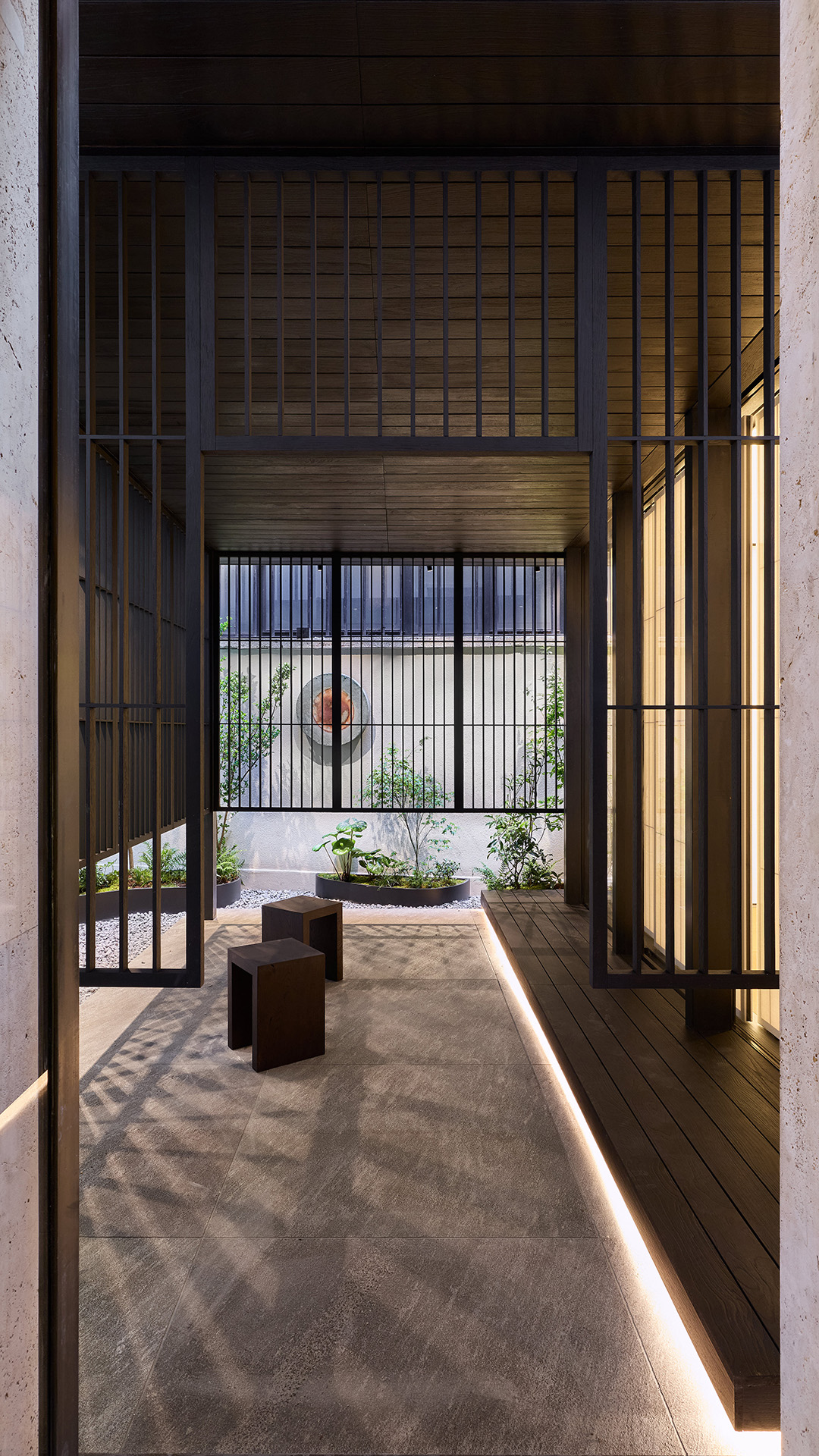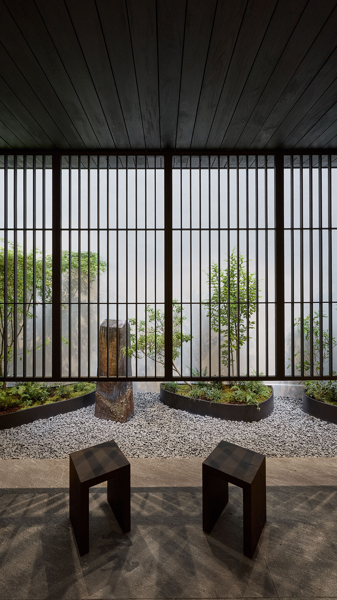 中庭には茶室が据えられ、畳を基調とした静かな空間が広がる。砂利や植栽、Gates による器が配された庭は、もてなしと所作が交わる場として立ち上がり、思索へと誘う。