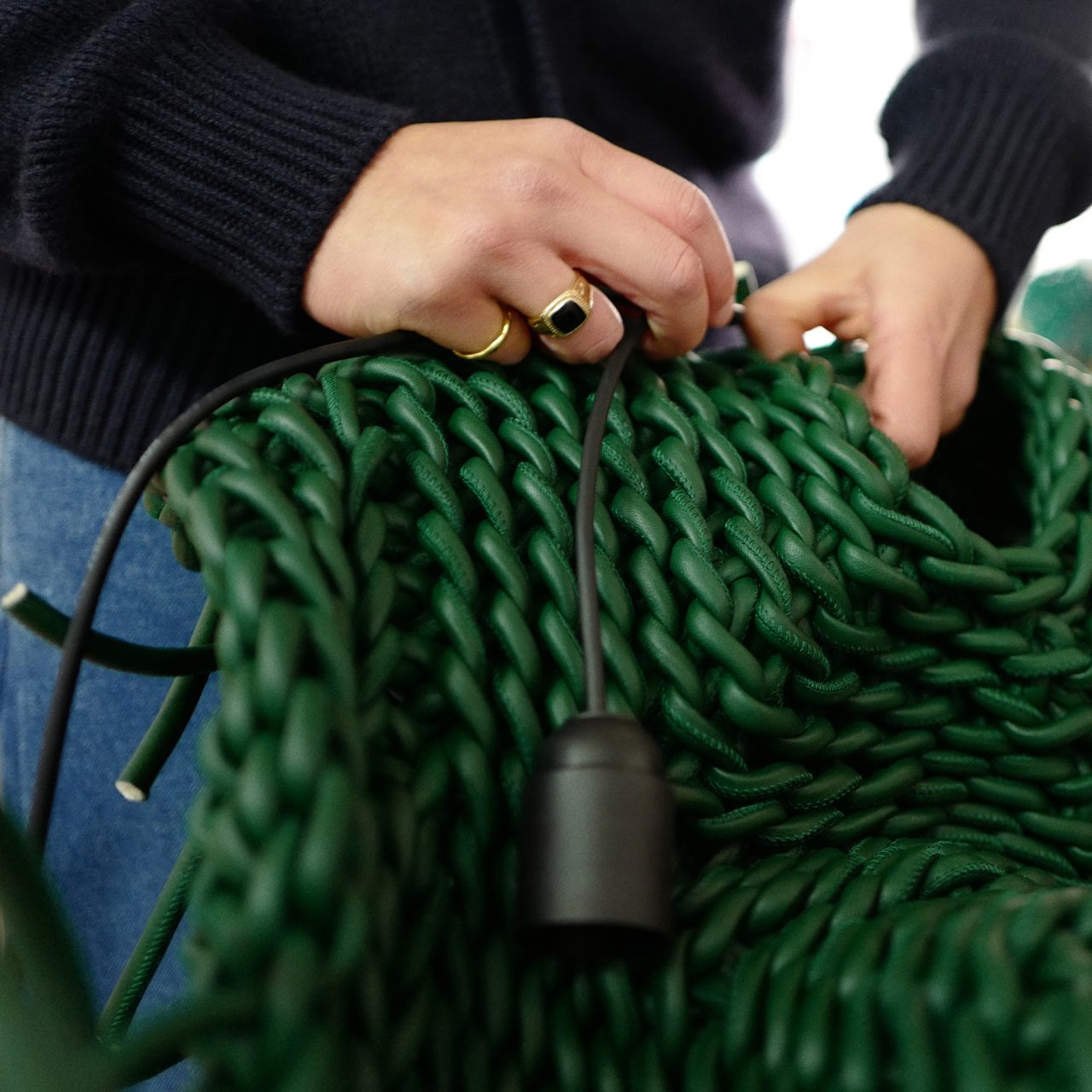 BOTTEGA VENETA が、「ミラノデザインウィーク2026」にて、韓国人アーティスト Lee Kwangho とコラボレーションしたインスタレーションを公開する。「ミラノデザインウィーク2026」は、世界最大規模の家具見本市である「ミラノサローネ」と、ミラノ市内全域で行われる「フォーリサローネ」で構成されるデザインの祭典。今回の作品「Lightful」は、彼の創作を象徴する、空間に浮かぶように吊り下げられた編み込みの構造体に、BOTTEGA VENETA の革ひもを編み上げ、新たな光の彫刻を融合させた作品となっている。英国出身で BOTTEGA VENETA クリエイティブ・ディレクターを務める Louise Trotter (ルイーズ・トロッター) がセレクトした、ブラックとグリーンで仕上げられた光の彫刻は、それぞれが有機的独創的なフォルムをもち、Lee のクラフトプロセスにアクセントと深みを添える。