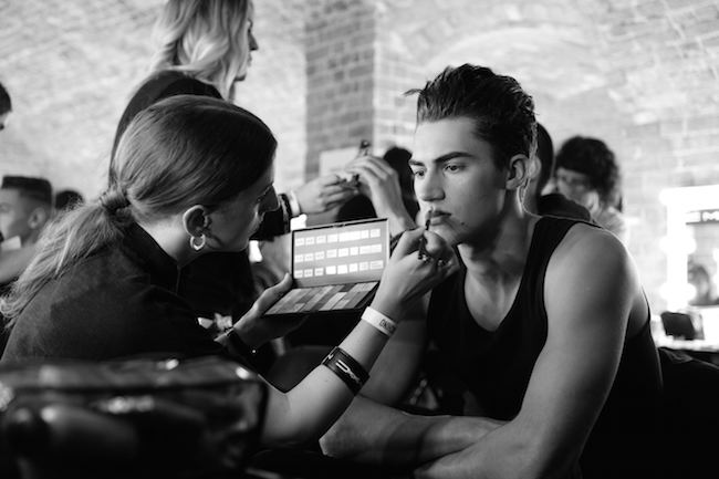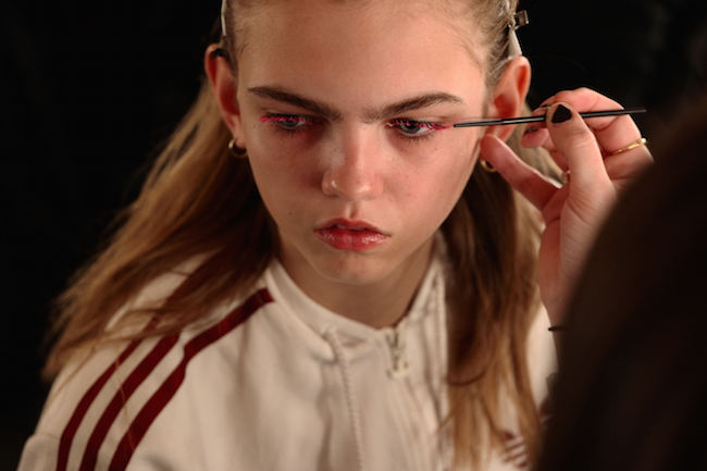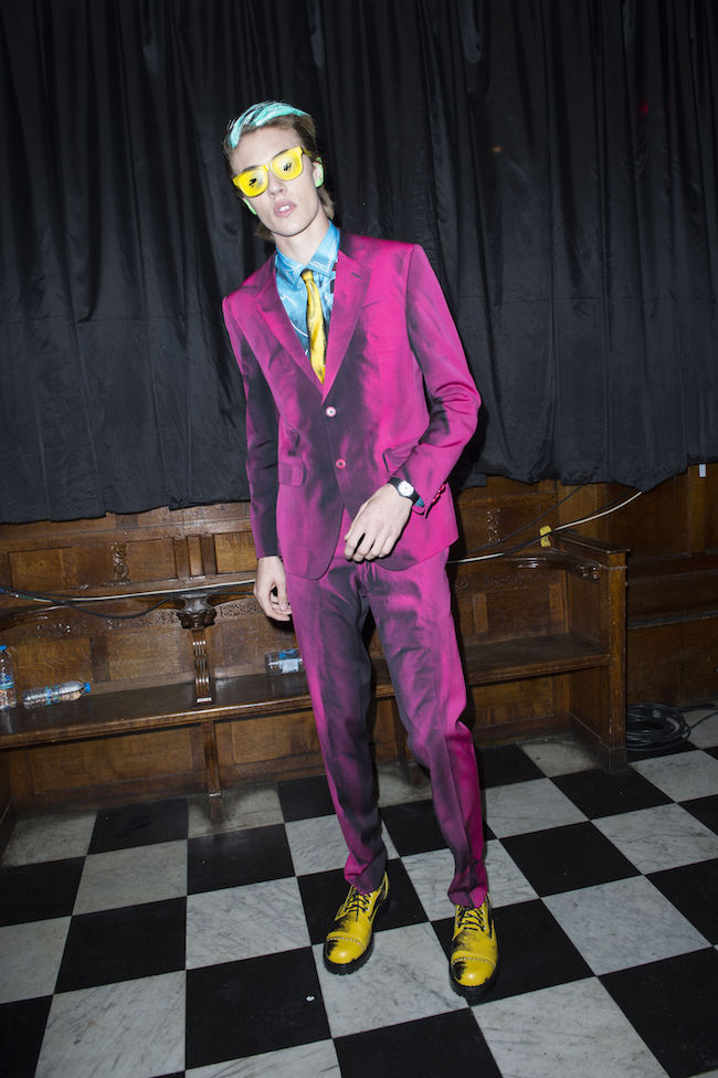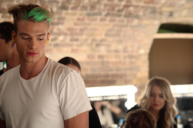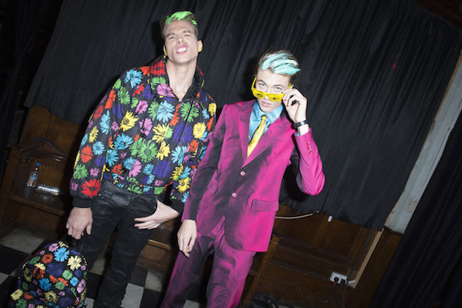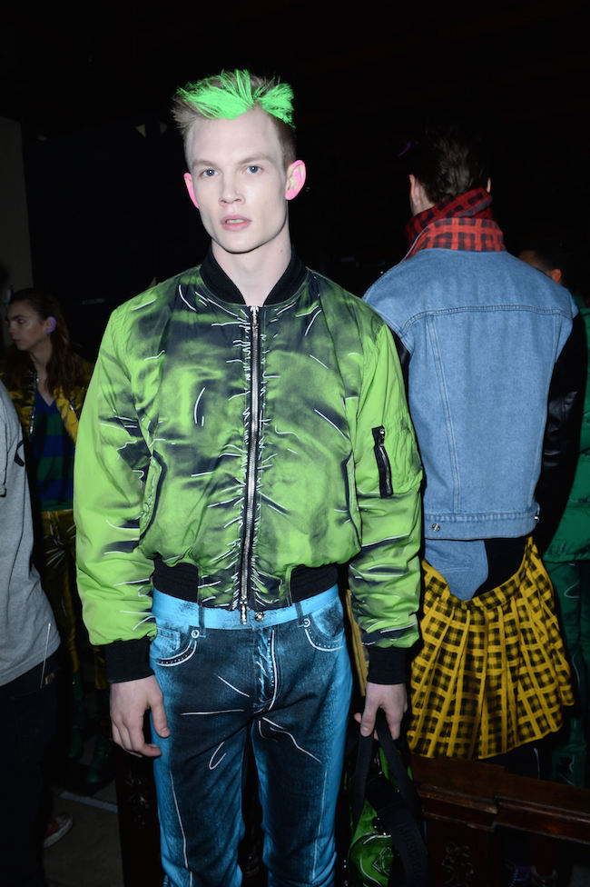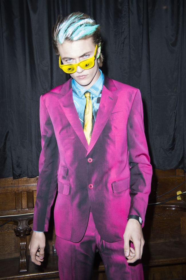 Jeremy Scott (ジェレミー・スコット) による Moschino (モスキーノ) 2016-17年秋冬メンズコレクションより、ショーの直前の緊張感を捉えたバックステージ写真が到着。今季 Gilbert and George (ギルバート&ジョージ) とのコラボによって制作されたコレクションのテーマを反映させたメイクは、まるで現代アートの中から飛び出してきたようなネオンカラーを顔のみならず髪の毛や耳に至るまで取り入れたプレイフルなムードだ。