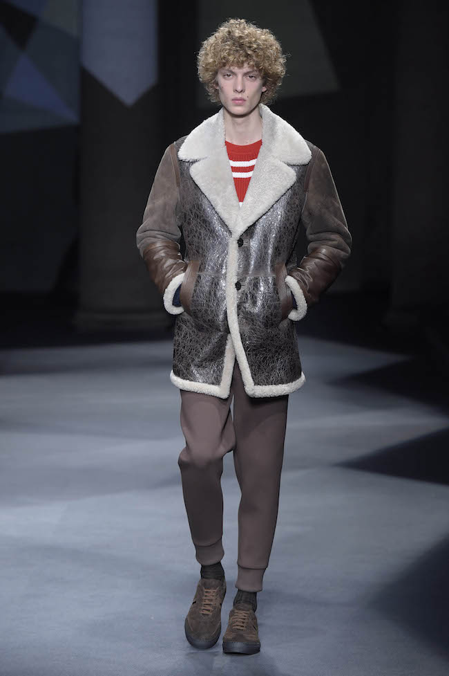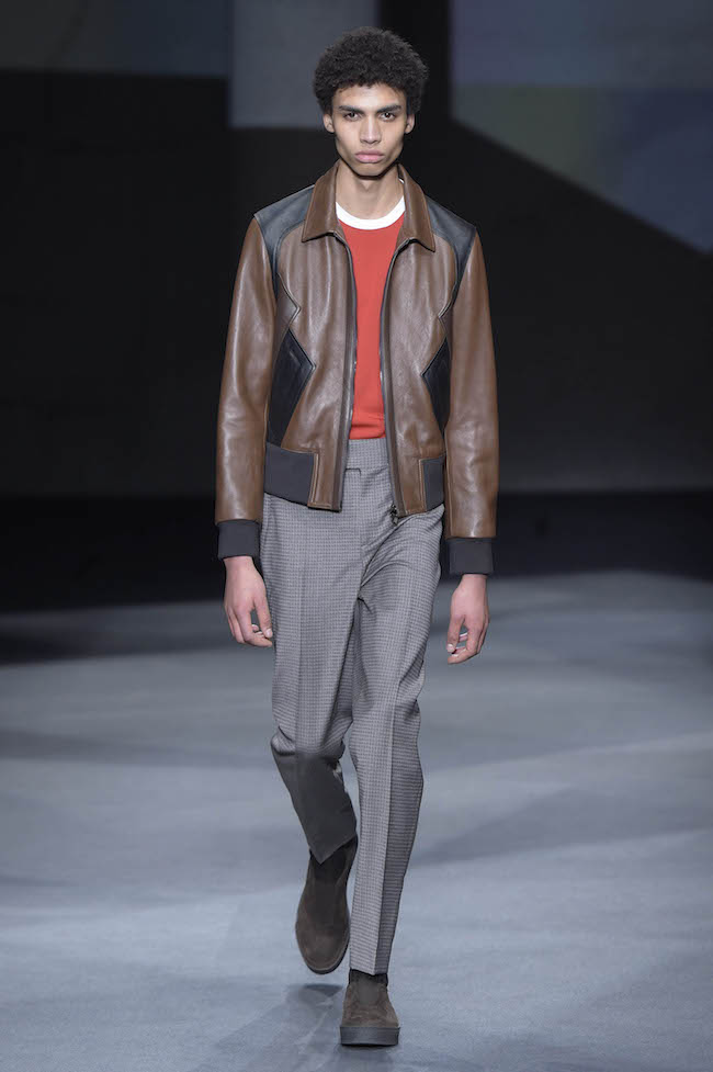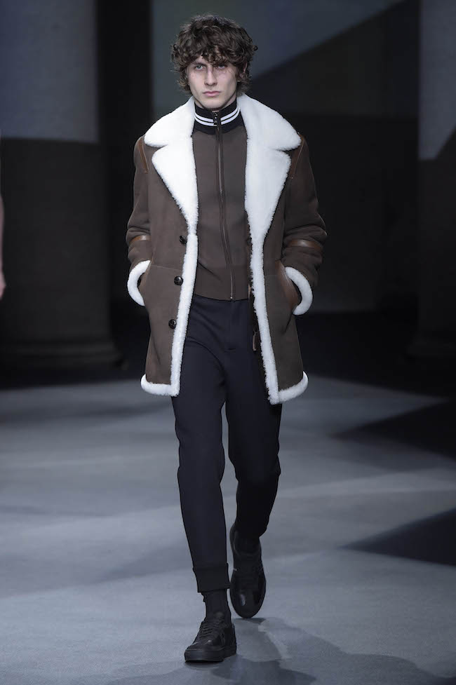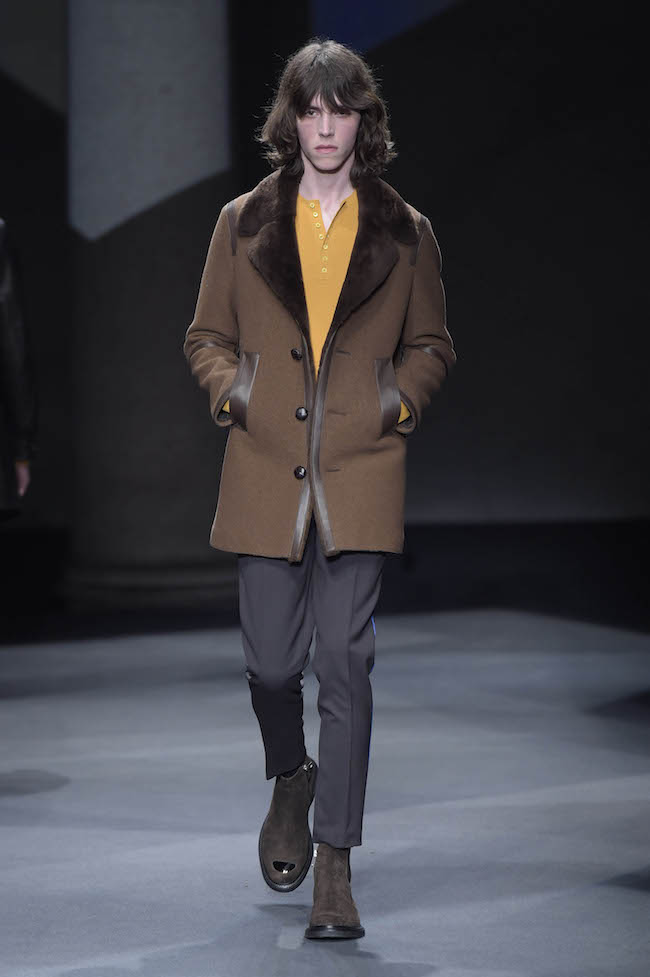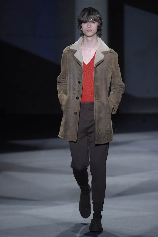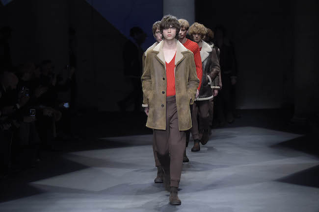 イギリス仕込みの洗練されたデザイン美学と、イタリアが誇る最高峰のクラフツマンシップで知られる同ブランドのメンズウェア。今季のテーマはデザイナーの Neil Barrett (ニール・バレット) 自身がイギリスで過ごした幼少時代。重めのバングが70年代のロックスターを彷彿とさせるファーストルックでは、目の覚めるようなタンジェリンのニットと、エイジング加工を施したムートンジャケットが登場した。