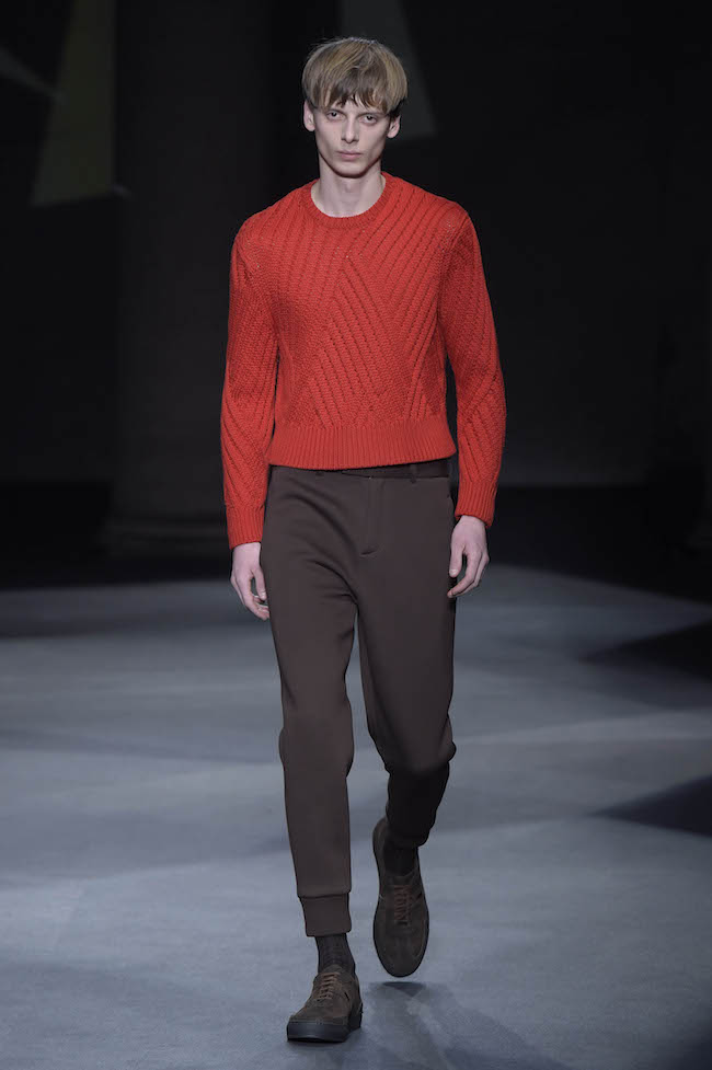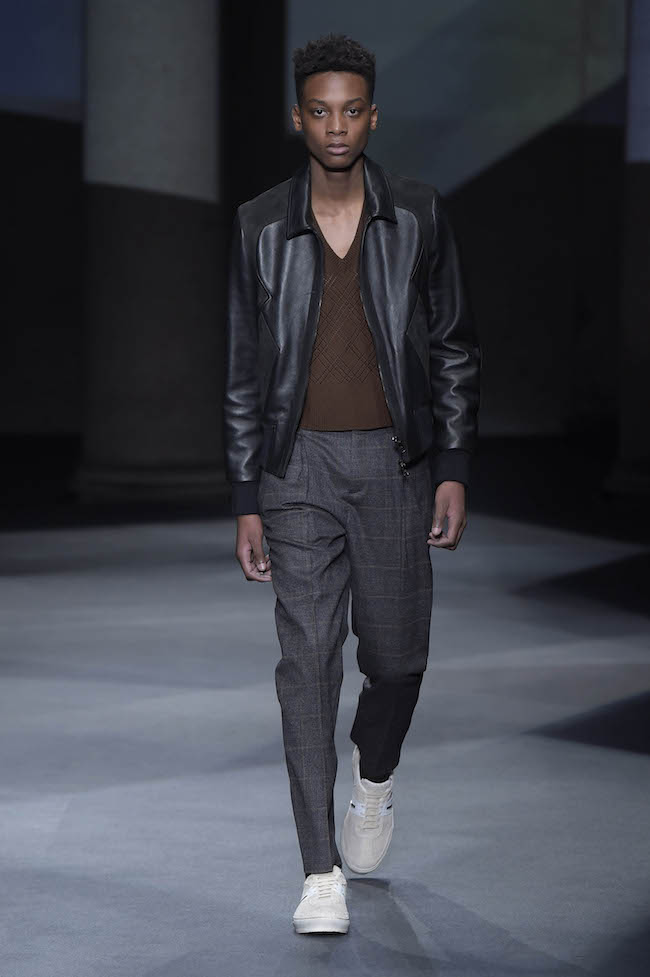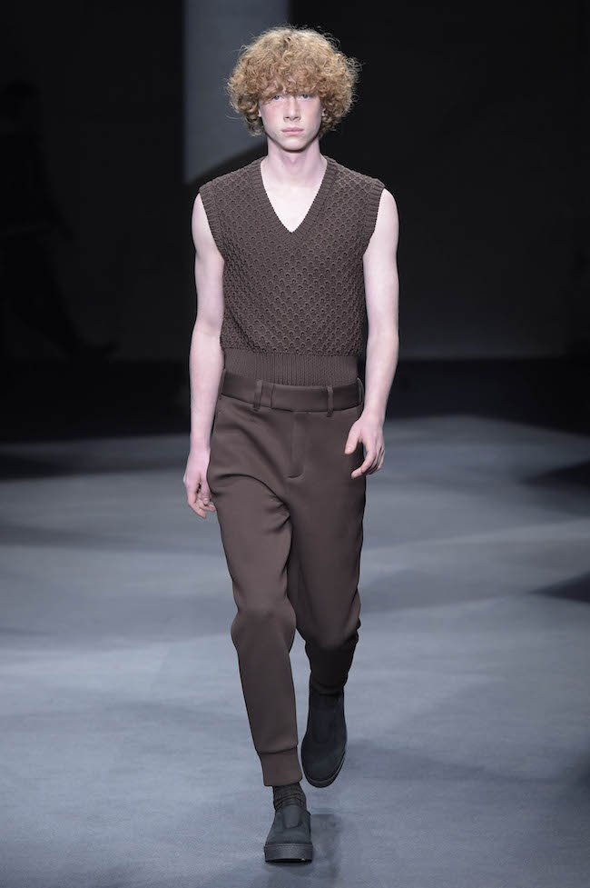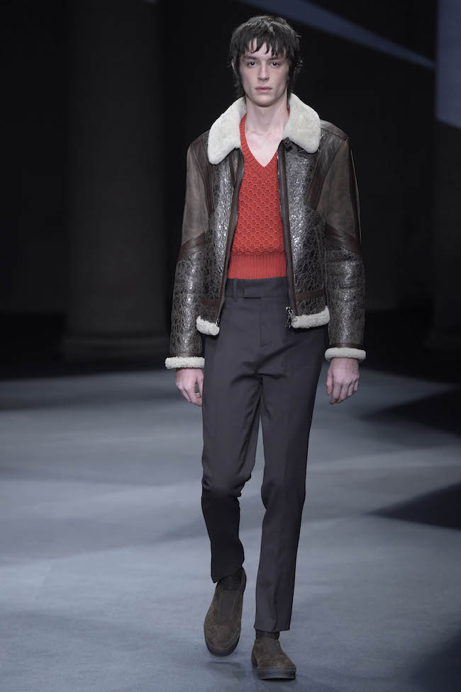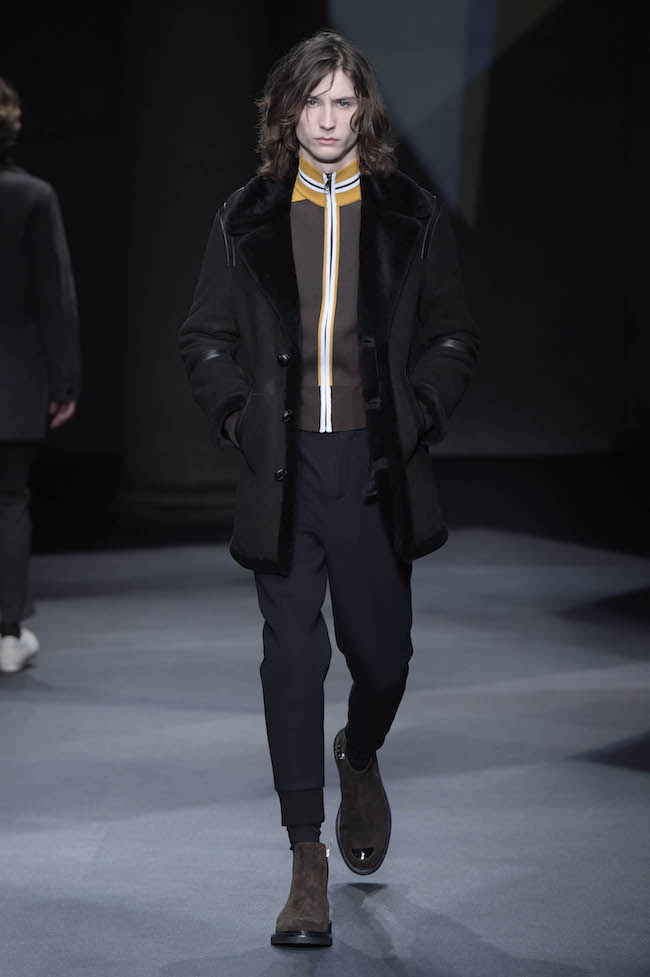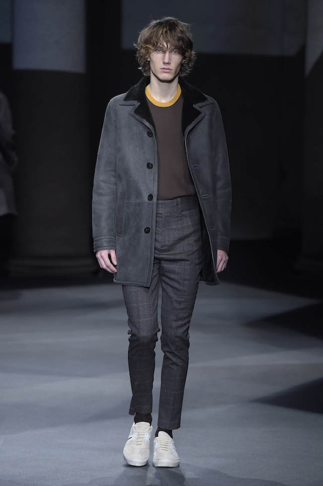 イギリス仕込みの洗練されたデザイン美学と、イタリアが誇る最高峰のクラフツマンシップで知られる同ブランドのメンズウェア。今季のテーマはデザイナーの Neil Barrett (ニール・バレット) 自身がイギリスで過ごした幼少時代。重めのバングが70年代のロックスターを彷彿とさせるファーストルックでは、目の覚めるようなタンジェリンのニットと、エイジング加工を施したムートンジャケットが登場した。