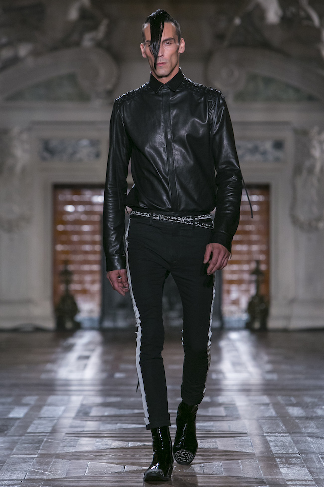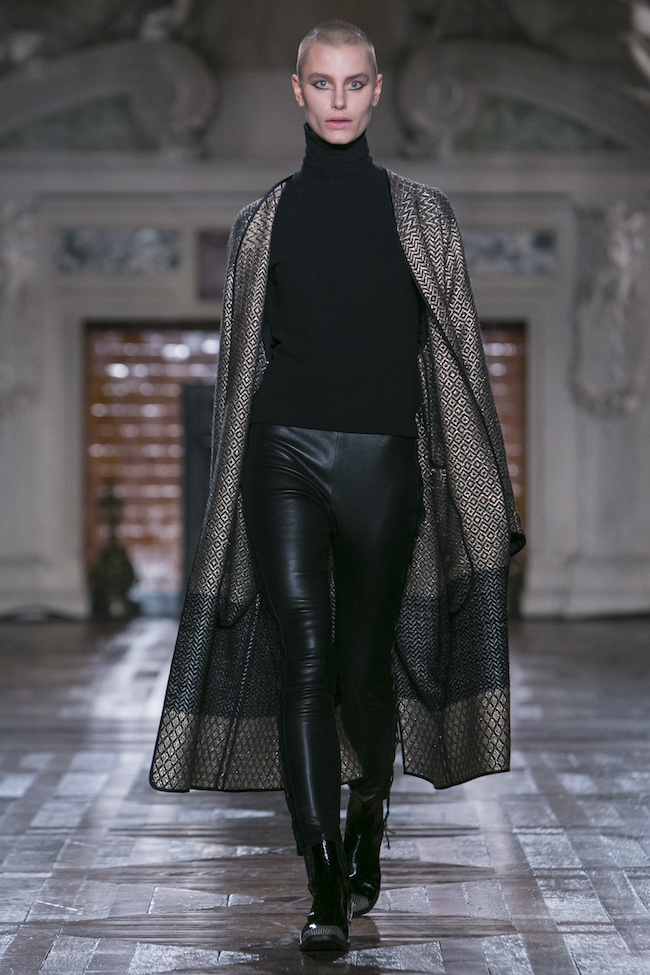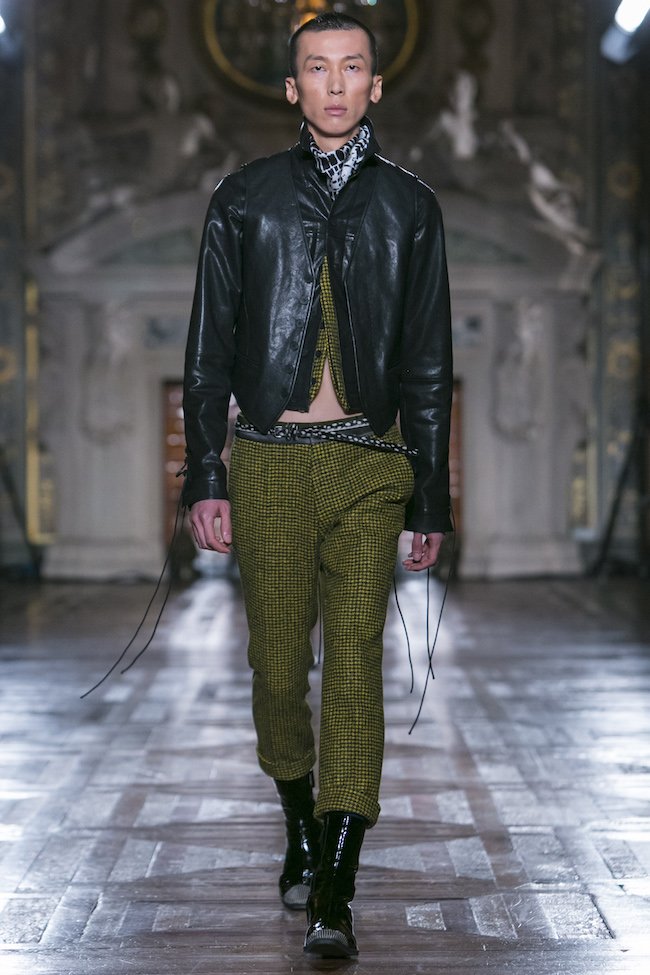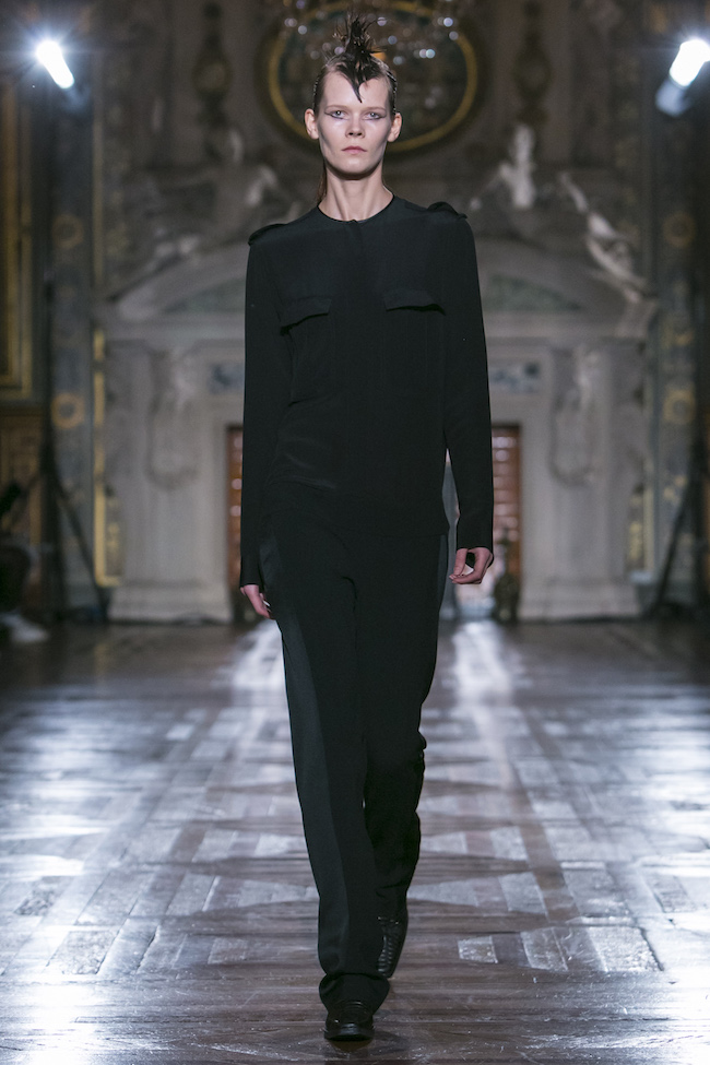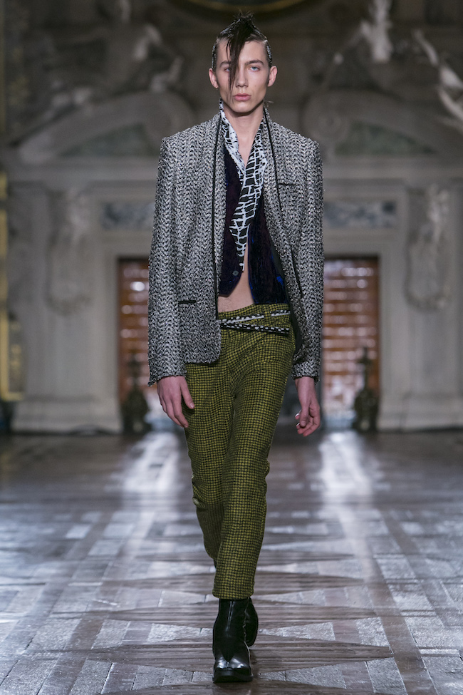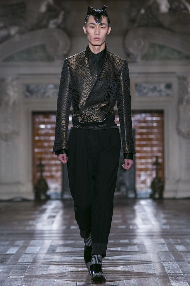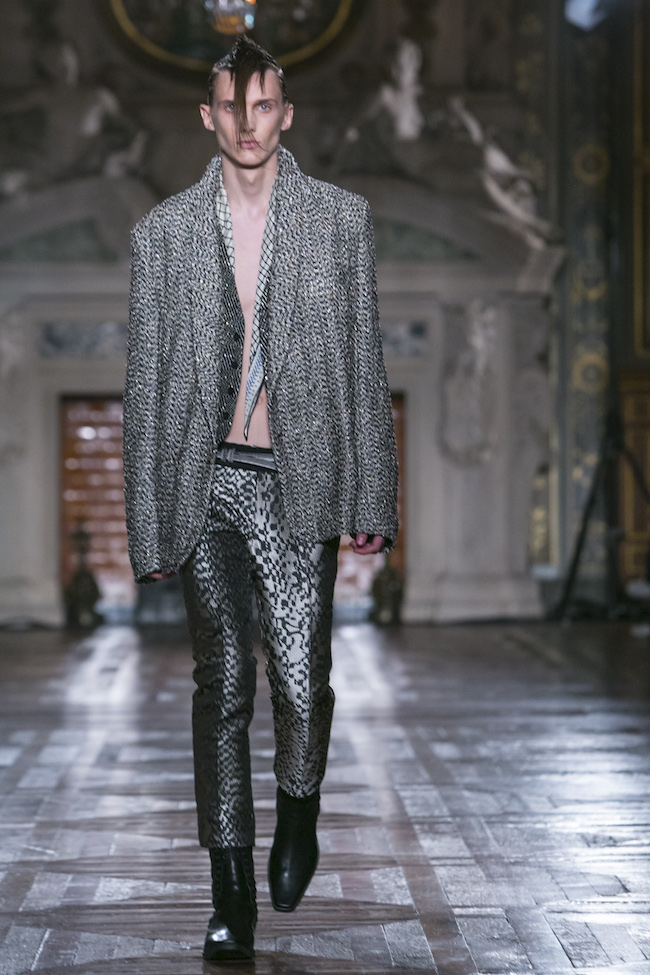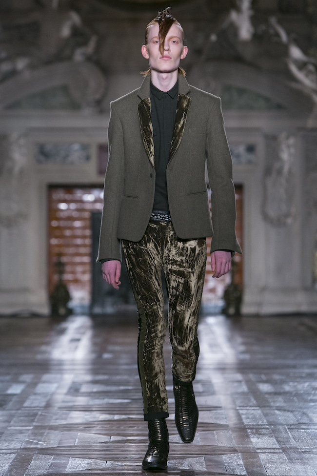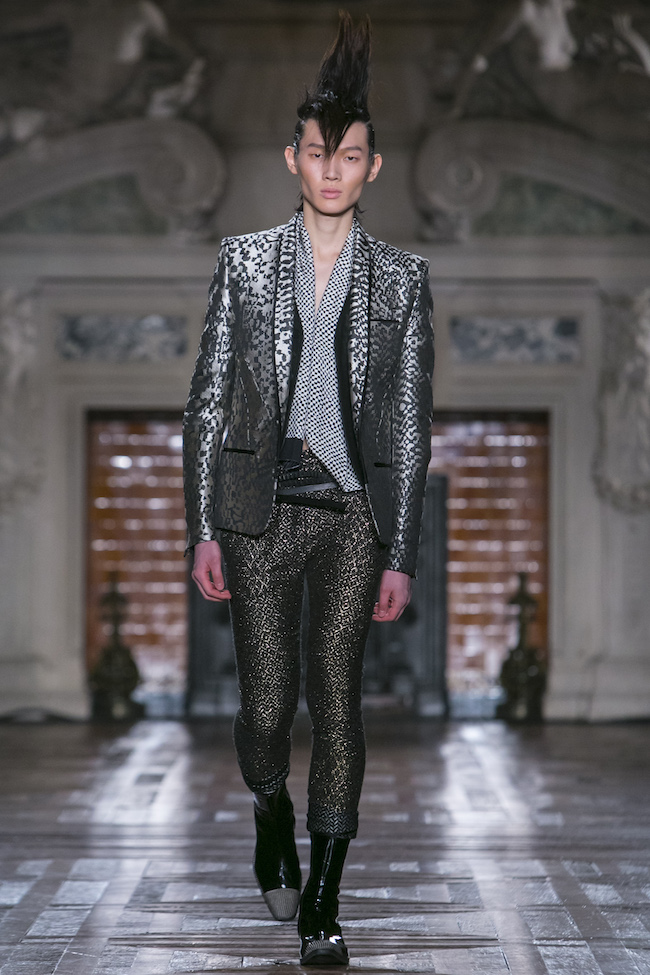 グリーズを撫で付けたモヒカンに、痩せこけた頬を強調するシャドー。いつになく病的なヘアメイクがデカダンなコレクションでは、Haider Ackermann が得意とするオリエンタルなディティールを融合させたレイヤールックを提案。ウォッシュ加工を施したベルベットや肉厚なウール、煌びやかなグリッターの輝きを放つジャカードなど、異なるテクスチャーのファブリックを巧みに組み合わせたコレクションは、”昔からよくある” スタイルを控えめに、それでいて力強くアップデートさせている。