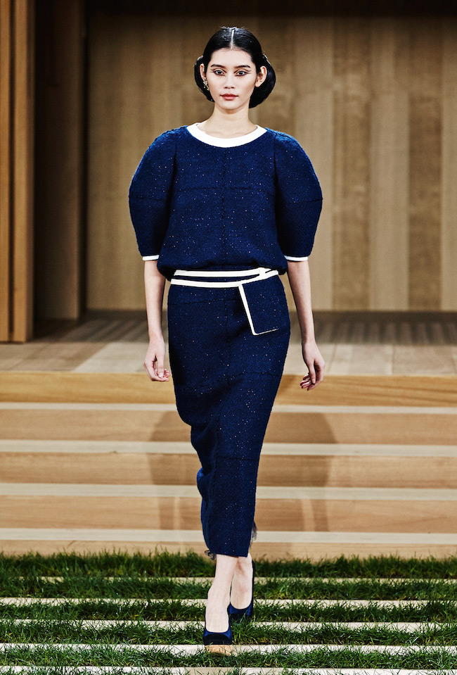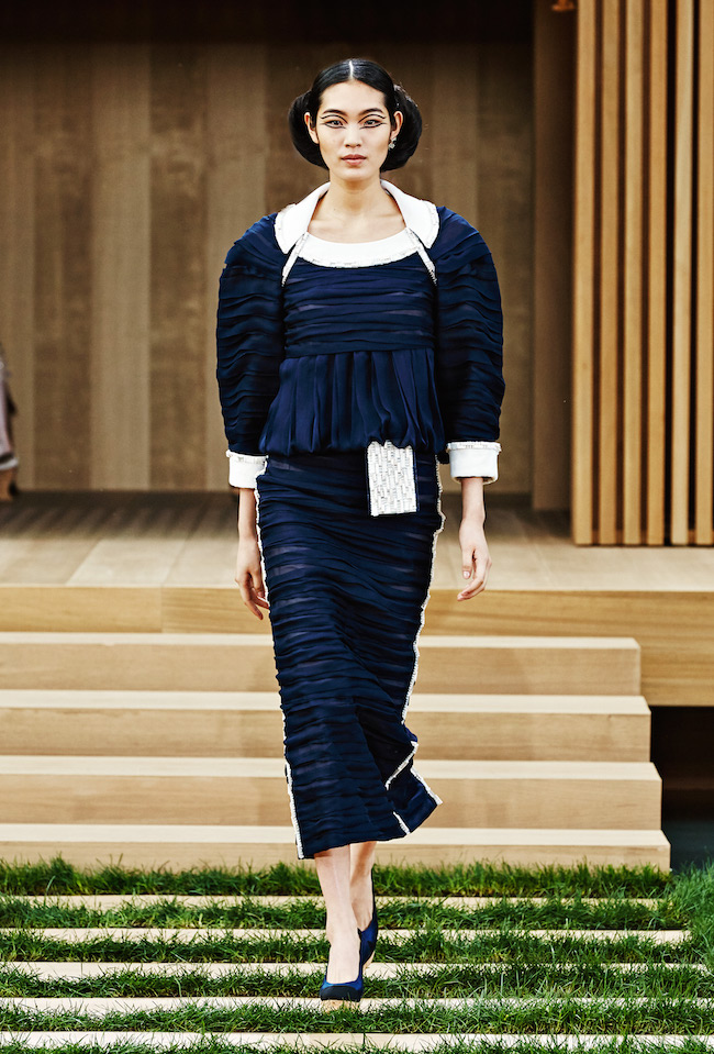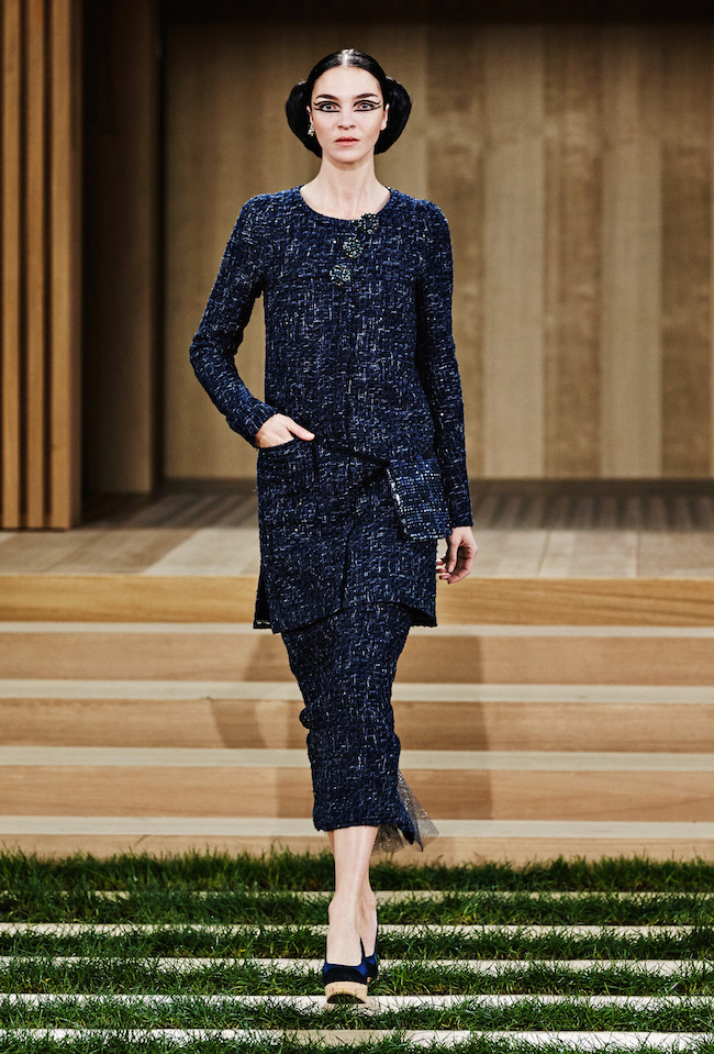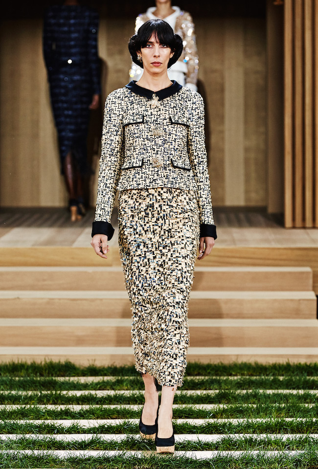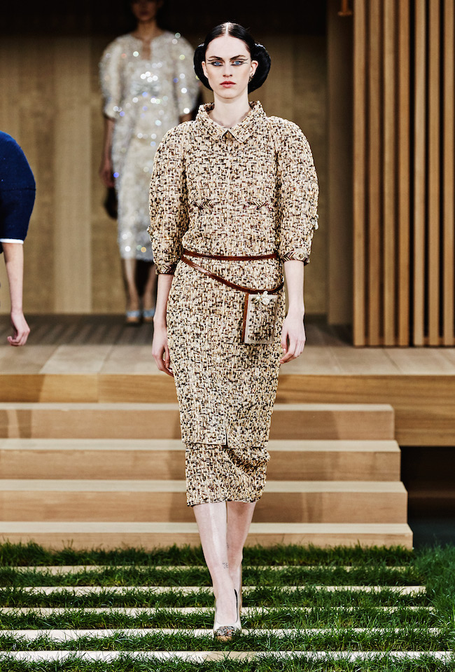「エコロジーファッションが声高に叫ばれる中、ラグジュアリーという文脈でこのテーマが表現されることがこれまで一度も無かった。」と語る Karl Lagerfeld。シルエットからスタートさせたというコレクションでは、オーバル型のスリーブラインやロング丈のペンシルスカートなど、ボリューム感のあるコントラストが際立つ。極め付けは圧巻のエンブロイダリーワーク。サテンのボウブラウスに合わせられたブラウンのパッチワークベストには、木材で作られた特注のビーズが全面にあしらわれている。足元を彩るのは、Massaro (マサロ) によるコルク製のバイカラーシューズ。通常オートクチュールで用いられるビーズやスパンコールとは異なり、控えめながら表情豊かなテクスチャーを存分に取り入れたコレクションは、いわゆる巷のエシカルファッションのイメージとは程遠い優美な佇まいを放っている。