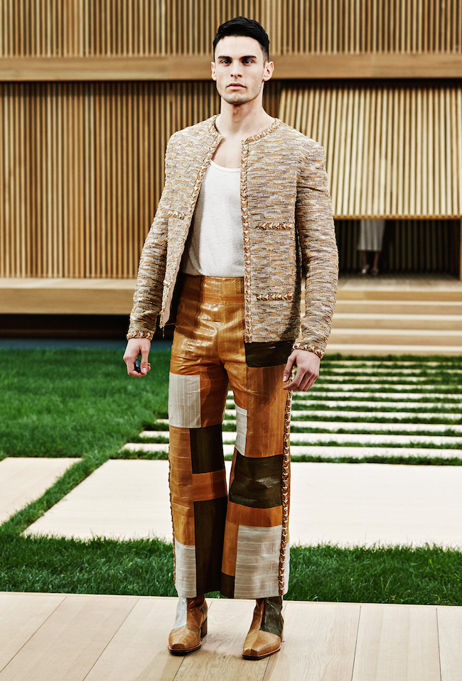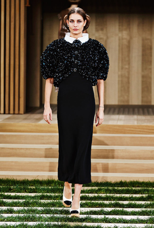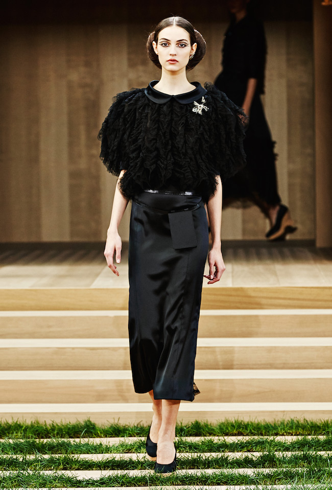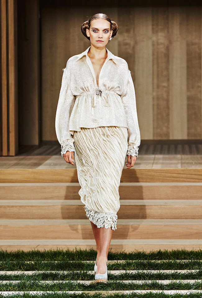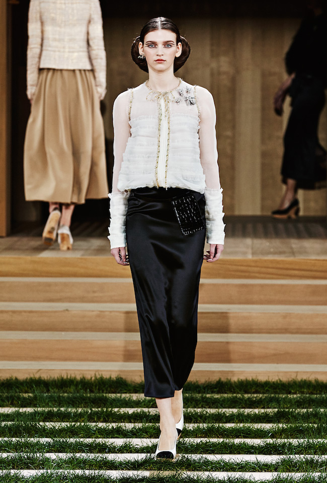 「エコロジーファッションが声高に叫ばれる中、ラグジュアリーという文脈でこのテーマが表現されることがこれまで一度も無かった。」と語る Karl Lagerfeld。シルエットからスタートさせたというコレクションでは、オーバル型のスリーブラインやロング丈のペンシルスカートなど、ボリューム感のあるコントラストが際立つ。極め付けは圧巻のエンブロイダリーワーク。サテンのボウブラウスに合わせられたブラウンのパッチワークベストには、木材で作られた特注のビーズが全面にあしらわれている。足元を彩るのは、Massaro (マサロ) によるコルク製のバイカラーシューズ。通常オートクチュールで用いられるビーズやスパンコールとは異なり、控えめながら表情豊かなテクスチャーを存分に取り入れたコレクションは、いわゆる巷のエシカルファッションのイメージとは程遠い優美な佇まいを放っている。