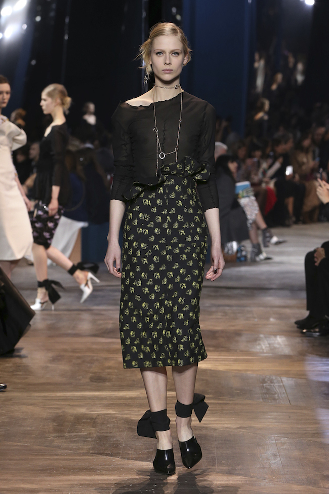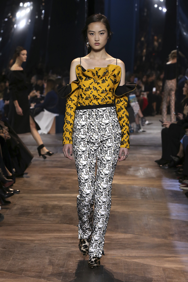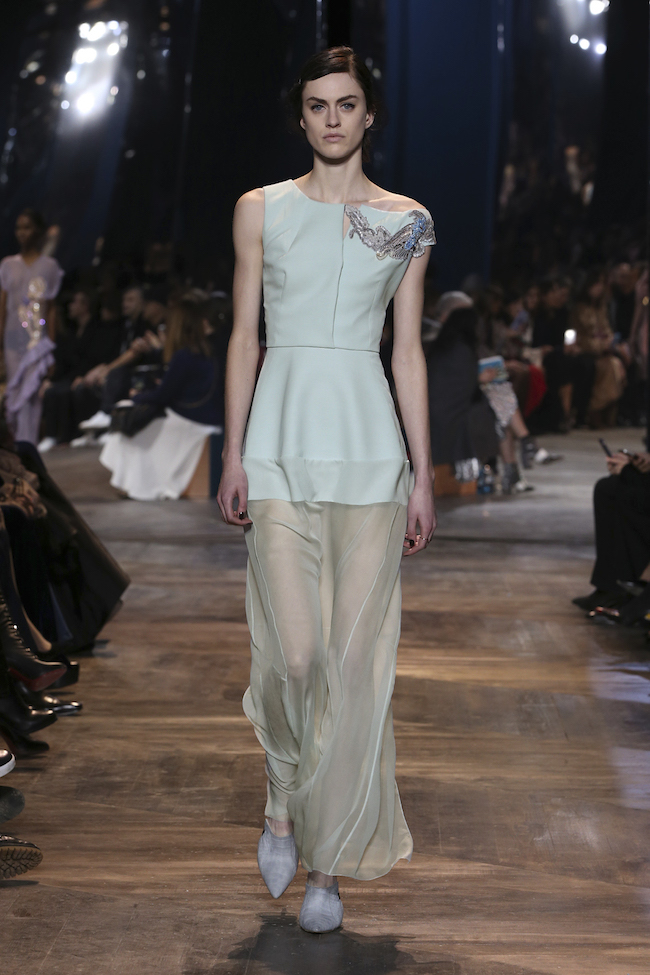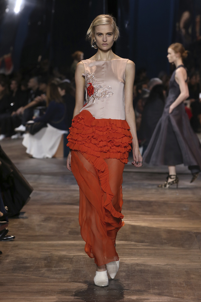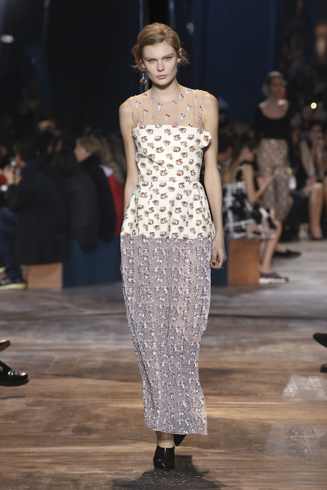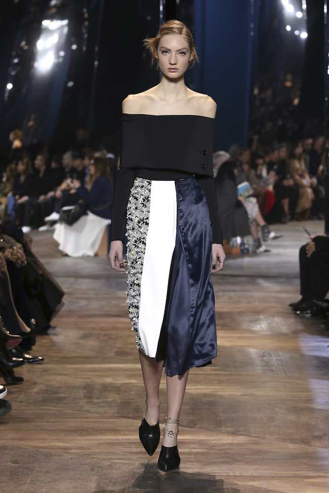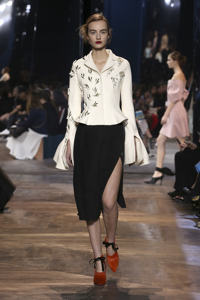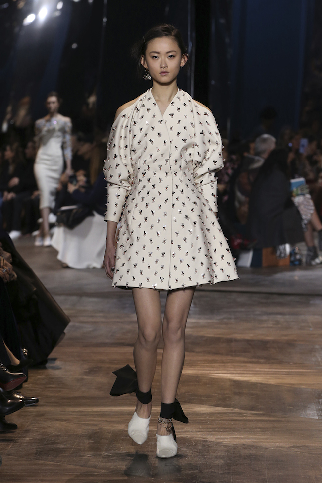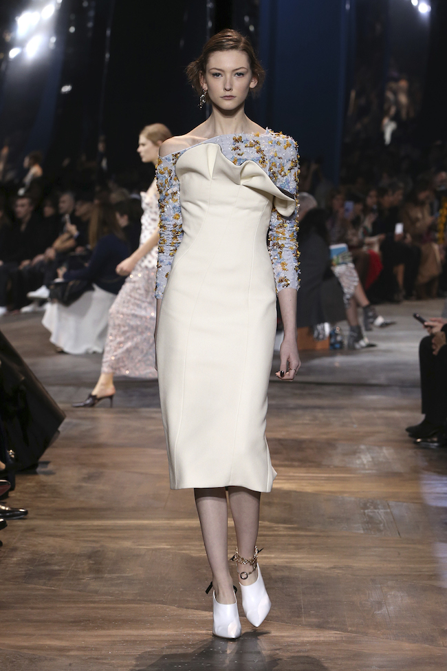 パリジェンヌの代名詞であるリラックスした自然な佇まいを表現したという今季コレクションの幕を切ったのは、エクリュのクレープ地を折り紙のように縫い合わせたボディと、エンブロイダリーをパネル状に繋ぎ合わせたスカートのアンサンブルだ。Raf Simons によるオートクチュールがシャープかつ構築的なフォルムを強く打ち出していたのに対し、今季コレクションではファーストルックに代表されるアンコンストラクテッドなシルエットが目を引く。