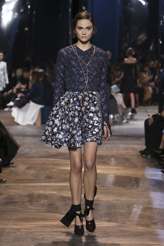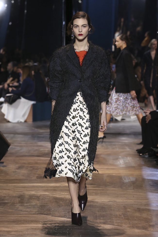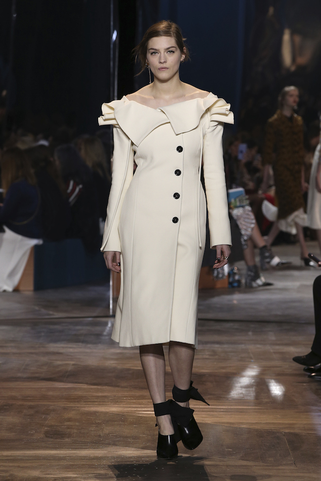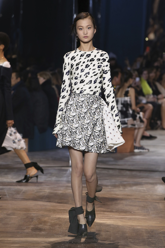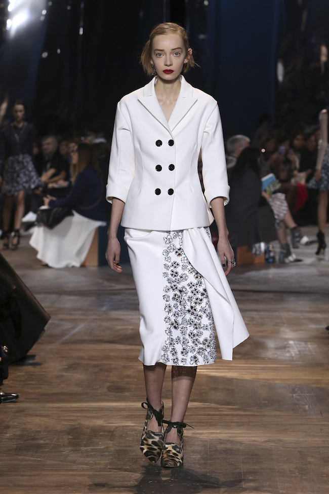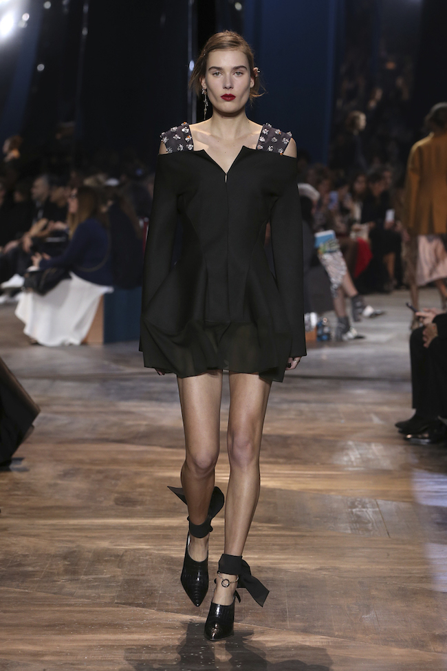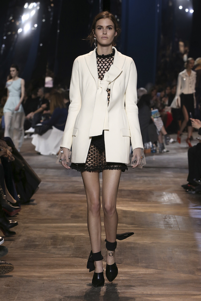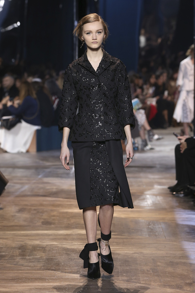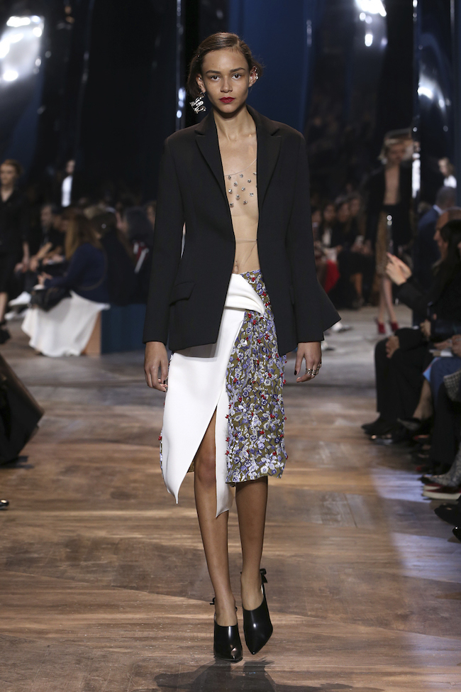 パリジェンヌの代名詞であるリラックスした自然な佇まいを表現したという今季コレクションの幕を切ったのは、エクリュのクレープ地を折り紙のように縫い合わせたボディと、エンブロイダリーをパネル状に繋ぎ合わせたスカートのアンサンブルだ。Raf Simons によるオートクチュールがシャープかつ構築的なフォルムを強く打ち出していたのに対し、今季コレクションではファーストルックに代表されるアンコンストラクテッドなシルエットが目を引く。