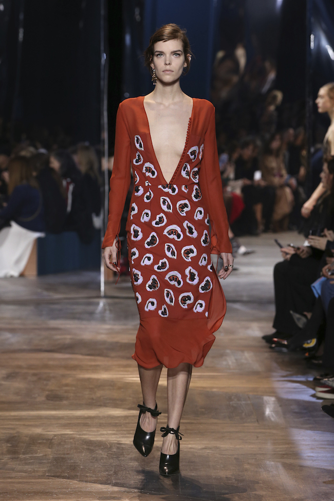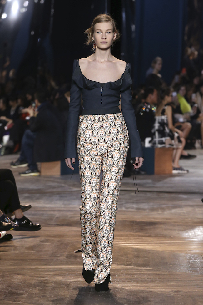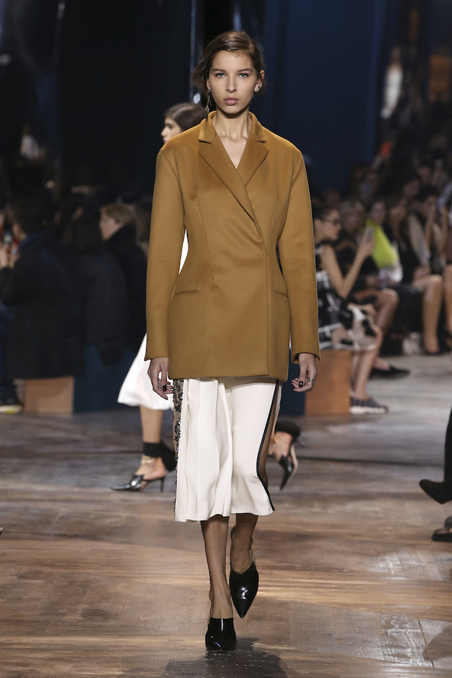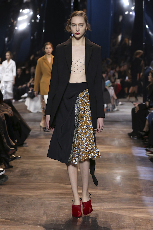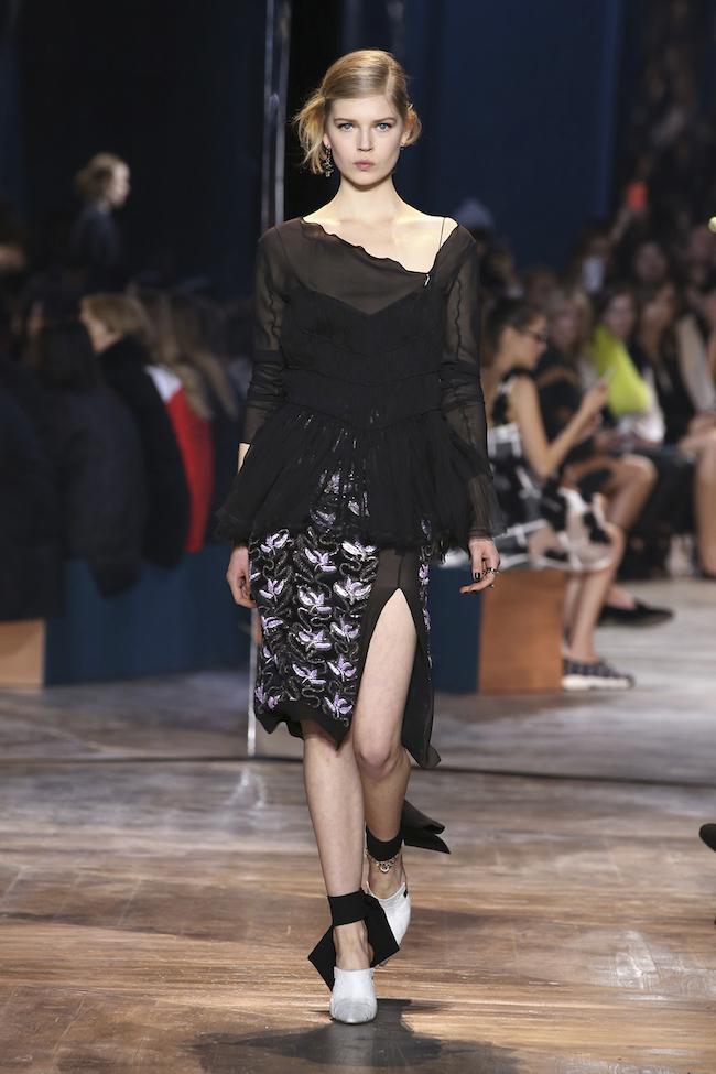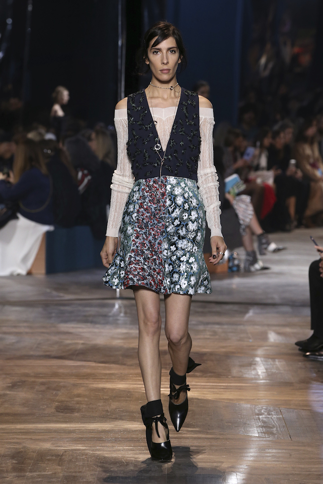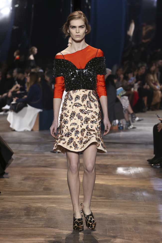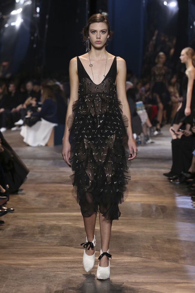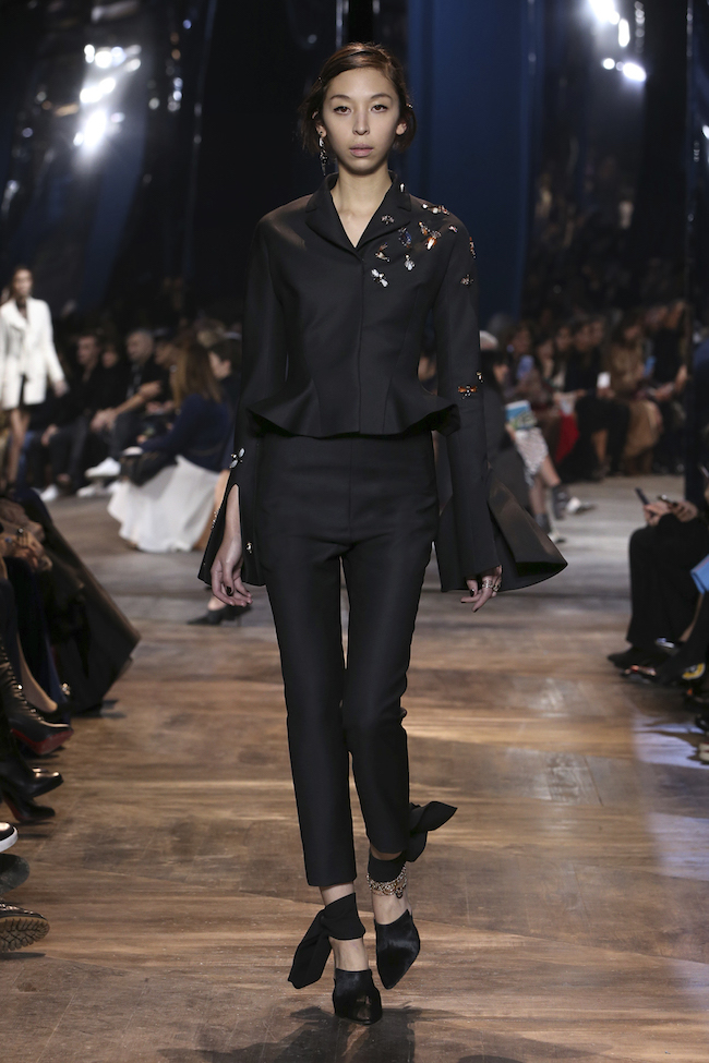 パリジェンヌの代名詞であるリラックスした自然な佇まいを表現したという今季コレクションの幕を切ったのは、エクリュのクレープ地を折り紙のように縫い合わせたボディと、エンブロイダリーをパネル状に繋ぎ合わせたスカートのアンサンブルだ。Raf Simons によるオートクチュールがシャープかつ構築的なフォルムを強く打ち出していたのに対し、今季コレクションではファーストルックに代表されるアンコンストラクテッドなシルエットが目を引く。