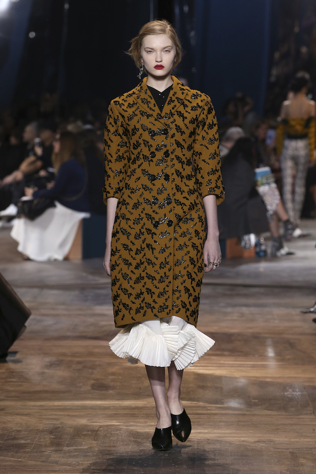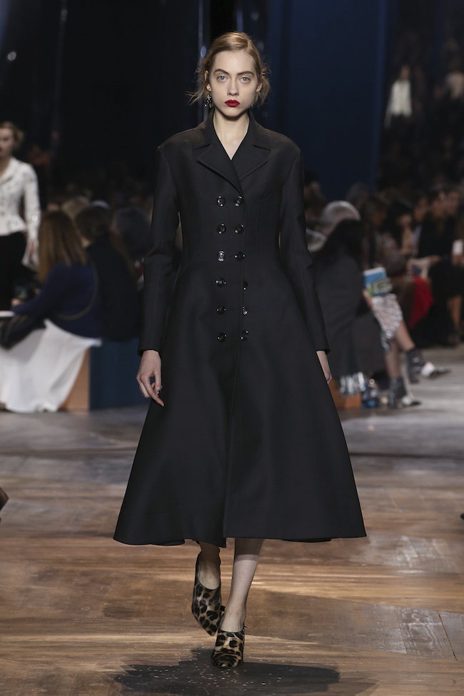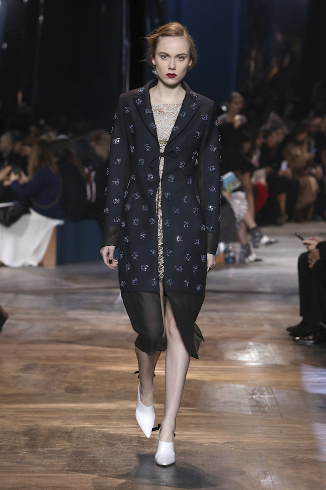 アンコンストラクテッドとは言うものの、その裏には想像を絶する計算と緻密な作業が隠されていることは想像に難くない。実際、わざと片側の肩をずらして着用したようなアシンメトリーなシルクコットンのドレスや、カーキのウールで仕立てられた「バー」コートとエンブロイダリーのトップスをレイヤーしたルックは、ウエストからバストにかけて緩やかかつ正確にボディラインを際立たせており、Dior というメゾンが長い歴史の中でいかにシルエットに対する確固たる美学を確立してきたかが伺える。