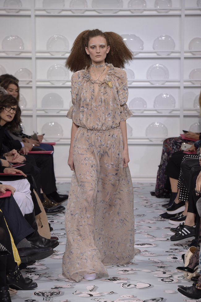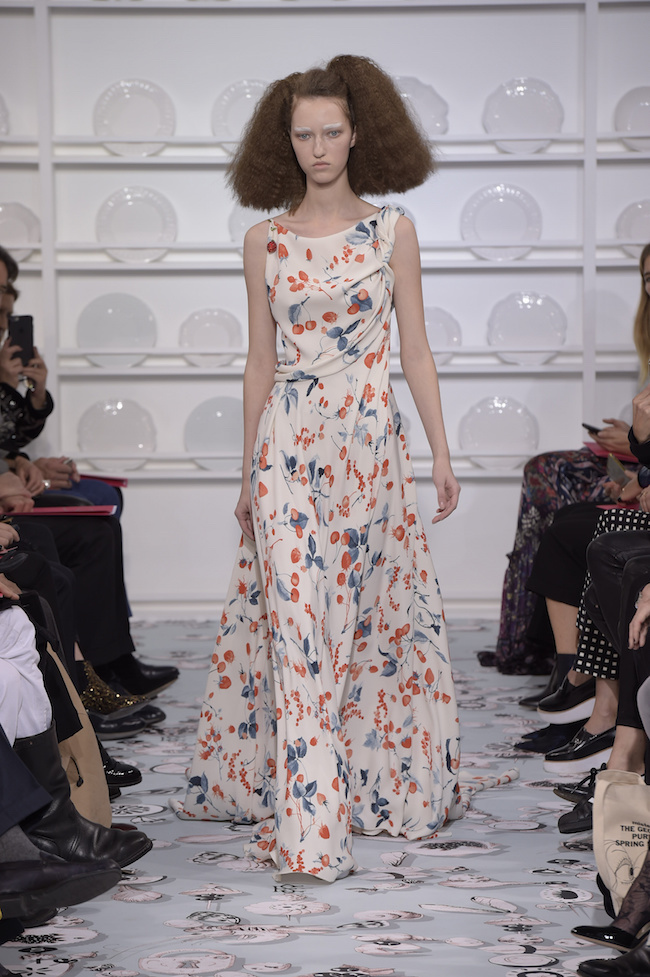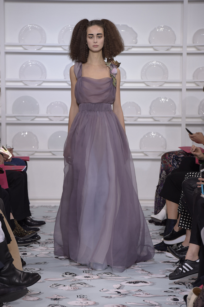 なんだかこれでいいのか、と疑問に思うほど単純で陳腐に見えるコレクションだが、見続けているうちどこか説得力すら感じてくる。ボーンチャイナのような質感を忠実に表現した3Dプリントのエンブロイダリーはオートクチュールならではの精巧なディティールが目を引く上、バスト部分だけがヌードカラーのシアーな素材で切り替えたエンパイアドレスに至っては片側の胸にだけチェリーのチャームを縫い付けてるときた。きっと Elsa Schiaparelli 自身も、Dalí や Louise Bourgeois (ルイーズ・ブルジョワ) とワインを嗜みながら半分おふざけ、半分真剣でこうしたアイデアを思いついていたのではないだろうか。