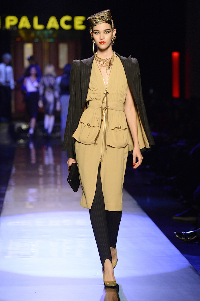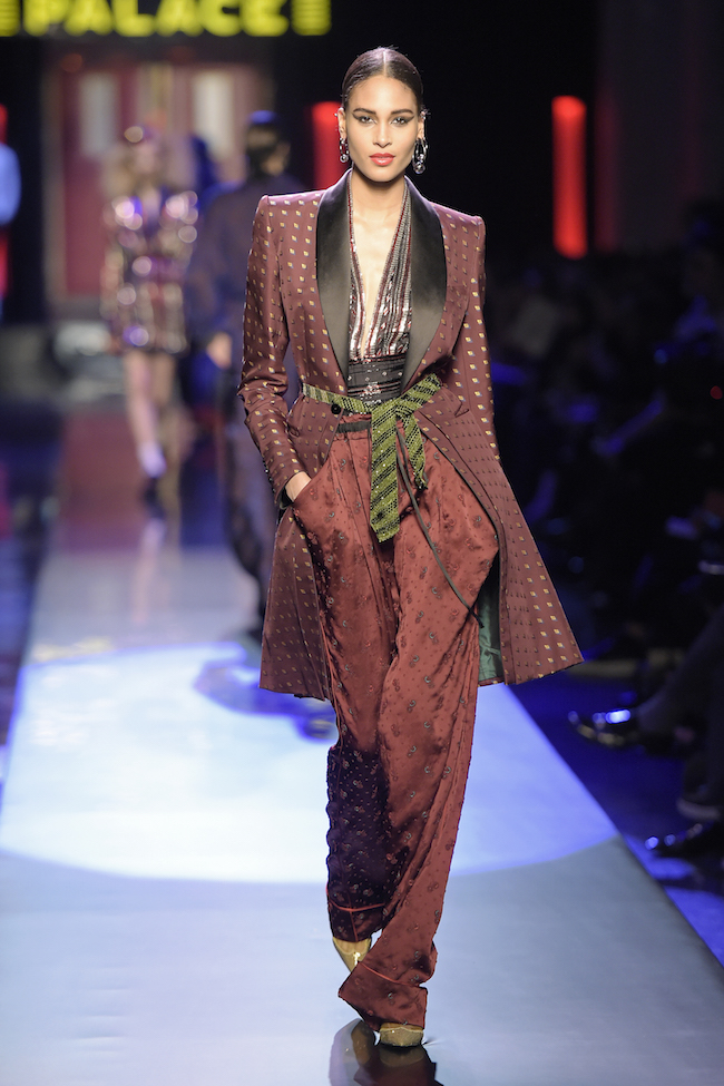 時代を早送りして、現代へと目を向けてみよう。1月27日にパリにて Jean Paul Gaultier (ジャン=ポール・ゴルチェ) による2016年春夏オートクチュールコレクションが発表された。2014年の9月にプレタポルテを撤退し、オートクチュール撤退を表明した同メゾン。フランス人ならではのウィットに富んだ洋服を店頭で買えなくなってしまったのは残念だが、彼の生み出す絢爛豪華なドレスはオートクチュールコレクションで健在だ。Le Palace をテーマにした今季のコレクションでは、当時のものと見紛うとうなキャバレーのステージを会場に再現。スポットライトが当たるランウェイでは、スパンコールのパジャマスーツ、刺繍でピンストライプを表現したボディコンシャスなパンツスール、ランジェリーガウン、ビーズ刺繍を施したレオパードジャケットなど、ポップアイコンのオマージュを思わせるグラマラスなルックが登場。フィナーレで登場した Anna Cleveland (アンナ・クリーヴランド) がサテンジャージーのマントを翻す姿は、彼女の実の母親であり70年代のトップモデル Pat Cleveland (パット・クリーヴランド) の全盛期をオーバーラップさせた。