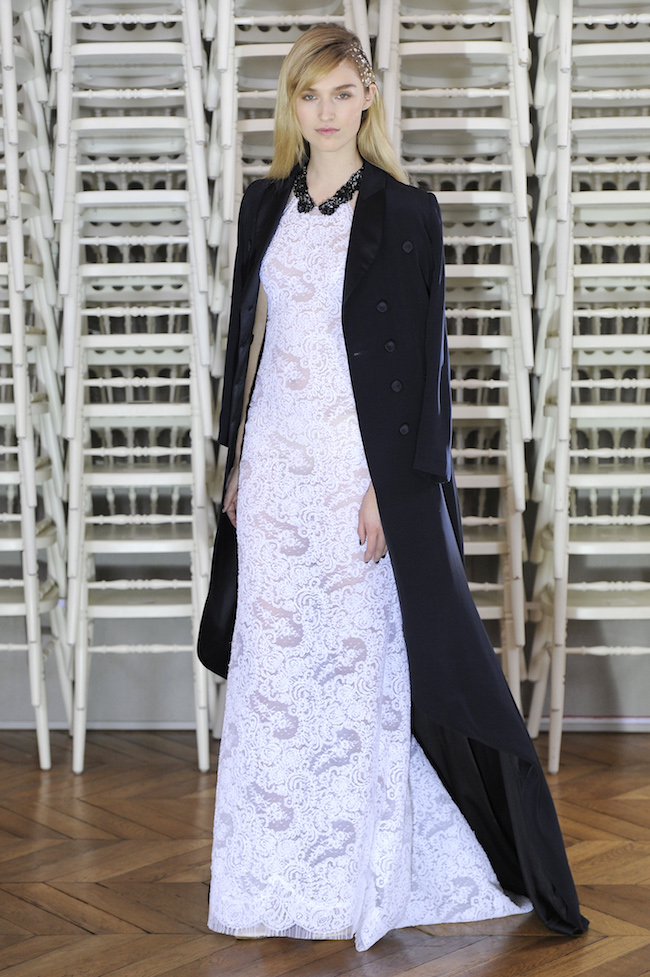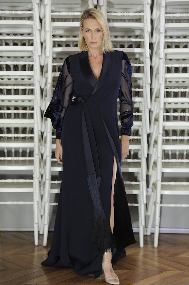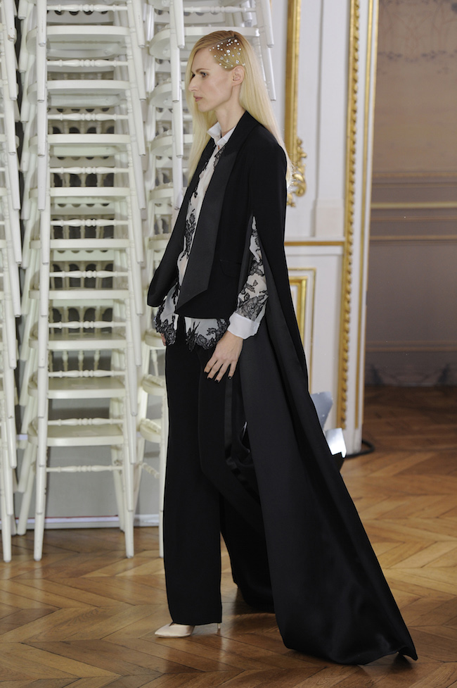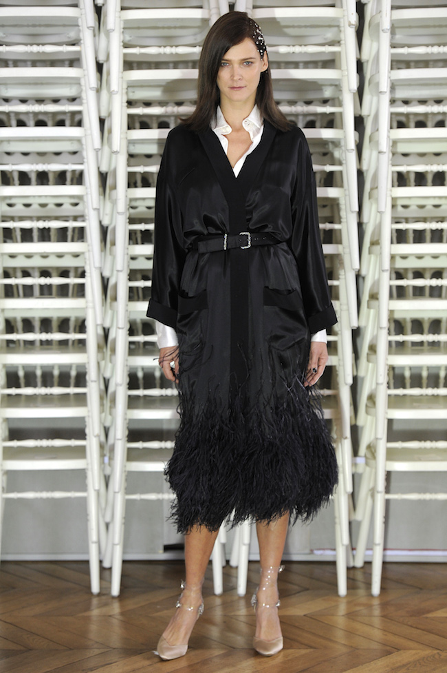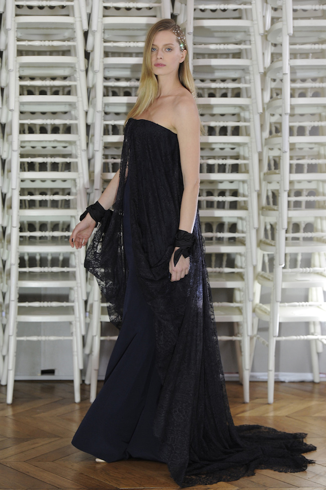 ショーのファーストルックで登場したのは、Carmen Kass (カルメン・カース)。スムースなクレープ地で仕立てられたダブルのスモーキングジャケットには、対照的にグラマラスなアウトラインを描くオーストリッチファーのスカートが合わせられている。続いて登場した Audrey Marnay (オードリー・マルネイ) は、ギピュールレースのカラーが付けられたセンシュアルなレースのリトル・ブラック・ドレスを着用。一方でデコルテラインを強調したアワーグラスシルエットのブラックドレスは、Georgina Stojiljković (ジョルジーナ・ストジルコヴィッチ) の妖艶な美しさによってまるで絵画の中から飛び出してきたような時代を超越したエレガンスを湛えている。
