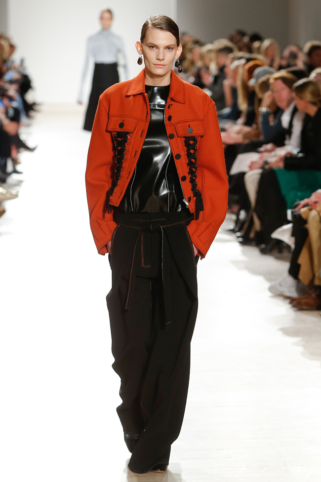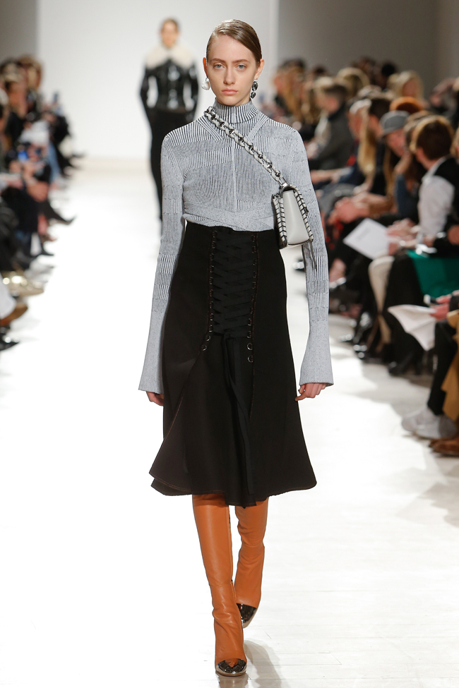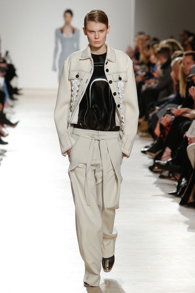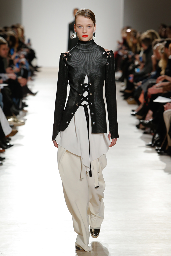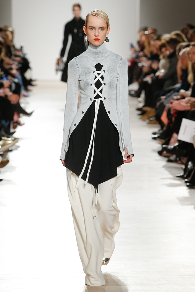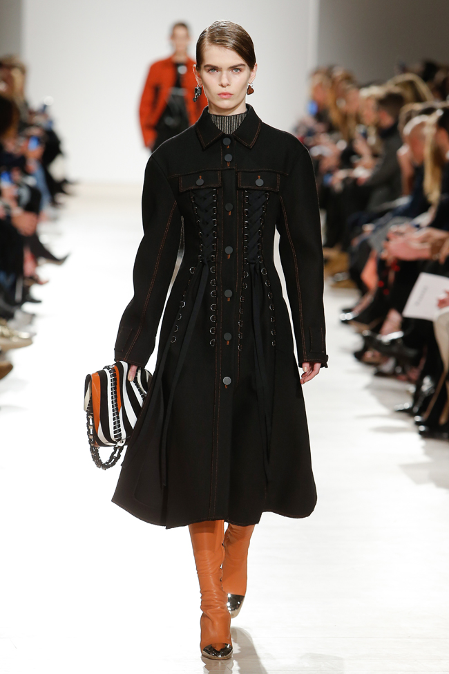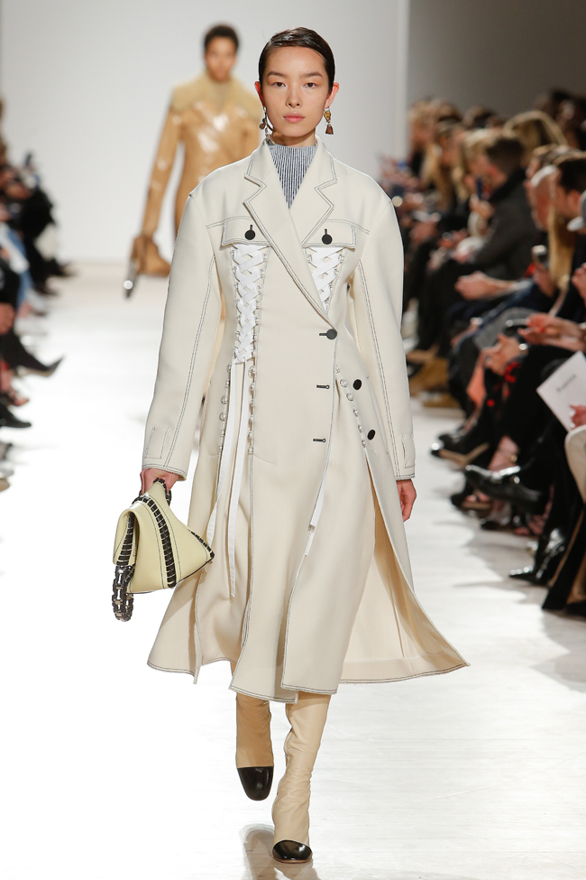 ちなみに Jack McCollough (ジャック・マッコロー) と Lazaro Hernandez (ラザロ・ヘルナンデス) にとってのベーシックとは、シャープなシルエットをディティールで敢えて脱構築的に仕上げたテーラリングであり、またタイトな上半身とバギー、もしくはフレアのボトムが醸し出す絶妙なバランス感であり、そしてシンプルであるにも関わらずどうしようもなくユニークでスタイリッシュなアクセサリーを意味する。そして今季秋冬のランウェイでは、これらベーシックなスタイルに、先シーズン2016年春夏コレクションでも登場したレースアップディティールも絶妙なアクセントとして取り入れられている。