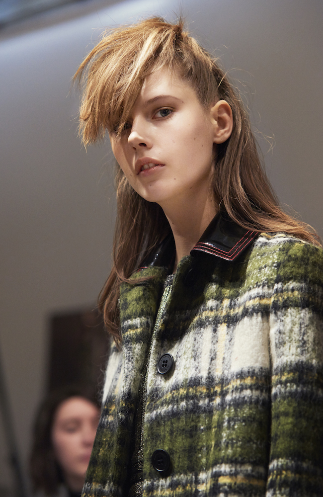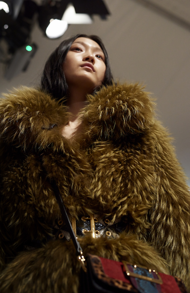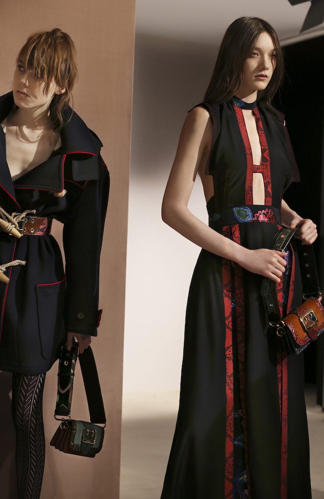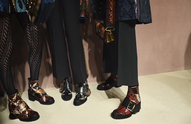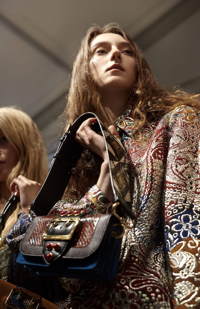 Christopher Bailey (クリストファー・ベイリー) による Burberry (バーバリー) 2016年フェブラリーコレクションから、バックステージ写真が到着。ブルームズベリーやグラムロック、パンクなど様々なイギリスのカルチャーをパッチワークのように大胆に組み合わせた今季 Burberry。中でも目を引くのは、異なる風合いのエキゾチックレザーを繋ぎ合わせた大きなバックルのコンバットブーツや、同じく大きなハードウェアが特徴的な「バックルバッグ」。またメイクにおいては、素肌のような質感が抜け感を演出する一方で、煌めくスパンコールをまばらに乗せることでまるで一晩中夜遊びを楽しんだ後のような自由で奔放な女性像を浮き彫りにした。