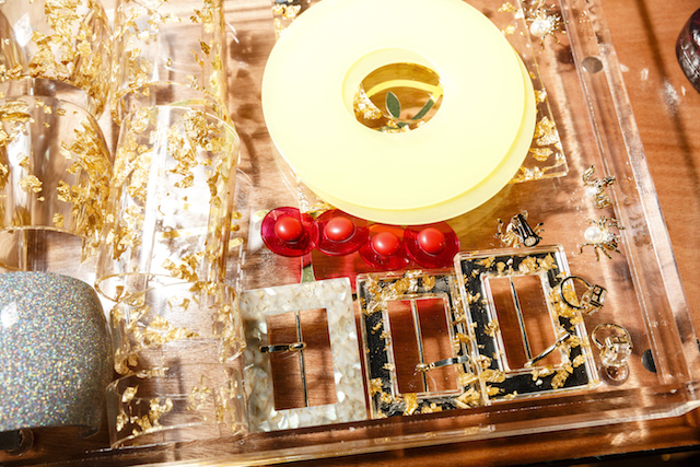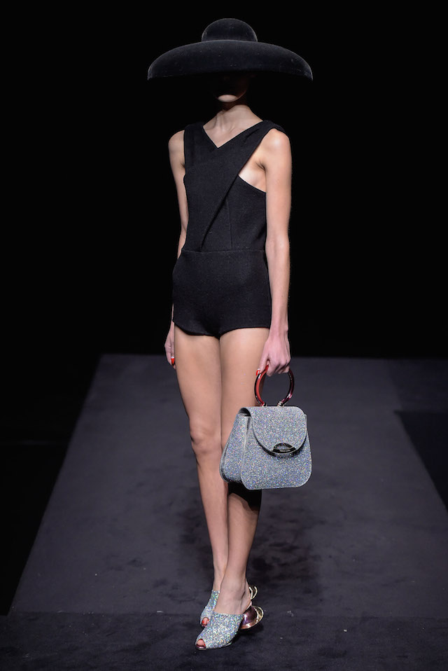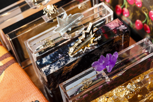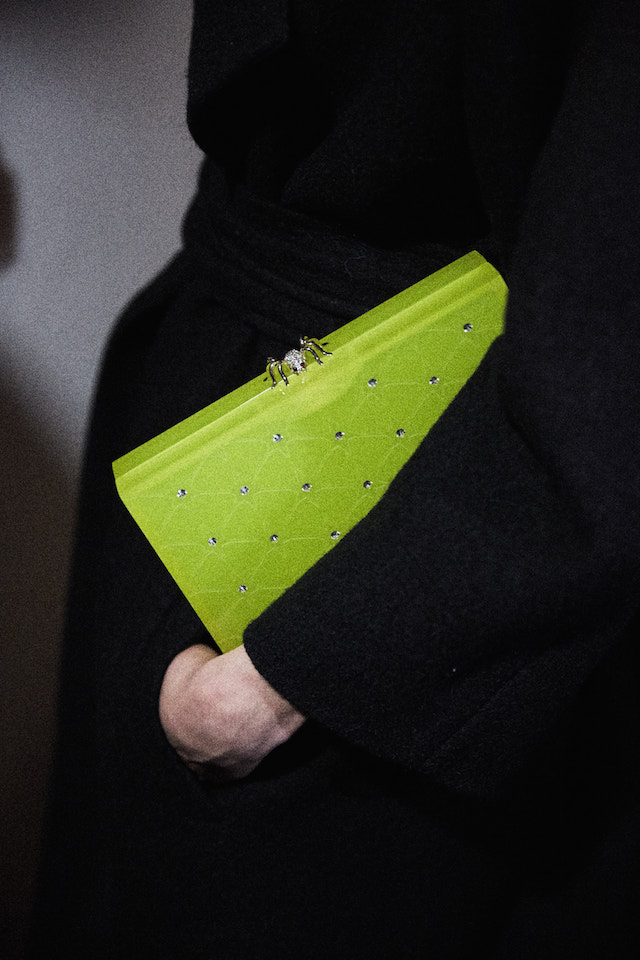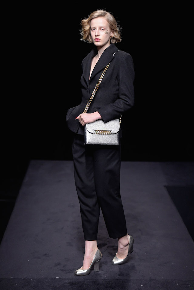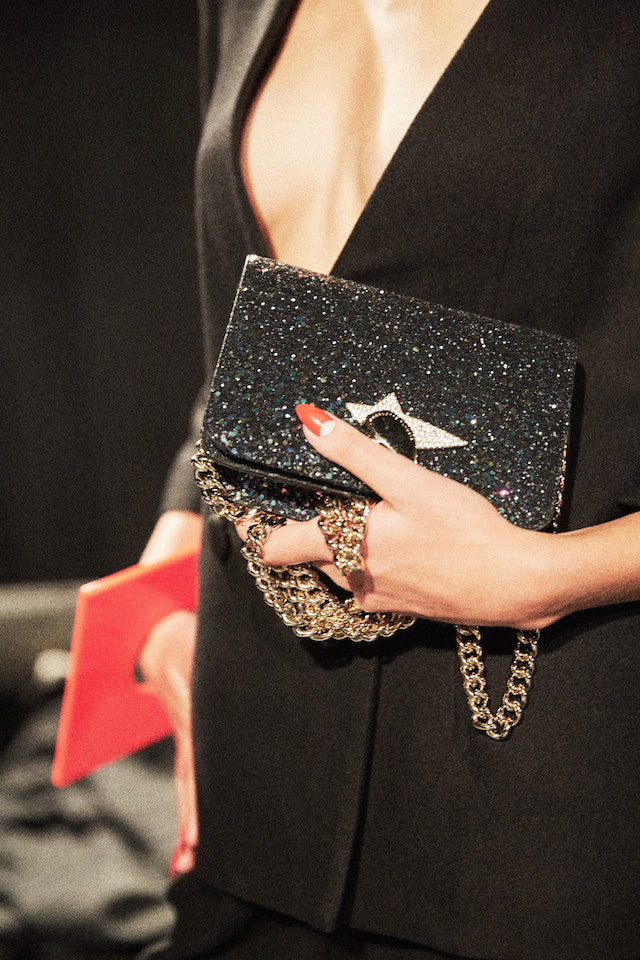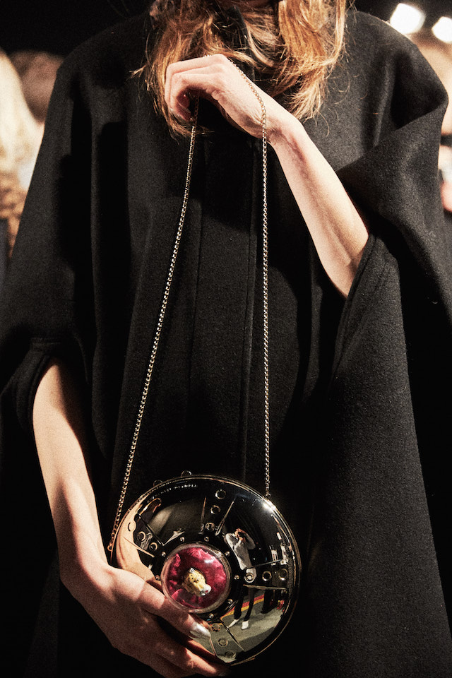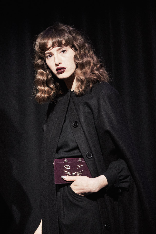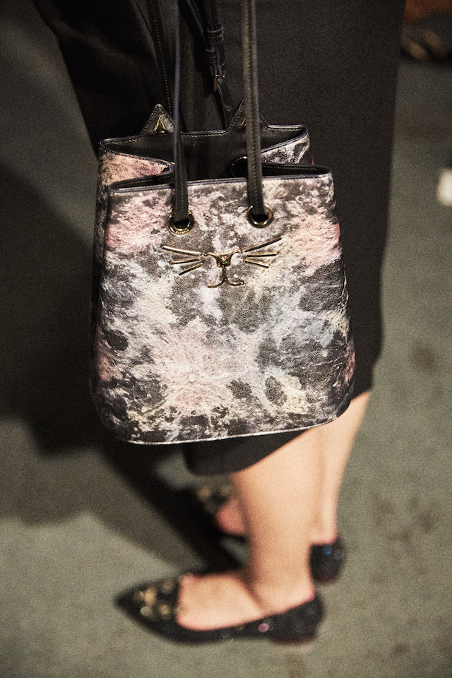 煌めくグリッターのプラットフォーム、カーヴィーなスカルプチュアヒールのメタリックパンプス、何連にも巻きつくベルト装飾がフェティッシュなシルバーシェードのキトゥンヒールパンプスなど、Charlotte Olympia 節炸裂のインパクトシューズもさることながら、注目すべきは豊富なバッグのバリエーション。パーティーで一目置かれること間違い無しのミノディエール (小さなコスメバッグ) は今回、円盤のようなユニークなフォルムで登場しているほか、デイリー使いにもぴったりなスクエアトートもレオパードレザーからベルベット、メタリックレザーなど様々なマテリアルで展開されている。