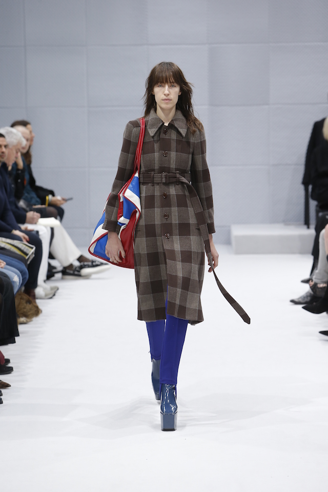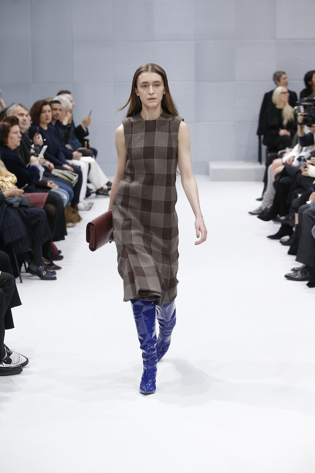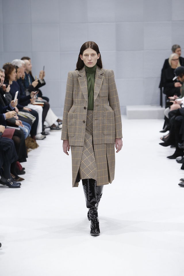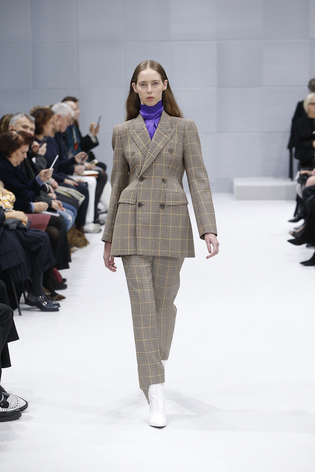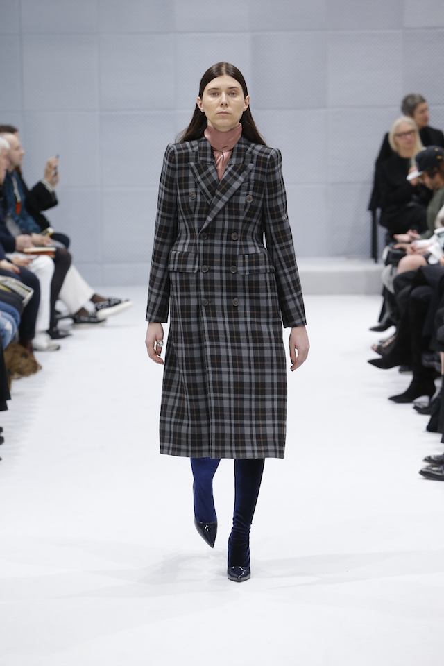 無機質な機械音が一定のペースで鳴り響く中、ファーストルックで登場したのはグレーのセットアップ。着用するのは Vetements 2016-17年秋冬のフィナーレでウィンドブレーカーを着て登場したモデルだ。続いて登場したのは、これまた装飾の類を一切排除したプリーツスカートとトラウザーをレイヤーしたセットアップ。タータンチェック、グレンチェックなどトラディショナルなセットアップがいくつか続いた後、鮮烈なブルーのジャケットによってその沈黙は破られる。