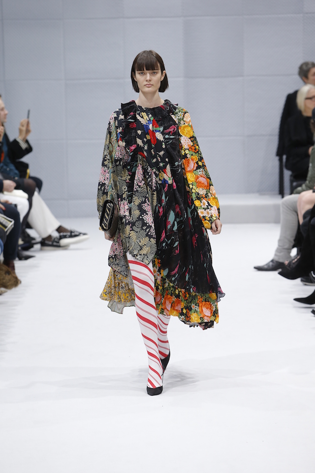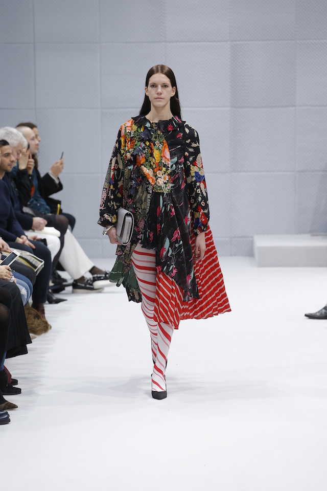 ジップを半分開け、後ろにずらして着用したかのような捻りの効いたジャケット。ワードローブ、アクセサリー共に徐々にエッジが研ぎ澄まされていく中盤には、パッディングによって往年のコクーンシルエットを再現したジャケットやスーパーオーバーサイズのシャツとプラットフォームシューズのスタイリングが登場。終盤には、いくつものフローラルパターンを大胆に組み合わせたイブニングルックが華やかさを添えている。