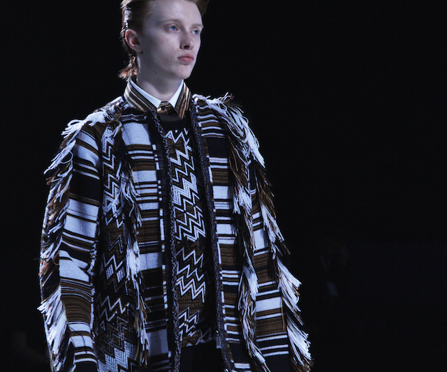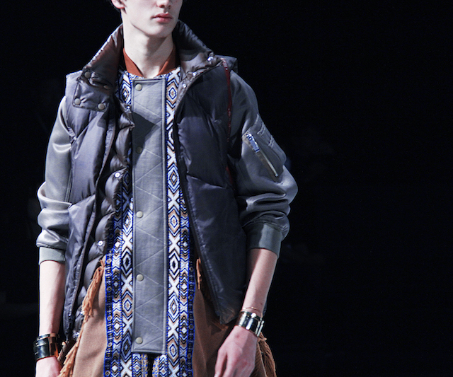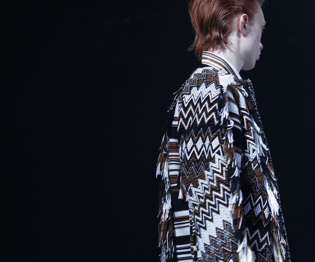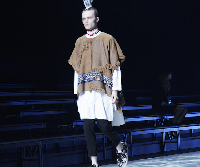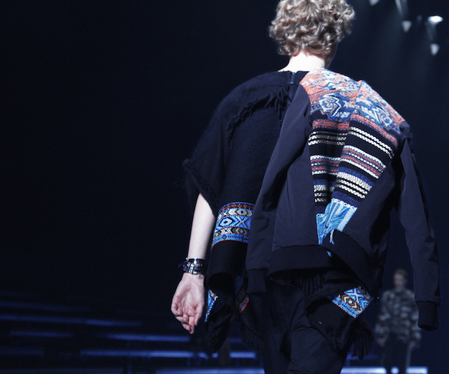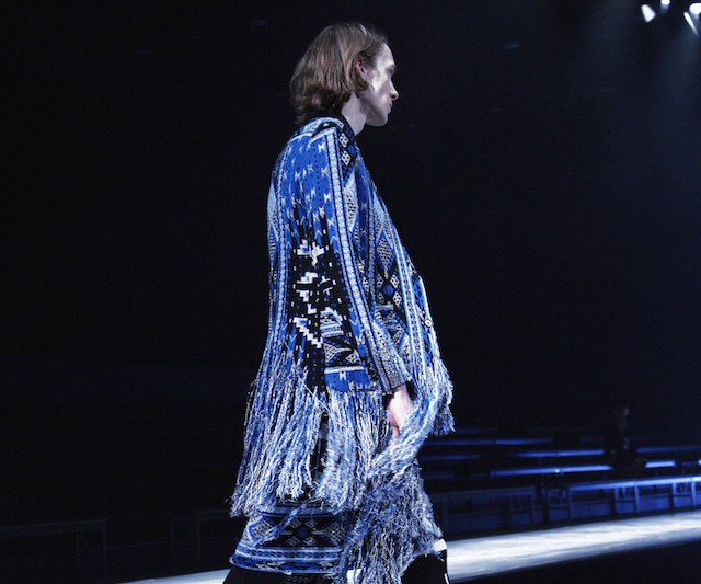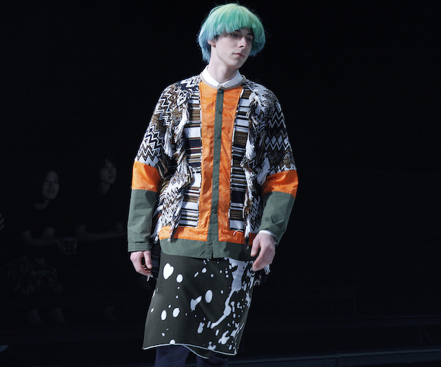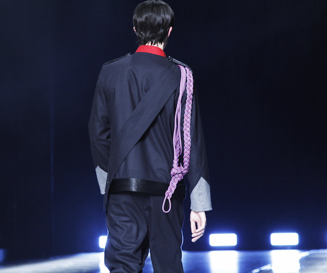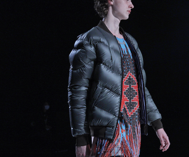 そんな久保の口から、今季2016-17年秋冬コレクションのランウェイショー後のインタビューで「何か新しいこと」という言葉が聞けたのは大きな収穫だ。日本のジュエリーブランド HEAVY & Co. blacksmith (ヘヴィー&コー ブラック・スミス) とのコラボによって発表された今回のコレクションでは、ブランドのアイデンティティであるハイブリッドなストリートウェアをベースに、ジュエリー感覚のレースアップディティールや、グラマラスなフリンジが新鮮な印象を与えている。また「より洋服にフォーカスを置いたコレクションにしたかった」という言葉通り、リハーサルで登場したカラフルなウィッグは本番では出番が無かったことも言及しておこう。異国情緒溢れるフリンジケープ、MA-1 を変形させたようなツイードジャケット、そしてこれまたこれまであまり yoshio kubo のランウェイでは見かけなかったワイドレッグのトラウザーなど、「いつもの定番」から「新たなフェイバリット」まで巧みに操った今季コレクションは、久々に MBFWT にフレッシュなエネルギーをもたらした。