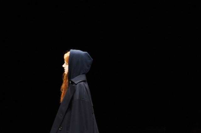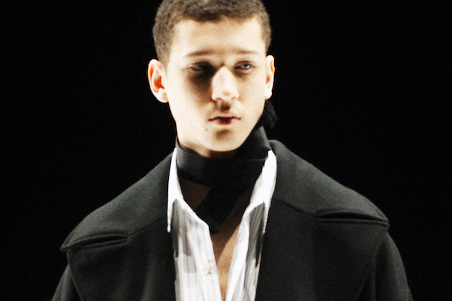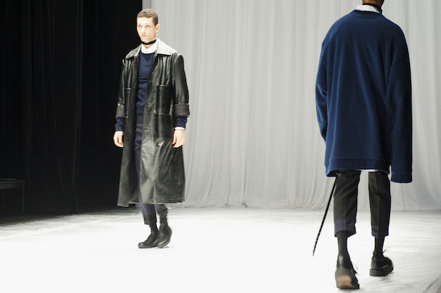 まずファーストルックで登場したのはバストライとヘムにかけてレースの切り替えが施されたスリップドレス。足元は同ブランドには珍しくヒールのサイハイブーツが合わせられている。これまで継続的に打ち出されてきたクリーンでミニマル、都会的なスタイルに、ドキッとするようなセンシュアリティを意識的に重ね合わせた、ということだろうか。セカンドルックでは同じくレースのドレスに、ダランと伸ばされたニットのアームウォーマーが合わせられている。その後登場するオーバーサイズのレイヤードや、奇妙なパッチワークを施したスウェットのプルオーバーなど、今回のスタイリングでは Raf Simons (ラフ・シモンズ) の Olivier Rizzo (オリヴィエ・リッゾ) や Vetements (ヴェトモン) の Lotta Volkova (ロッタ・ヴォルコヴァ) に見る ミックス&マッチの妙に強く影響を受けていることが伺える。一方で、やはり一際目を引くのは端正な仕立てのアウターだ。中でも終盤で登場したキャメルやグレーのコートは、スーパービッグシルエットであるにも関わらず洗練されたテーラリングが冴え渡っている。