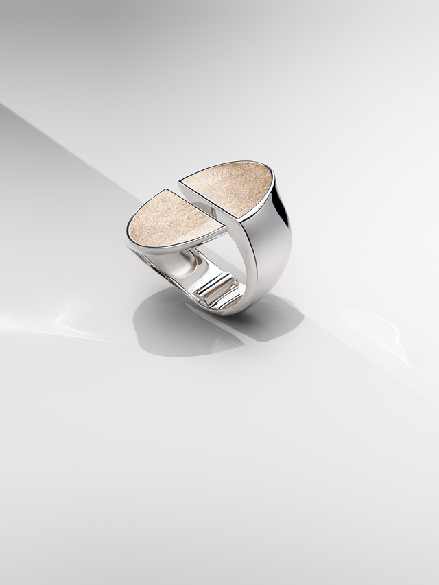 全国の Hermès ブティックにて開催される「Ecrin d’Argent (エクラン・ダルジャン)」では、同じく Pierre Hardy による空間構成のもと、エクセプショナルコレクションが集結。フランス語で「銀の宝箱」を意味する名前の如く、ユニークな作品と、大理石を基調にした彫刻的な空間が呼応するアーティスティックな世界観が作り上げられている。