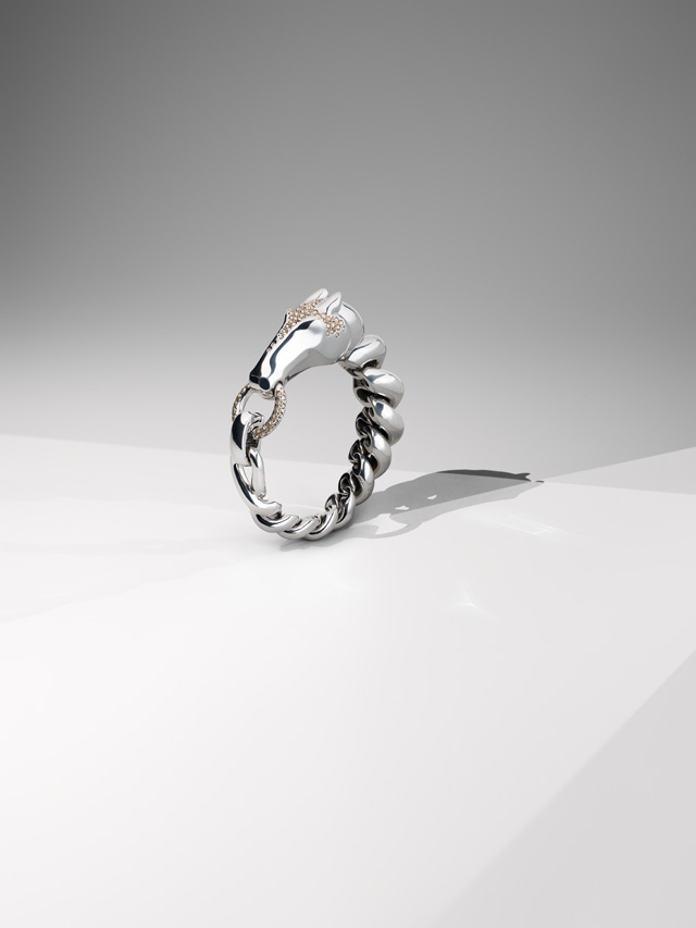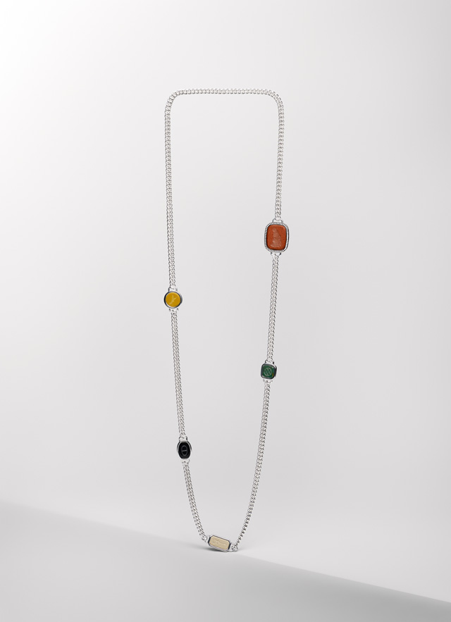 シルバーを、ゴールドにも劣らない貴重な素材として考える Hermès ならではのエクセプショナルコレクションでは、ジャスパーやオニキスなどの鉱石に、「インタリオ」と呼ばれる沈み彫りを施したものなど、独創性あふれるクリエイションが披露されている。