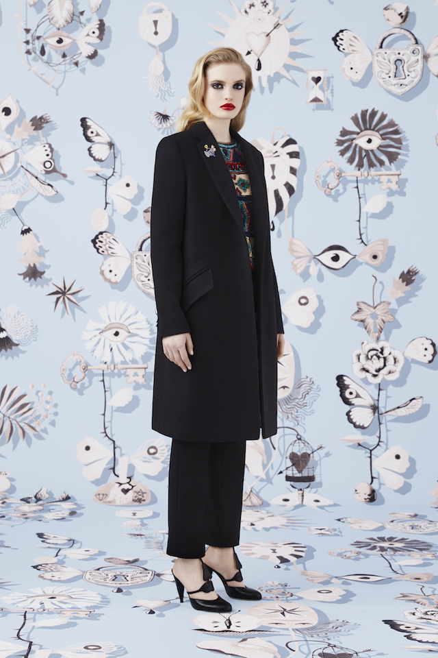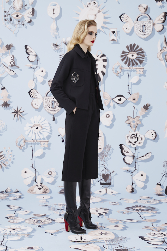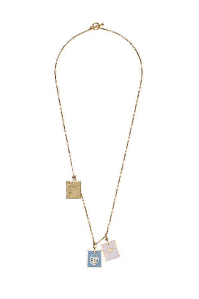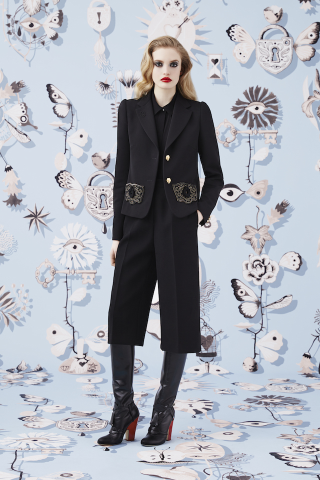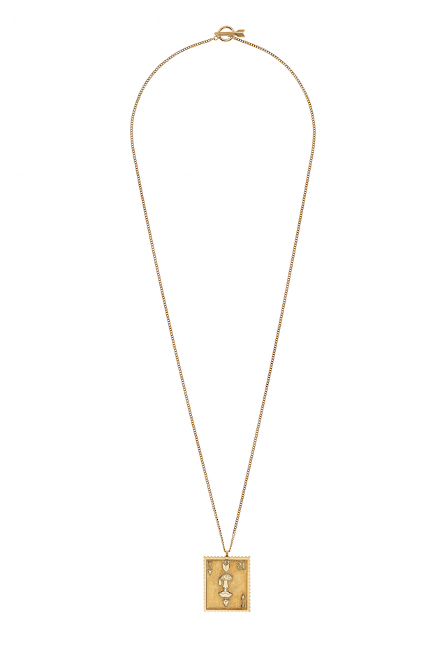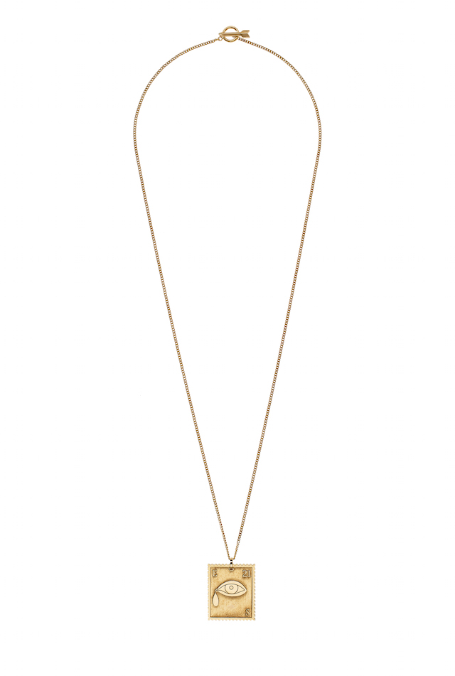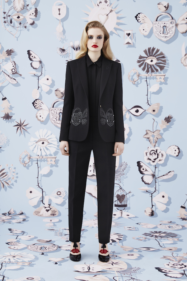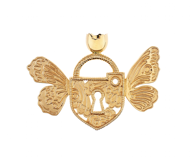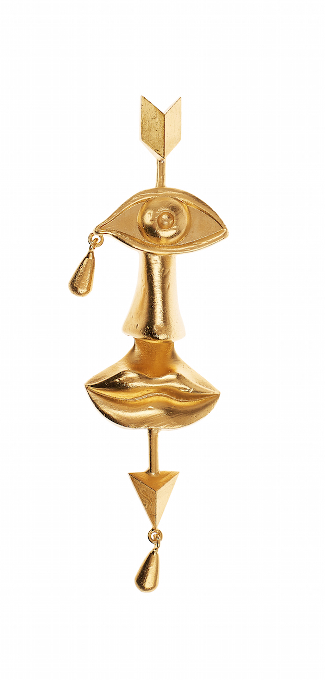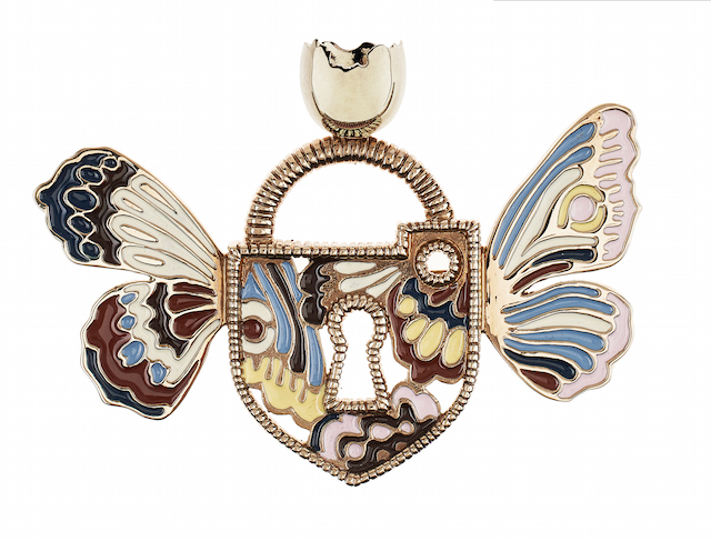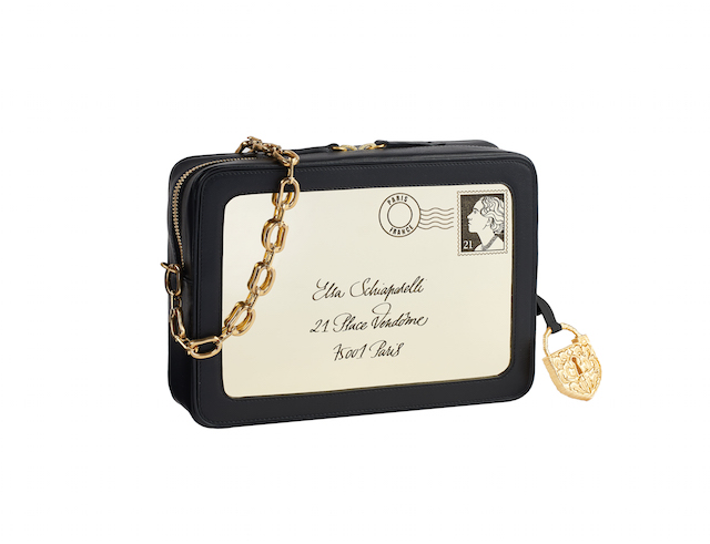 1930年代にメゾンの創業者 Elsa Schiaparelli (エルザ・スキャパレリ) によって発表されたイヴニング・ケープにあしらわれた、Christian Bérard (クリスチャン・ベラール) によるゴールドのエンブロイダリー。幸運のモチーフである南京錠。Salvador Dalí (サルヴァドール・ダリ) の代表作である「THE EYE OF TIME」を思わせる目のモチーフ。レディ トゥ ウェアのアクセントとしてだけでなく、今回のコレクションでは Elsa の愛したモチーフたちがゴールド製のコスチュームジュエリーたち、そしてユニークなデザインのバッグ類に至るまで幅広く取り入れられた。