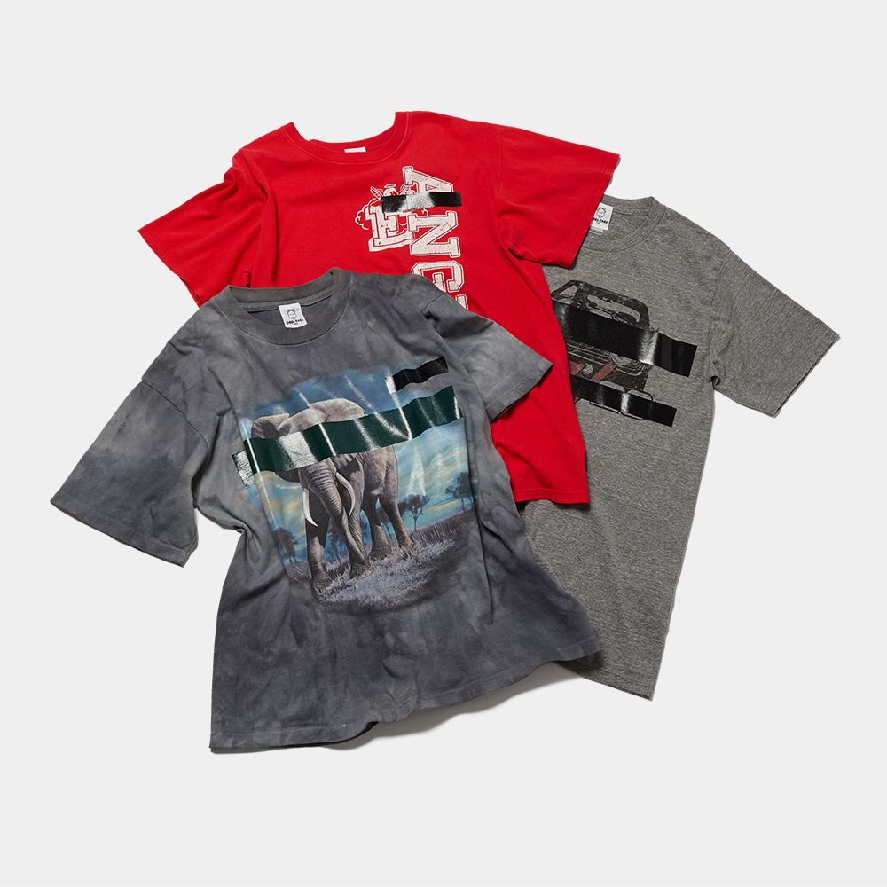 「リ・マスプロダクト」がコンセプトの「 TOGA Odds&Ends」 からは、ヴィンテージ T シャツとヘルメットバッグが登場。 ヴィンテージ T シャツは、それぞれの特徴を活かしオーバープリントを施してアレンジされ、新たなデザインが加わり「再生」されたこれらのアイテムは貴重な 1点ものの作品となっている。