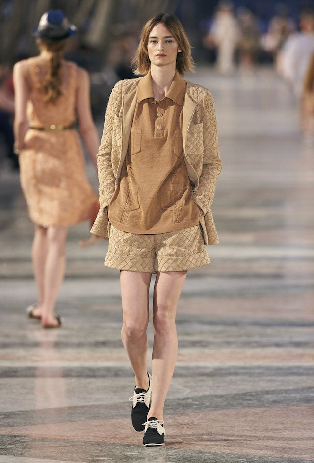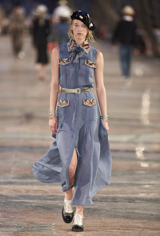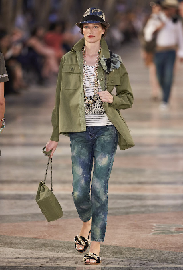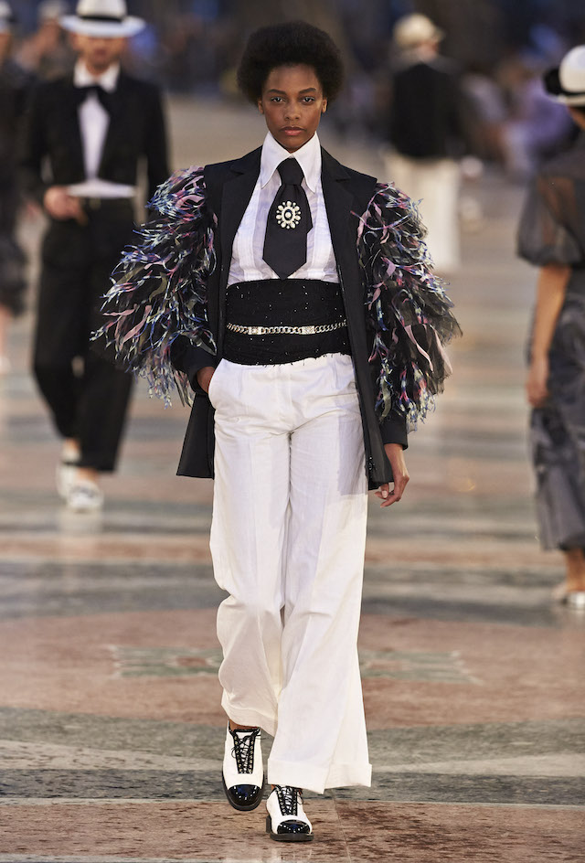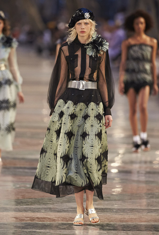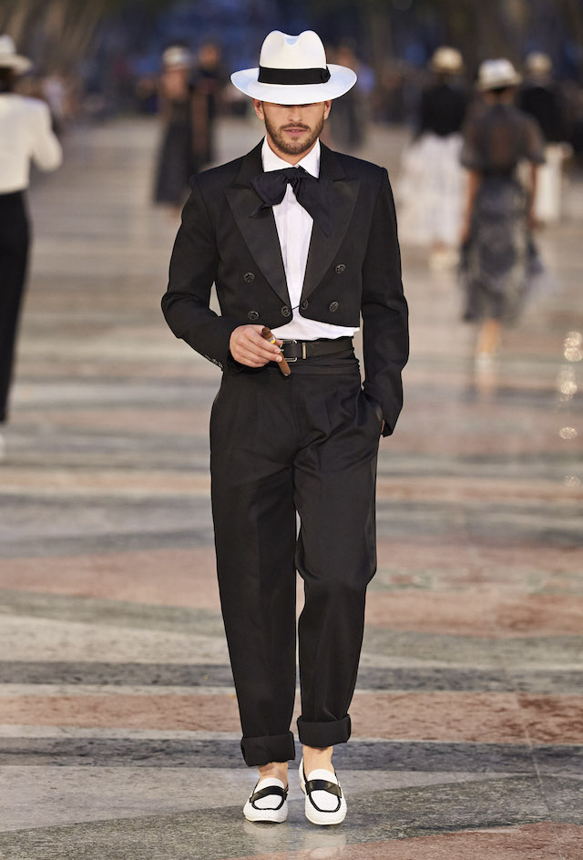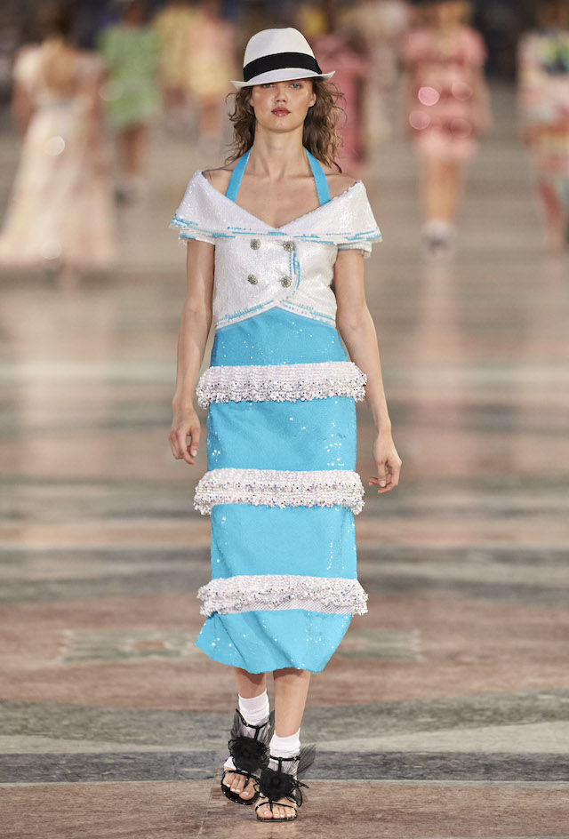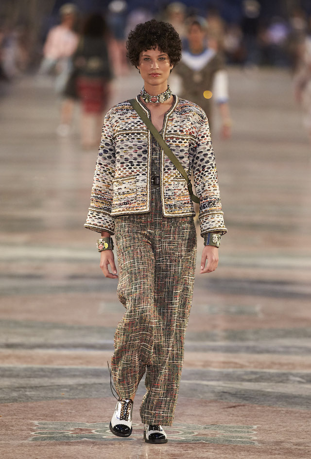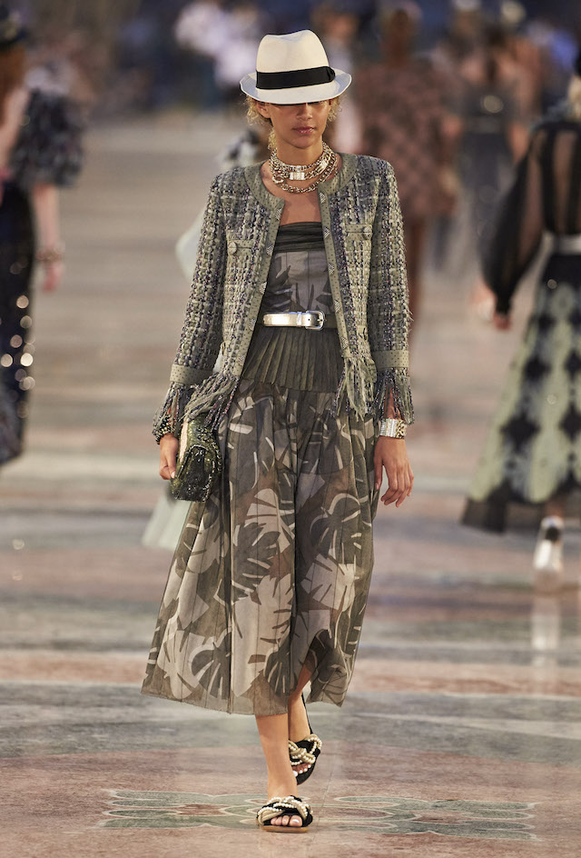 Karl Lagerfeld が「Cuban tux (キューバの正装)」と呼ぶ、ポケットと肩章が付いたキューバの伝統的なシャツ「グアヤベラ」をはじめ、マスキュリンなテーラリングルックで幕を開けたショーは、その後ハバナな著名なナイトクラブ「コパカバーナ」の煌びやかな夜を想起させるスパンコール装飾が施されたガウンへとシフトする。