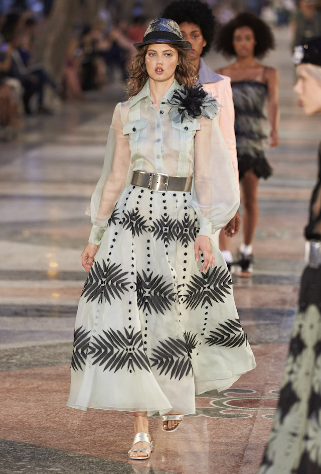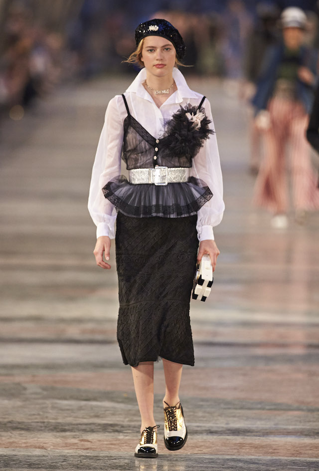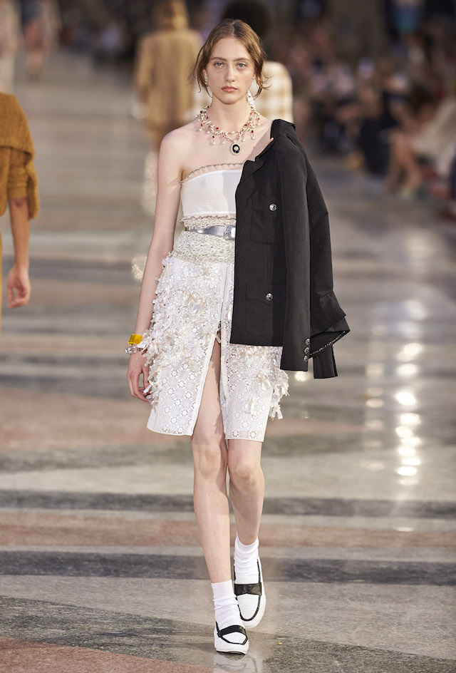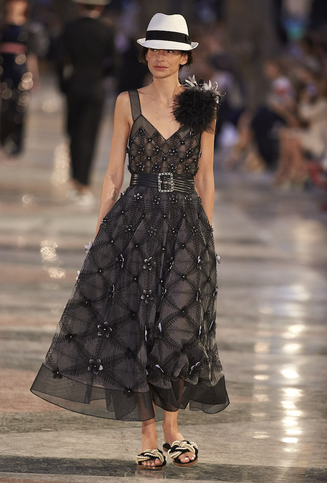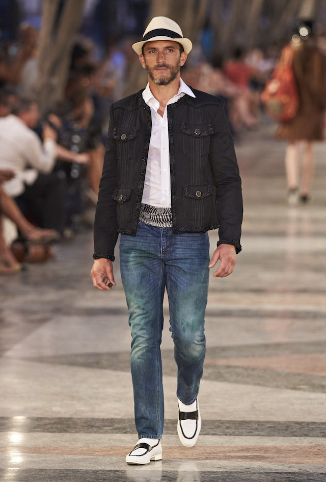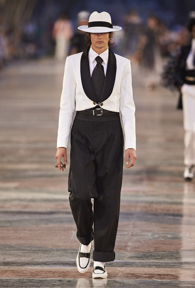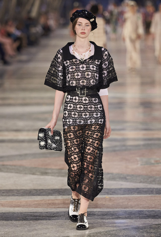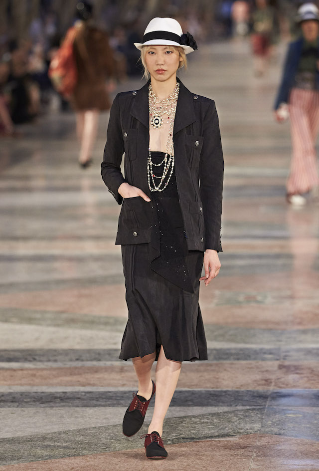 Karl Lagerfeld が「Cuban tux (キューバの正装)」と呼ぶ、ポケットと肩章が付いたキューバの伝統的なシャツ「グアヤベラ」をはじめ、マスキュリンなテーラリングルックで幕を開けたショーは、その後ハバナな著名なナイトクラブ「コパカバーナ」の煌びやかな夜を想起させるスパンコール装飾が施されたガウンへとシフトする。