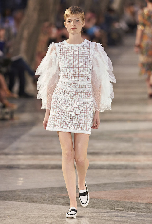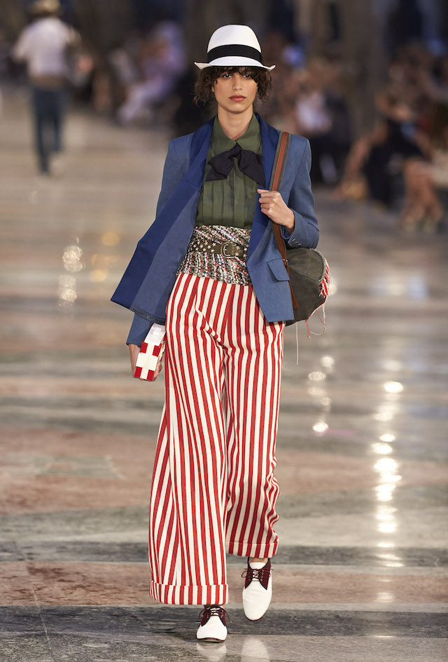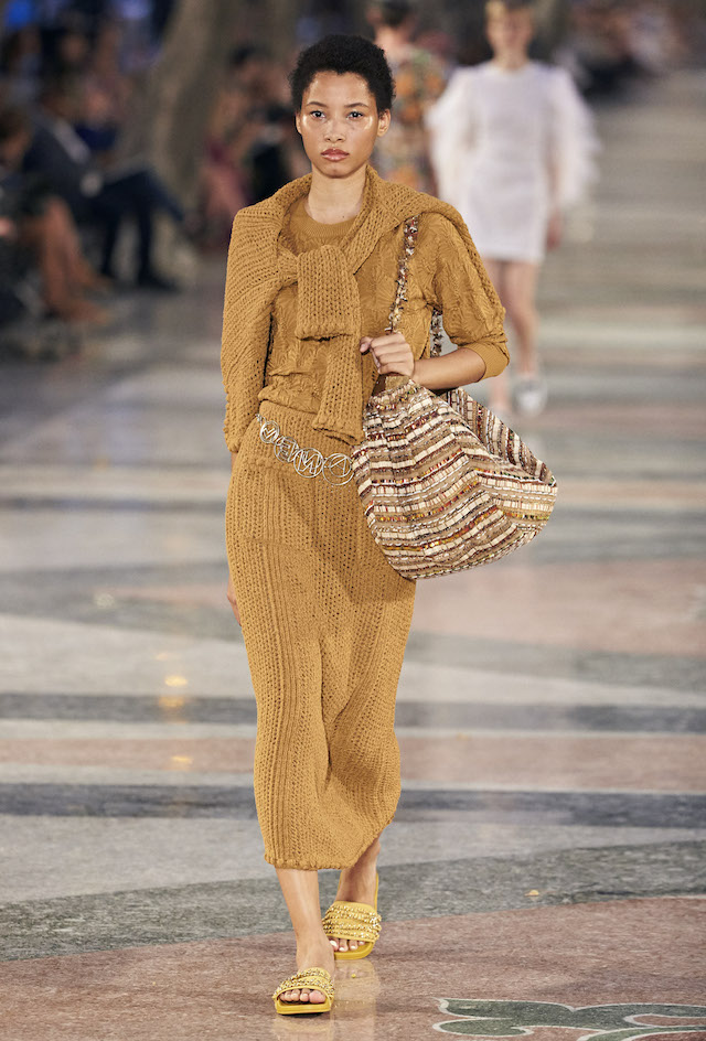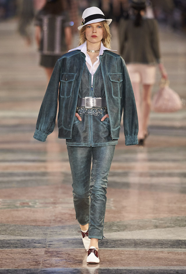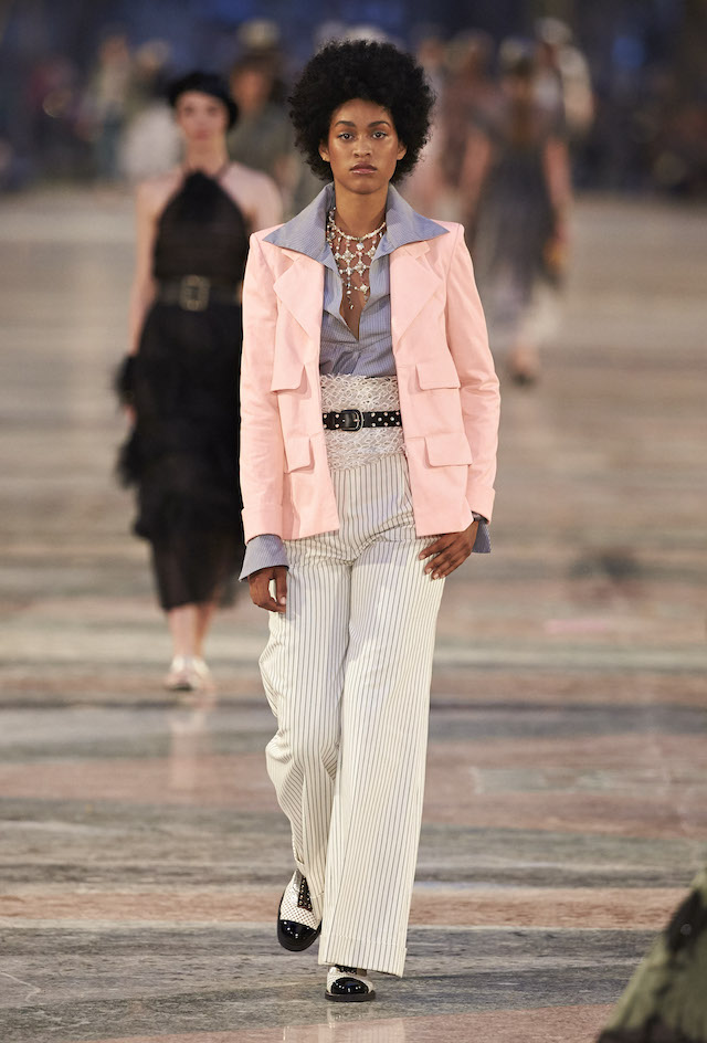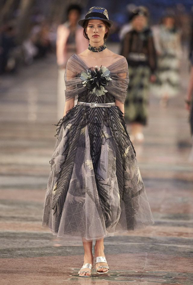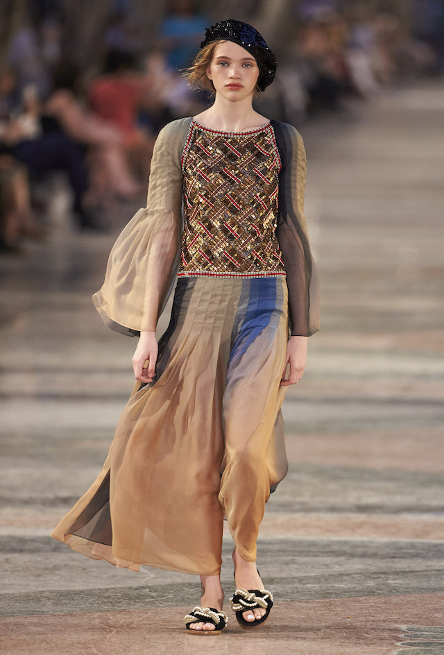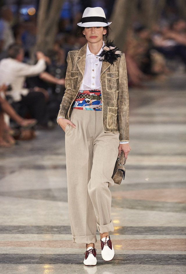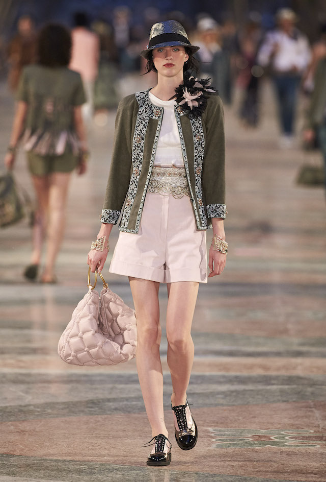 Karl Lagerfeld が「Cuban tux (キューバの正装)」と呼ぶ、ポケットと肩章が付いたキューバの伝統的なシャツ「グアヤベラ」をはじめ、マスキュリンなテーラリングルックで幕を開けたショーは、その後ハバナな著名なナイトクラブ「コパカバーナ」の煌びやかな夜を想起させるスパンコール装飾が施されたガウンへとシフトする。