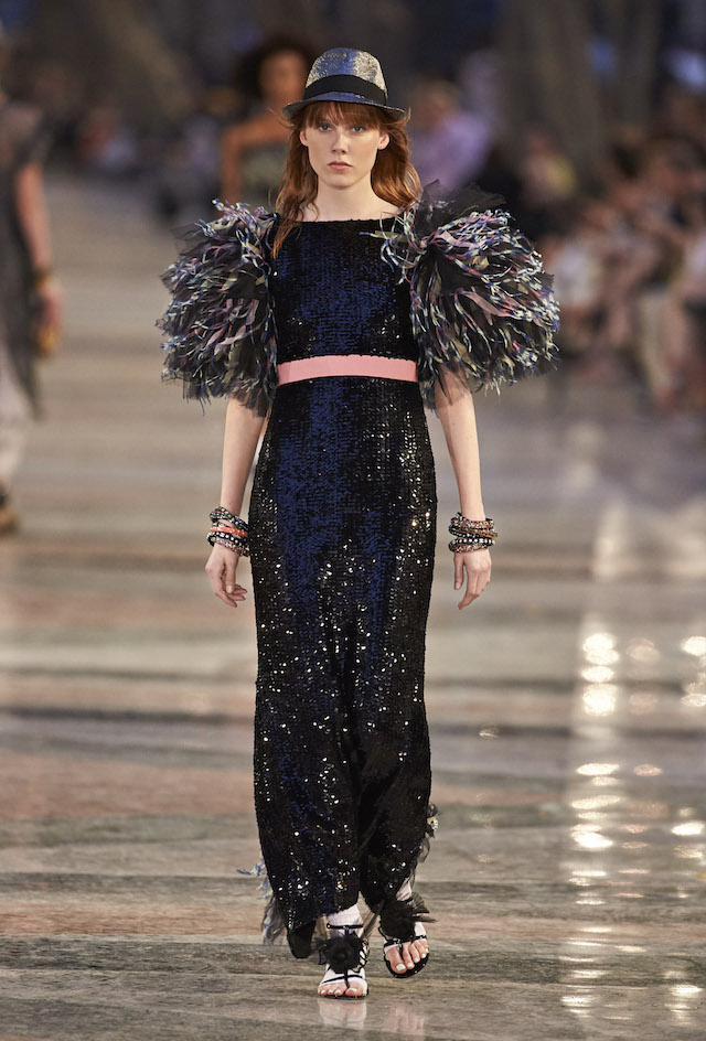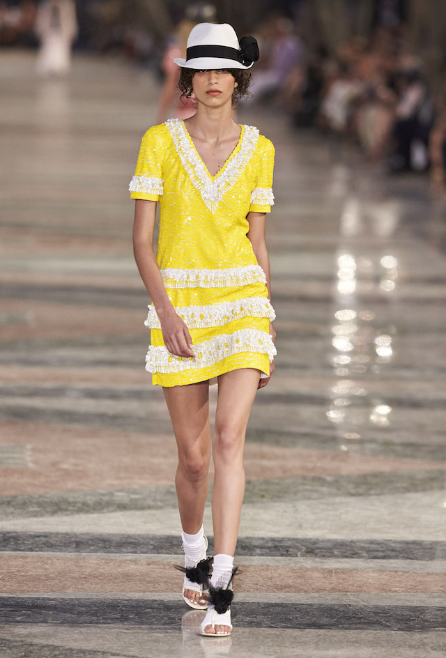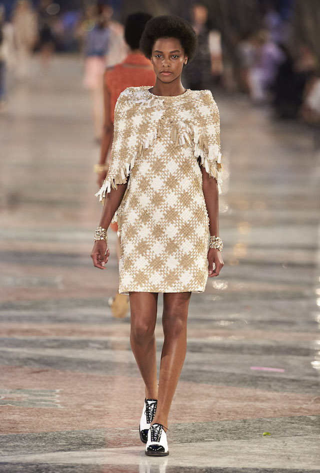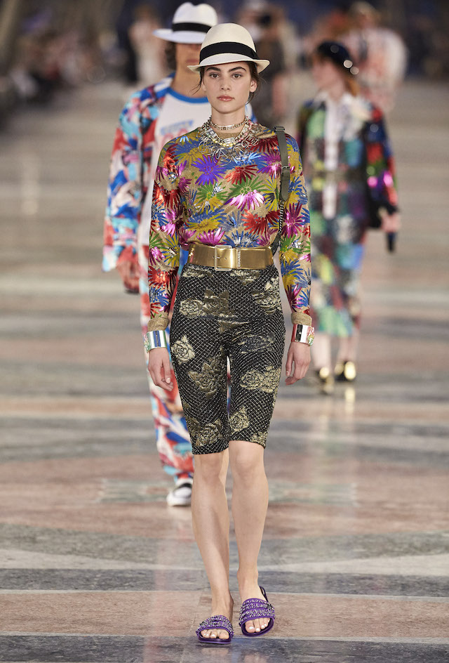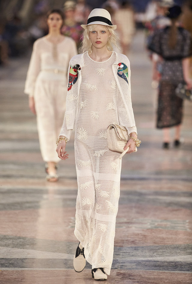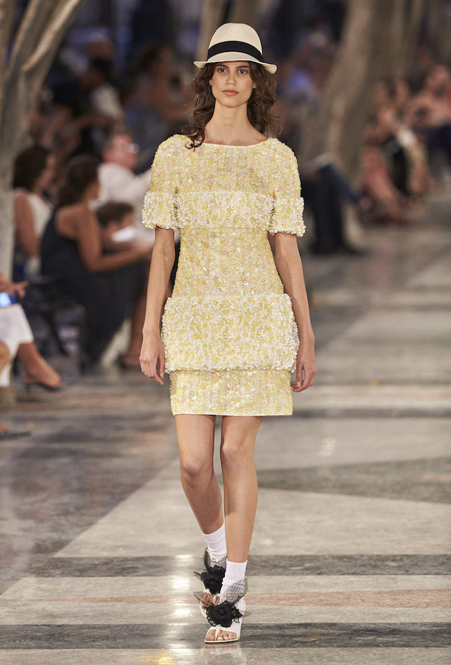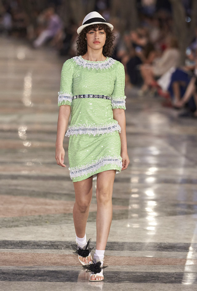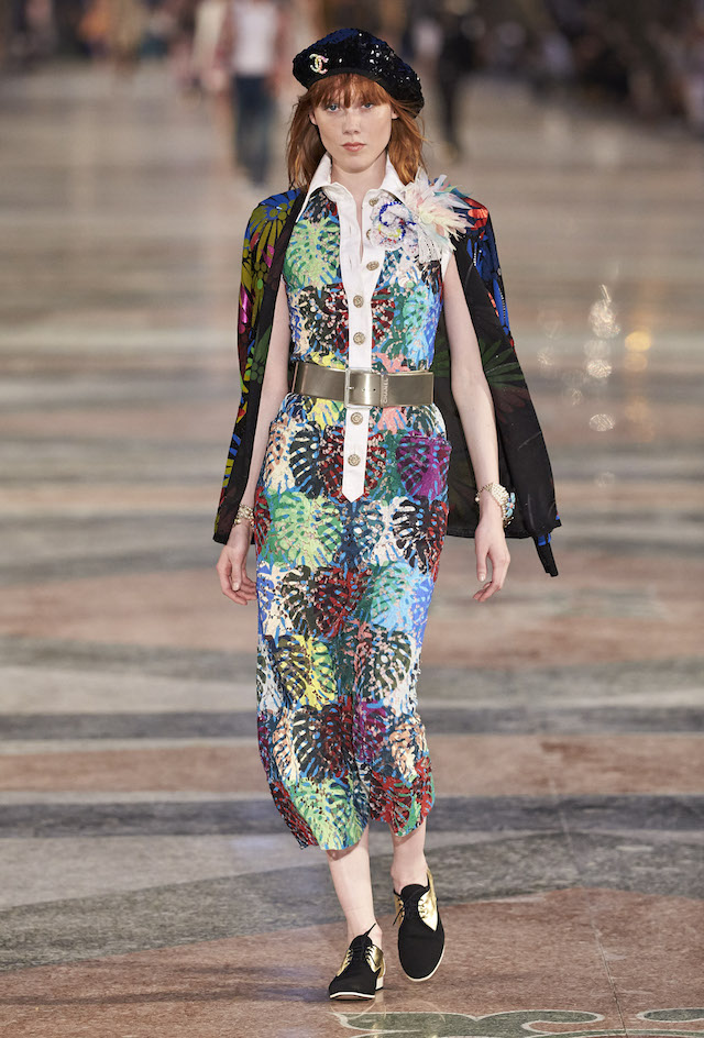 フィナーレで登場したのは、華やかなスパンコールのタキシードに身を包んだ Karl Lagerfeld と、Chanel の最年少モデルこと Hudson Kroenig (ハドソン・クローニング)、現地のラテンダンサーたち、そして陽気なリズムに軽やかなステップを刻むモデルたち。南国の楽園を熱狂の渦で包み込んだランウェイショーに、Vanessa Paradis (ヴァネッサ パラディ)、Gisele Bündchen (ジゼル ブンチェン)、Alice Dellal (アリス デラル)、Gaspard Ulliel (ギャスパー ウリエル) をはじめとするセレブリティたちも陶酔したことに違いない。