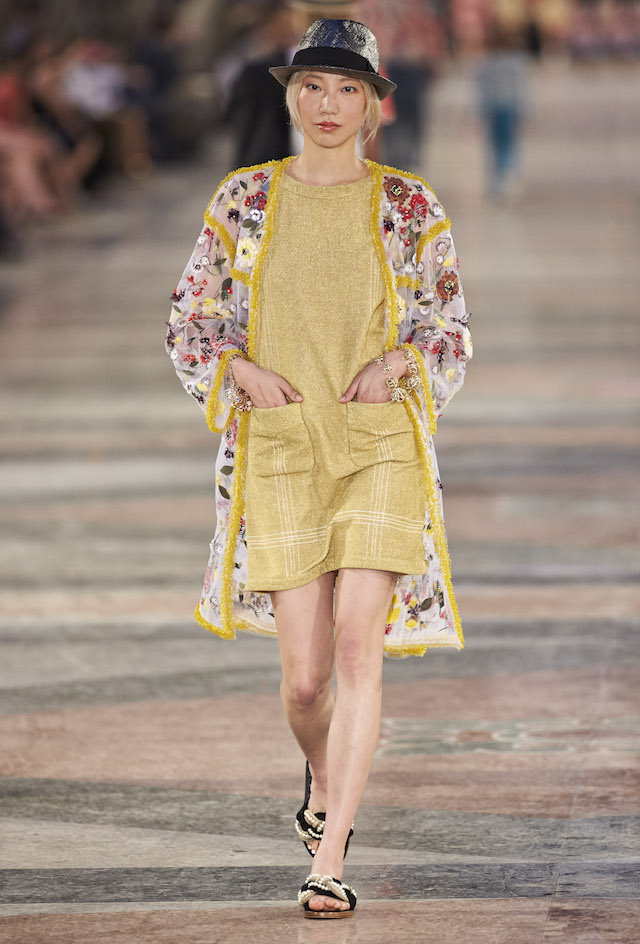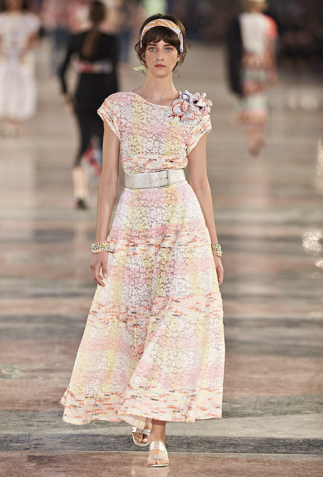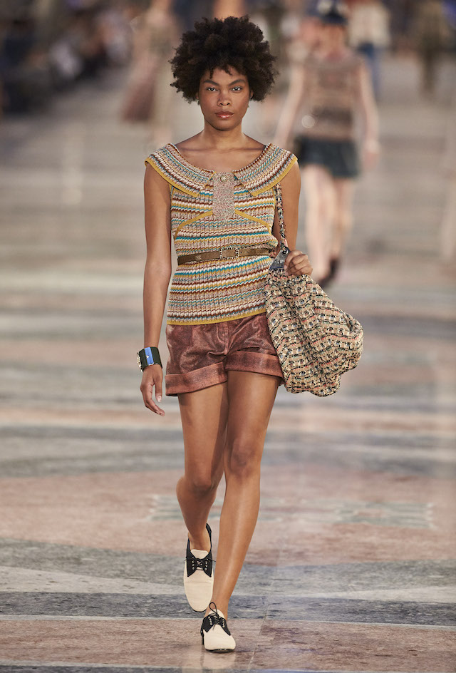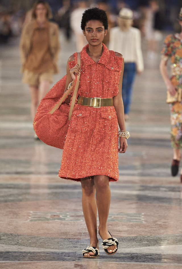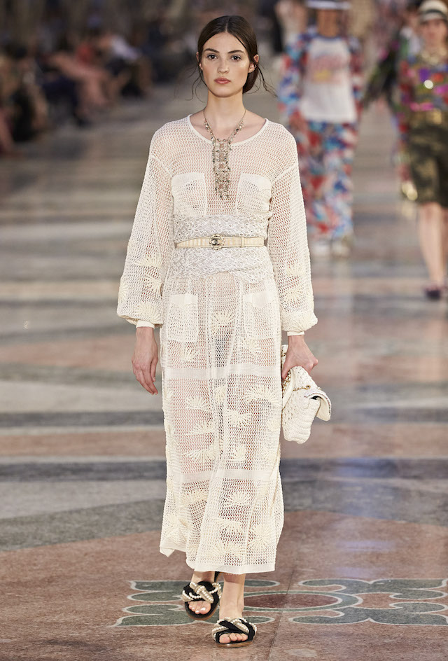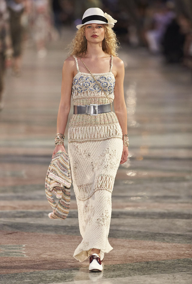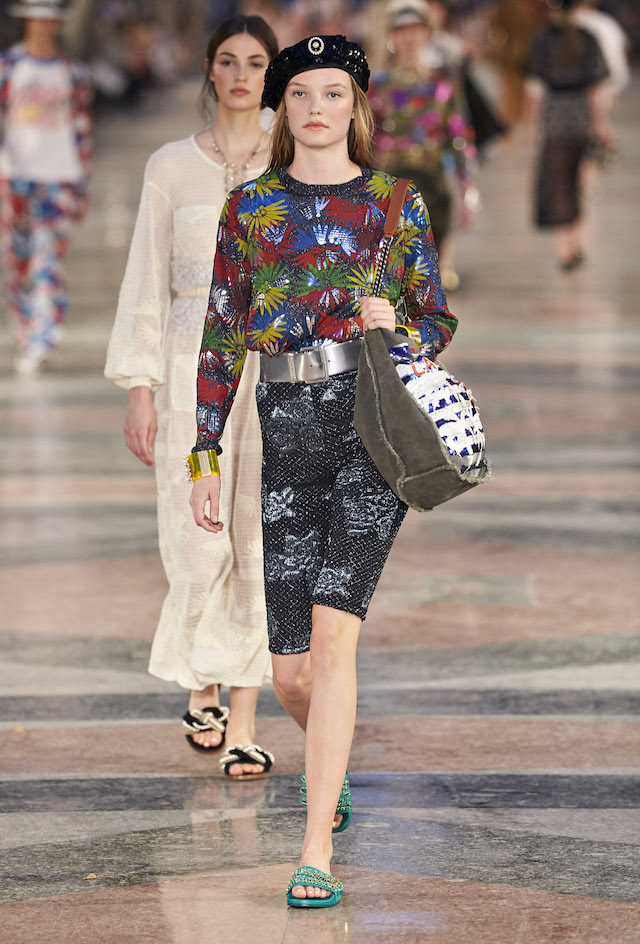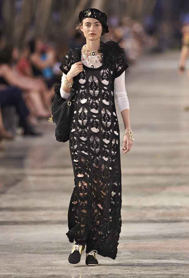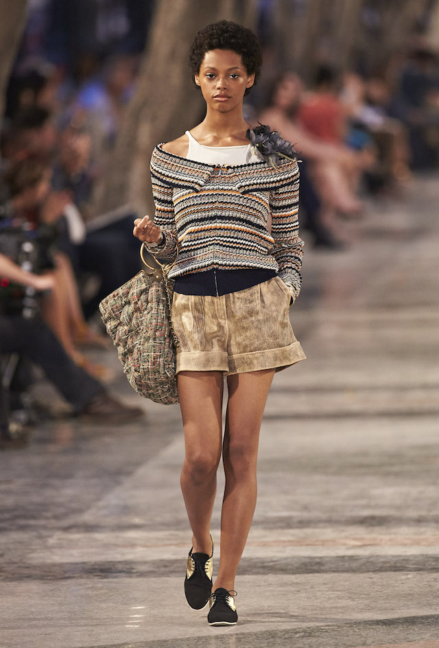 フィナーレで登場したのは、華やかなスパンコールのタキシードに身を包んだ Karl Lagerfeld と、Chanel の最年少モデルこと Hudson Kroenig (ハドソン・クローニング)、現地のラテンダンサーたち、そして陽気なリズムに軽やかなステップを刻むモデルたち。南国の楽園を熱狂の渦で包み込んだランウェイショーに、Vanessa Paradis (ヴァネッサ パラディ)、Gisele Bündchen (ジゼル ブンチェン)、Alice Dellal (アリス デラル)、Gaspard Ulliel (ギャスパー ウリエル) をはじめとするセレブリティたちも陶酔したことに違いない。