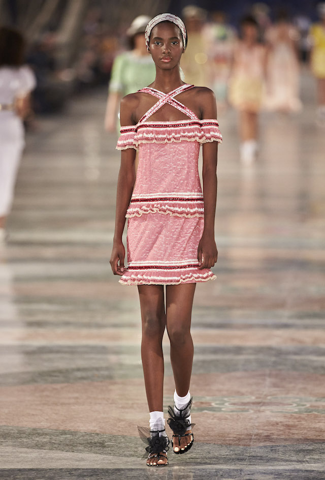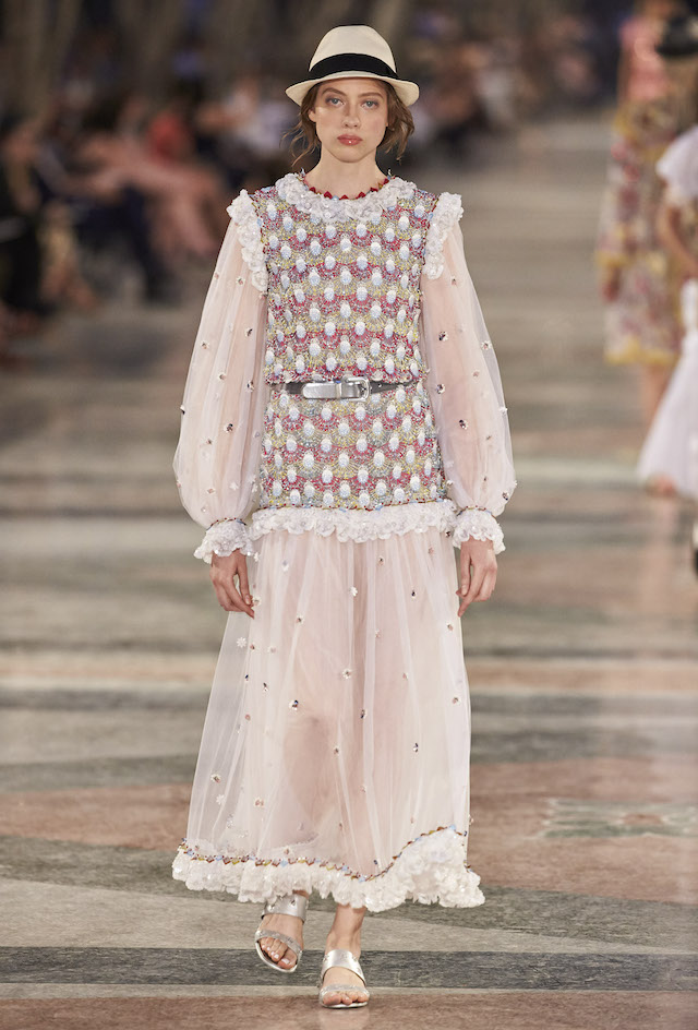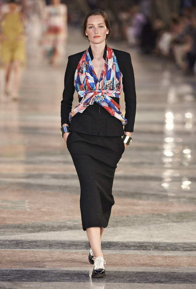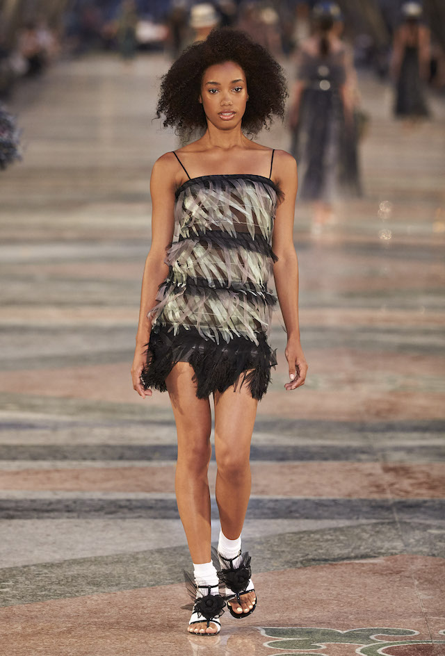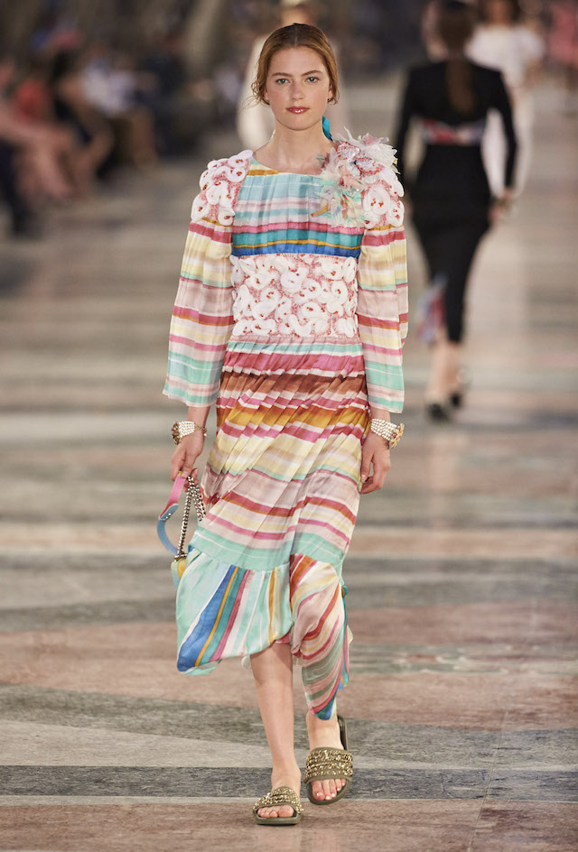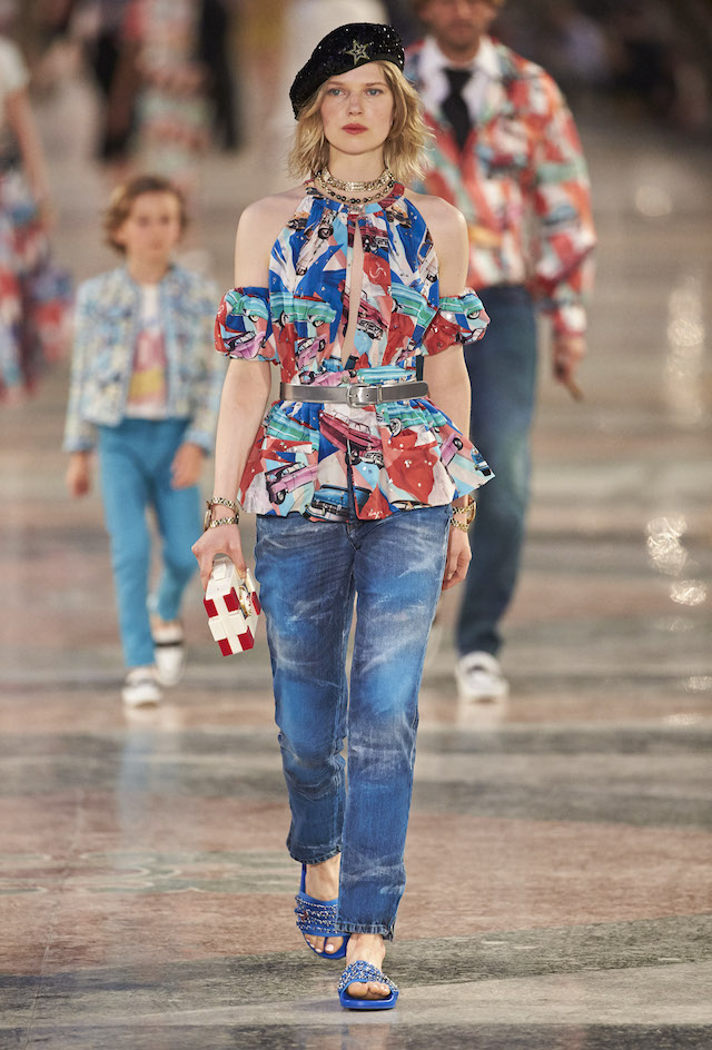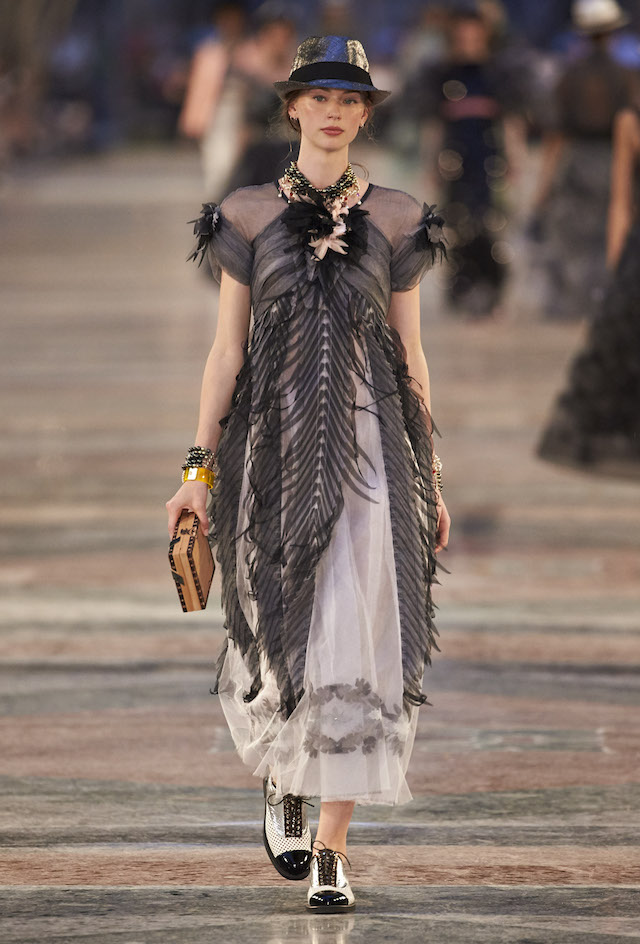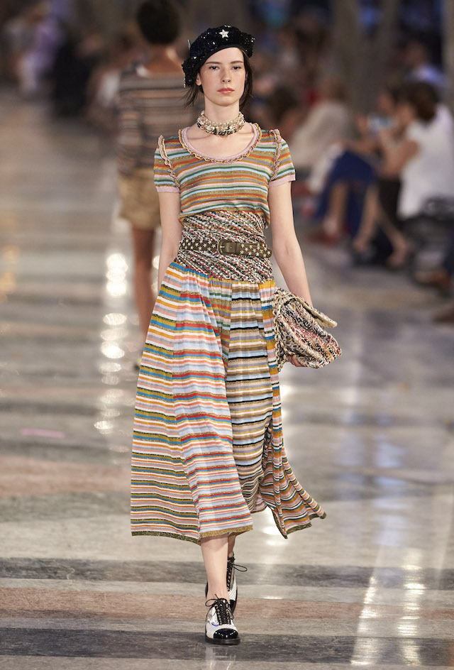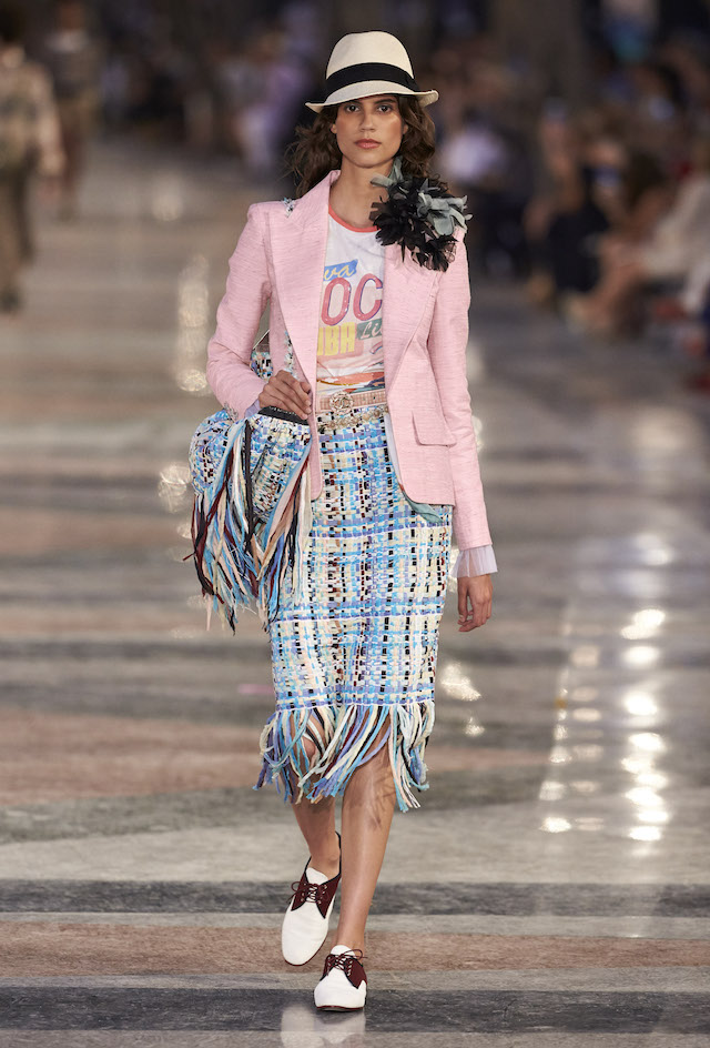 フィナーレで登場したのは、華やかなスパンコールのタキシードに身を包んだ Karl Lagerfeld と、Chanel の最年少モデルこと Hudson Kroenig (ハドソン・クローニング)、現地のラテンダンサーたち、そして陽気なリズムに軽やかなステップを刻むモデルたち。南国の楽園を熱狂の渦で包み込んだランウェイショーに、Vanessa Paradis (ヴァネッサ パラディ)、Gisele Bündchen (ジゼル ブンチェン)、Alice Dellal (アリス デラル)、Gaspard Ulliel (ギャスパー ウリエル) をはじめとするセレブリティたちも陶酔したことに違いない。