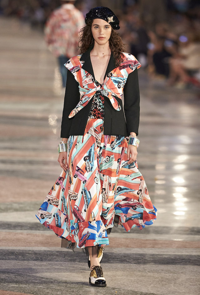 アイコニックなブラックとホワイトに加え、イエロー、ピンク、オレンジ、ターコイズ、ライトグリーンなど色とりどりのカラーパレットが彩るワードローブ。ネックラインを強調したジャケットやドレス、クラシックカーや南国風の植物を思わせるプリントには、キューバ革命の父、チェ ゲバラへのオマージュとしてベレー帽が合わせられている。