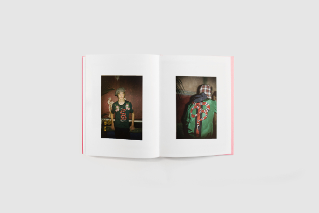 エアークッションの封筒に収められた本書は、表紙に Gucci の新しいアイコンでありブランドのコレクションにも度々登場しているスネークのホログラムシール、裏表紙には黒のシルクスクリーンでプリントされたブランドのロゴが配されている。カバーにあるクリアポケットには、Marcopoulos による作品から13種類の写真がセレクトされ、15cmx10cm のポストカードがランダムに1枚ずつ差し込まれている。また、ブックカバーには Alessandro Michele による言葉が綴られ、両面カラーのポスターが折り込まれるなど文字通りデラックスな写真集だ。