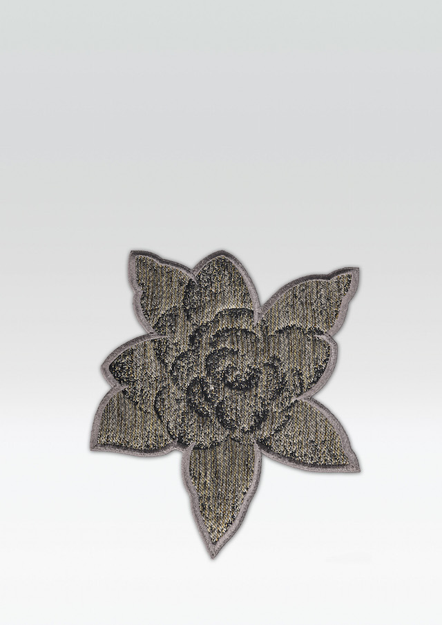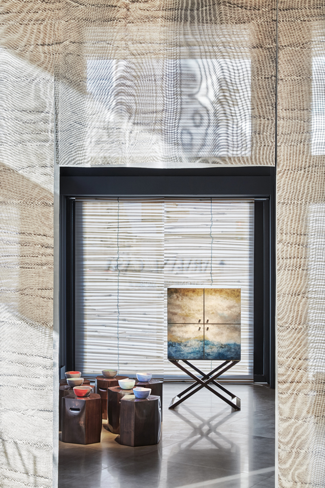 今回会場として用いられたのは、コルソ・ヴェネツィアのブティック。会期中特別に設けられたスペースでは、ディープブラックの壁面と、ダークグレーのベドニア石材により床面がシャープなコントラストを描く空間の中に、天井から床まで届く薄いメッシュが幻想的な世界観を演出した。
