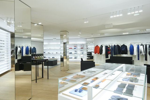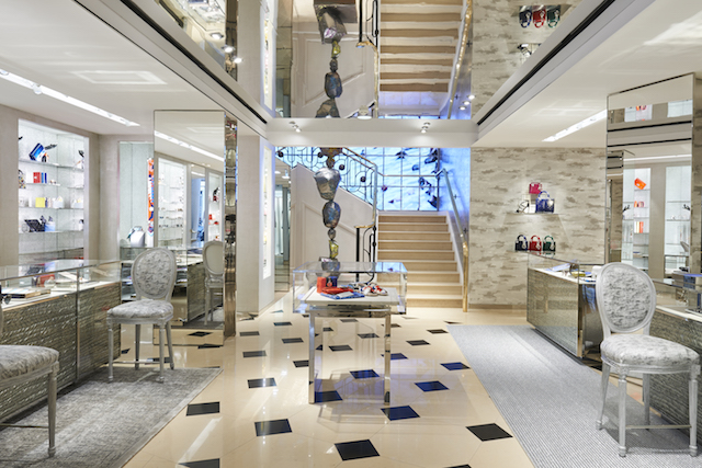 カンヌのクロワゼット通り7番地にオープンした新店舗の建築を手がけたのは Peter Marino (ピーター・マリノ)。近代的な建造物と、ヨーロッパの伝統的な建築様式を踏襲した3フロア構成のブティックでは、ウィメンズ、メンズ向けのレザーグッズ、ウォッチ、ジュエリー、プレタポルテ、そしてシューズを展開する。グレーとホワイトを基調にした店内では、ネオ ルイ16世様式のメダリヨン椅子をはじめ、Russel Woodard (ラッセル ・ ウッダード) の肘掛け椅子、Wouter Hoste (ウーター・ホステ) デザインのランプ、 そして Oyoram (オヨラム)のアニメーション フレスコ画などユニークなアート作品たちがパリのアヴェニュー モンテーニュ30番地の本店のような趣を演出している。