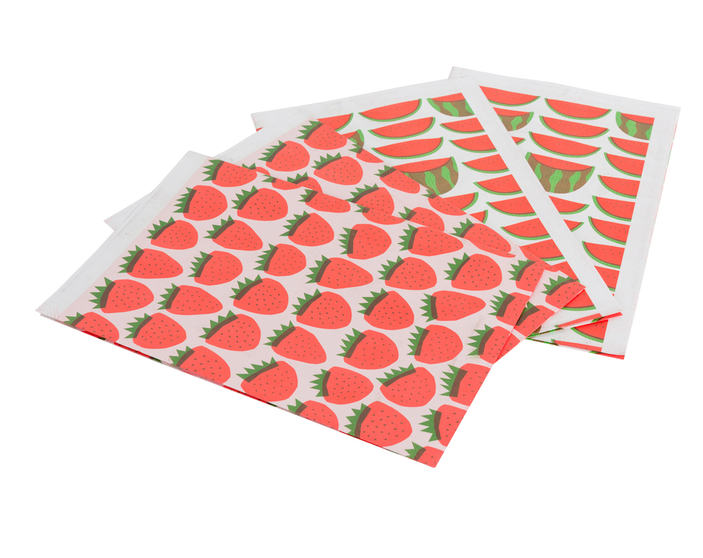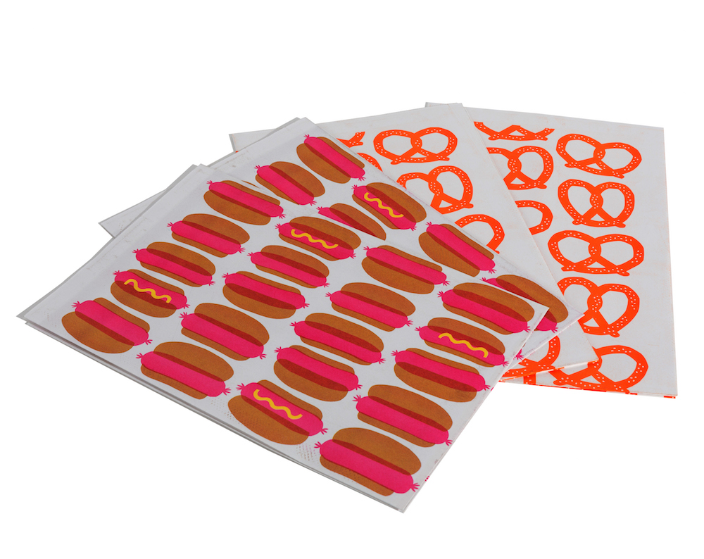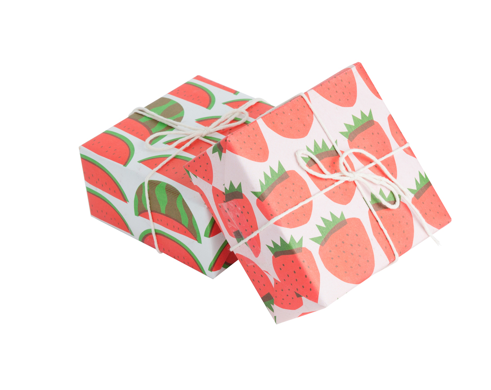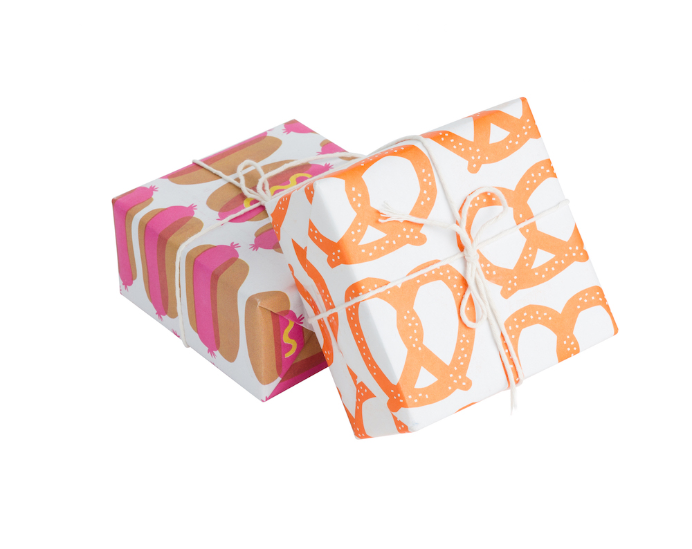 ブルックリンにお店をかまえる Knot & Bow (ノット&バウ) は、アメリカの昔ながらのスクールサプライをインスピ レーションとした、モダンでありながらもノスタルジックな雰囲気のギフトラッピングや紙製品を扱う専門店。 フルーツと、ニューヨークを代表するストリートフードをデザインしたラッピングペーパー は、アーティストの Erin Jang (エリン・ジャン) とのコラボ。小瓶に入ったバースデーキャンドル は、Knot & Bow の一番人気のアイテム。