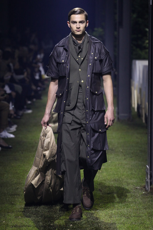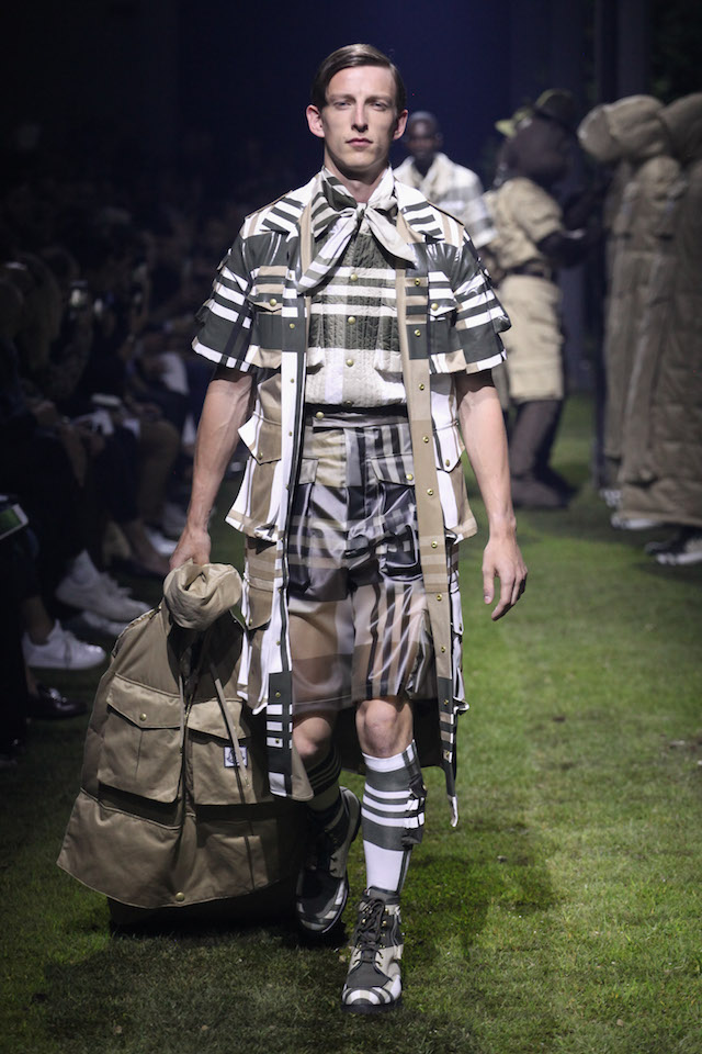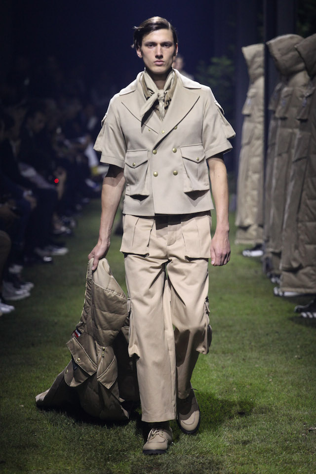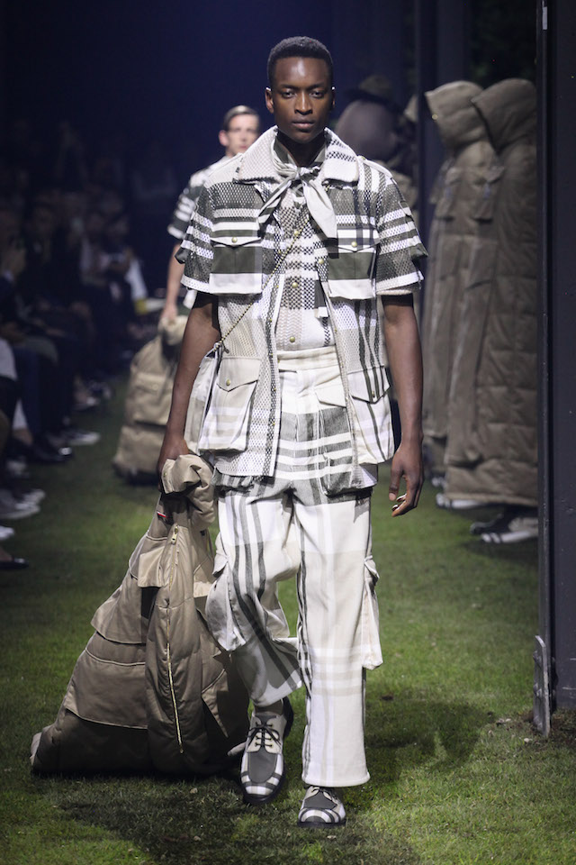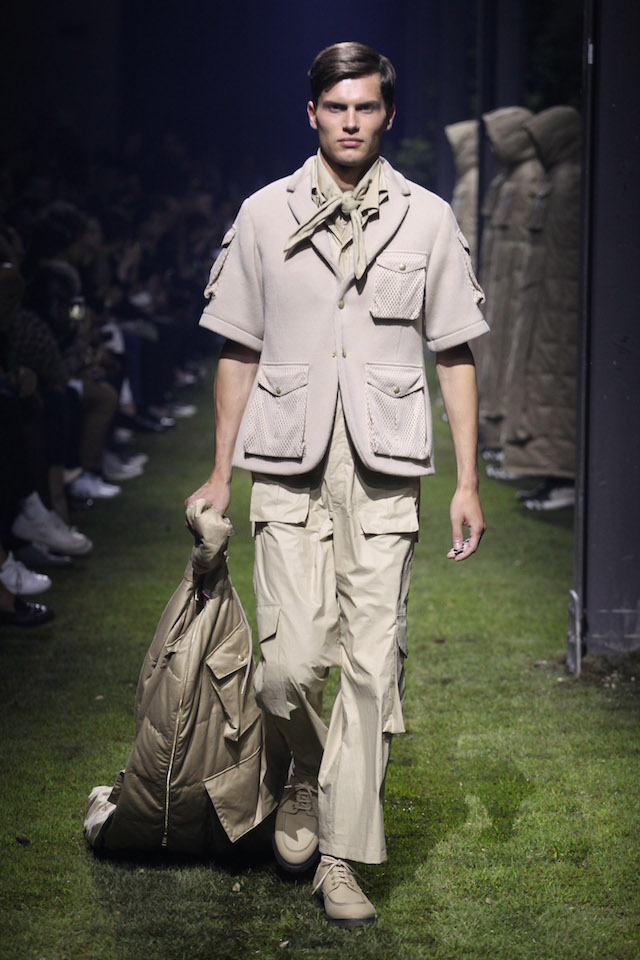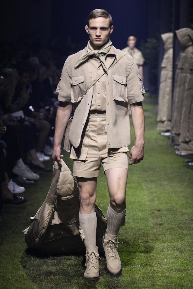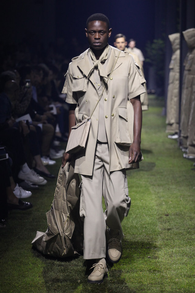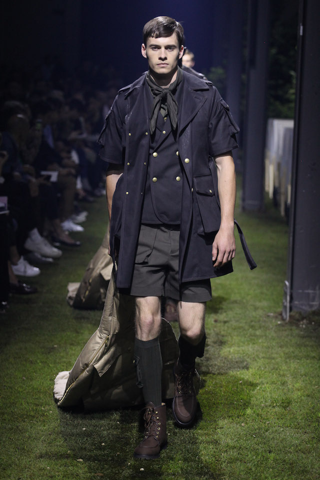 ランウェイの幕を切ったのは、2頭の熊たち。カーキのグラデーションをベースに展開され、ミリタリームード溢れるワードローブには、刺繍、レーザーカット、サーモ・ボンディング、メッシュ素材に施されたガムプリント、シャイニーとマットの 2 タイプの撥水加工素材、刺繍やスティッチングで表現されるチェック柄など、さながらビスポークのテーラリングのような精巧なディティールが取り入れられたほか、スタイリングでは首元に巻いたスカーフや、サイドにプリーツが施されたソックスのレイヤードなどで遊び心が加えられた。