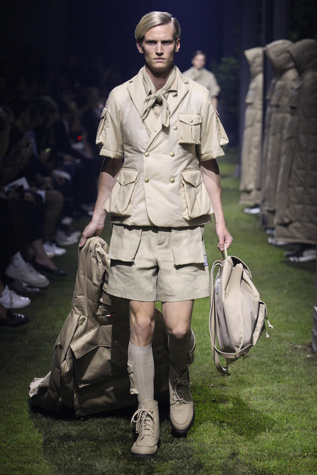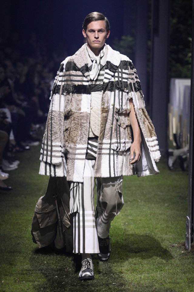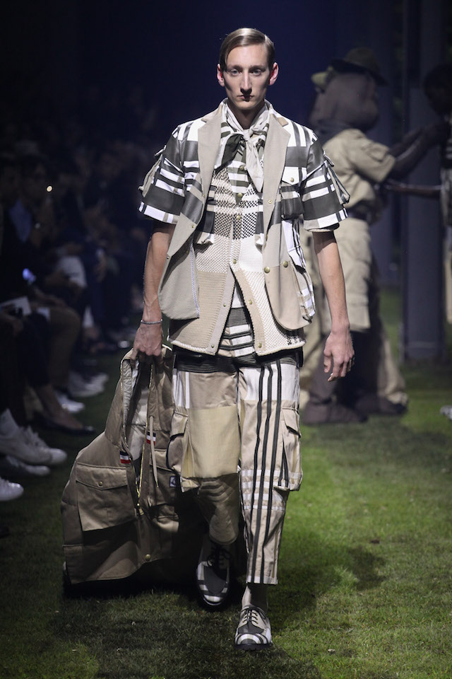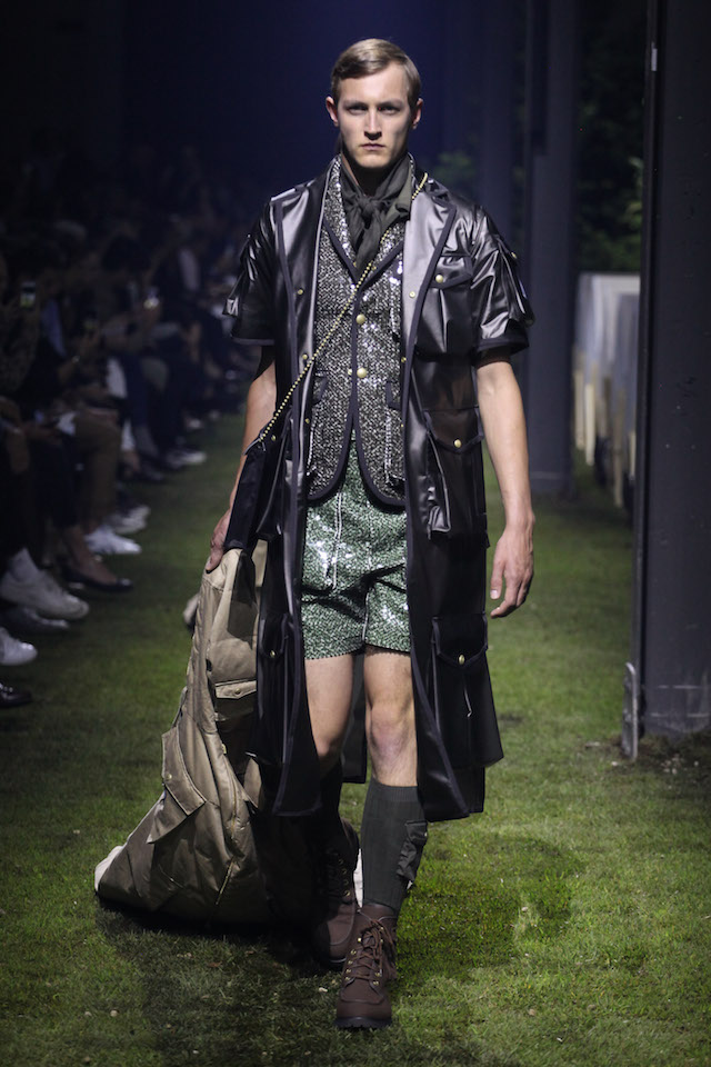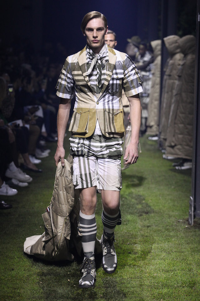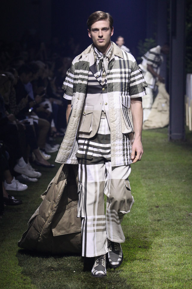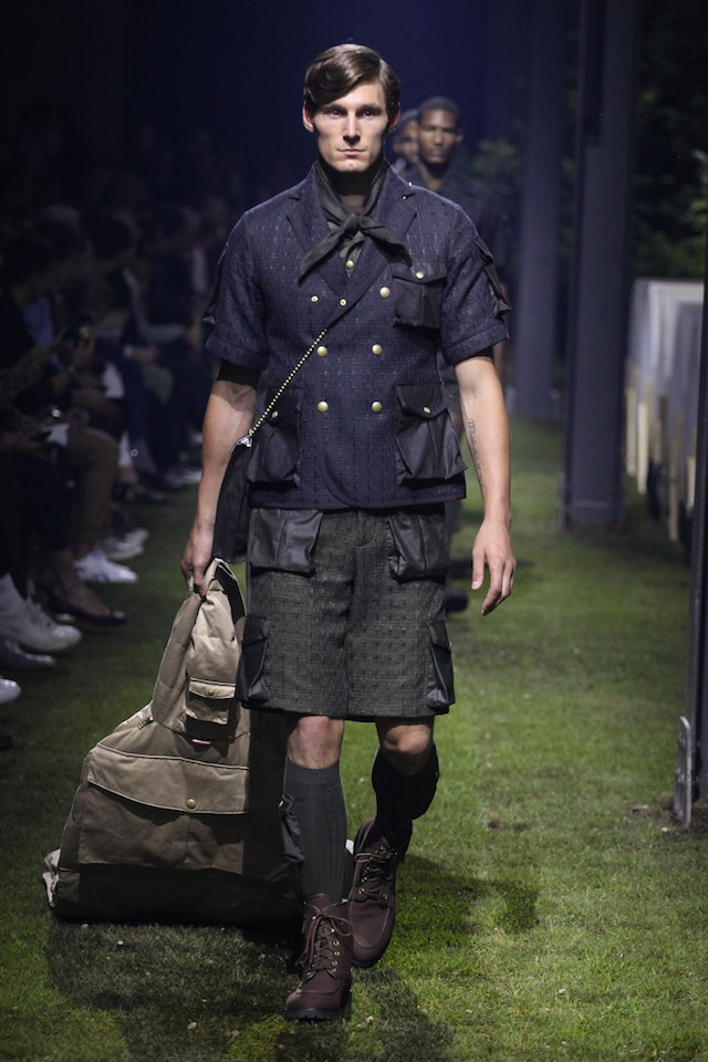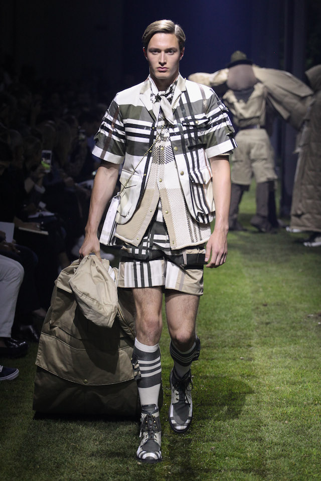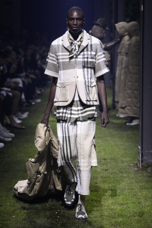 ランウェイの幕を切ったのは、2頭の熊たち。カーキのグラデーションをベースに展開され、ミリタリームード溢れるワードローブには、刺繍、レーザーカット、サーモ・ボンディング、メッシュ素材に施されたガムプリント、シャイニーとマットの 2 タイプの撥水加工素材、刺繍やスティッチングで表現されるチェック柄など、さながらビスポークのテーラリングのような精巧なディティールが取り入れられたほか、スタイリングでは首元に巻いたスカーフや、サイドにプリーツが施されたソックスのレイヤードなどで遊び心が加えられた。