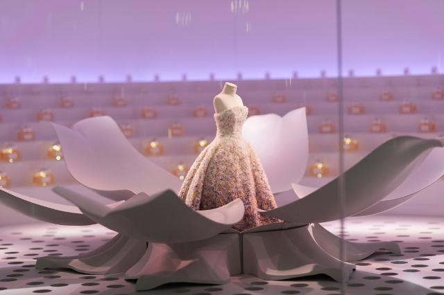 フランス語で劇場という意味を持つ「ル・テアトル」と題された本展はその名の通り、ファッション史の最も重要な出来事である Christian Dior (クリスチャン・ディオール) の1947年のデビューコレクションから今日までの軌跡をメゾンの素晴らしいドレスと共に振り返る。9つのテーマ毎に構成される展示は、デザイナーのインスピレーション源や愛した世界を紹介しており、「エレガンスの職人」と謳われる偉大なクチュリエの先見性に満ちた才能を目の当たりにするだろう。展示されているミニチュアドレスはすべて、実際のドレスの比率をディテールまで忠実に制作されており、初期の作品なども当時と全く同じ技術と素材で完璧に再現。細部にまでリュスクが散りばめられたフェミニンで美しいシルエットを持つドレスは勿論のこと、メゾンの職人の類いまれなるクラフツマンシップも堪能できる。