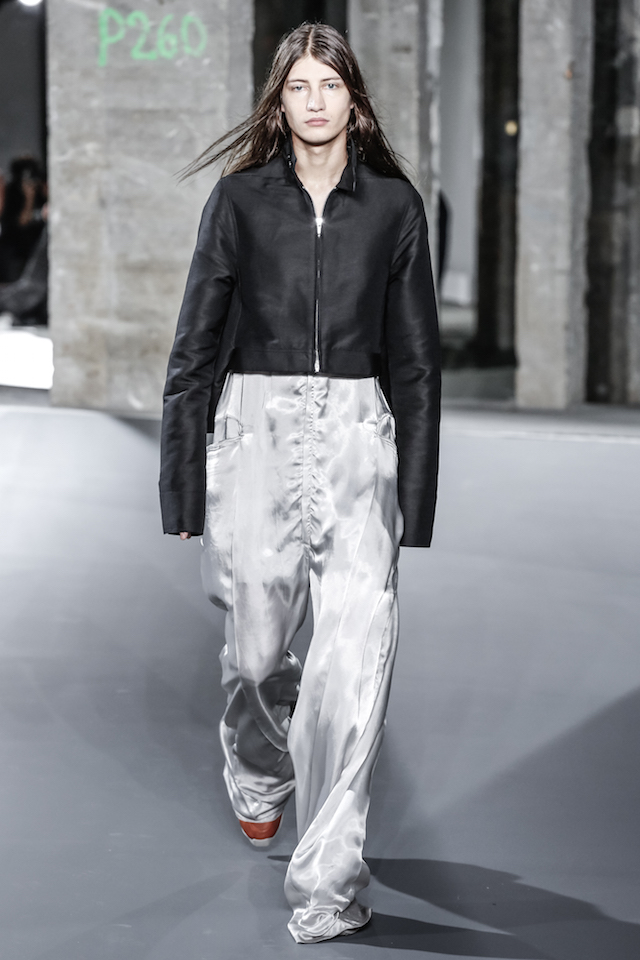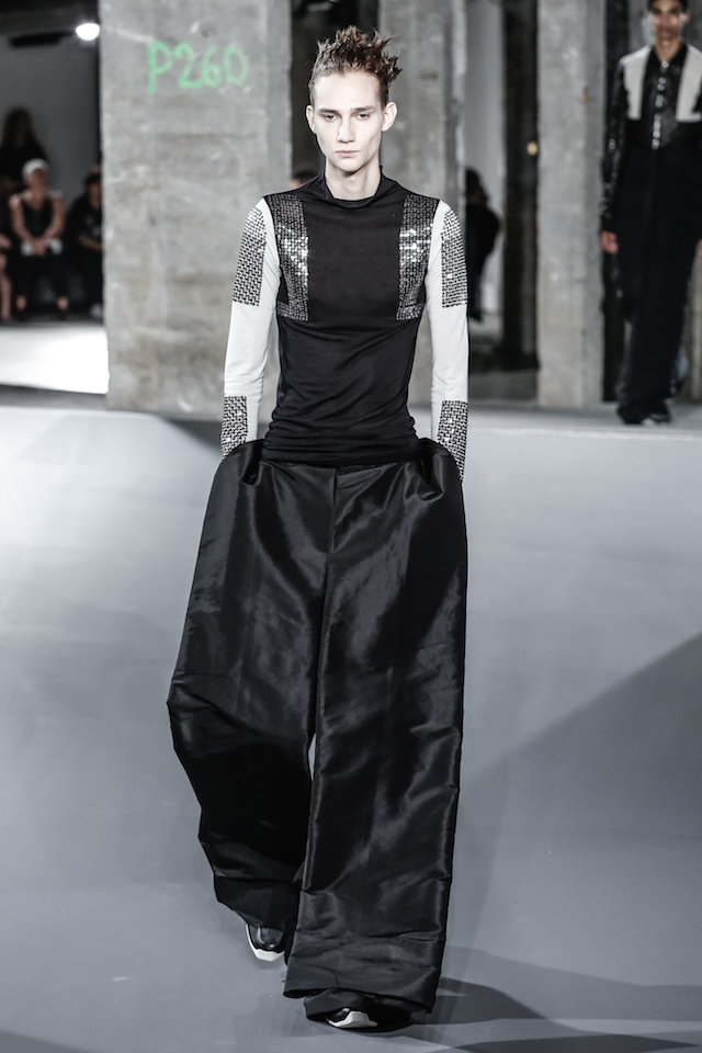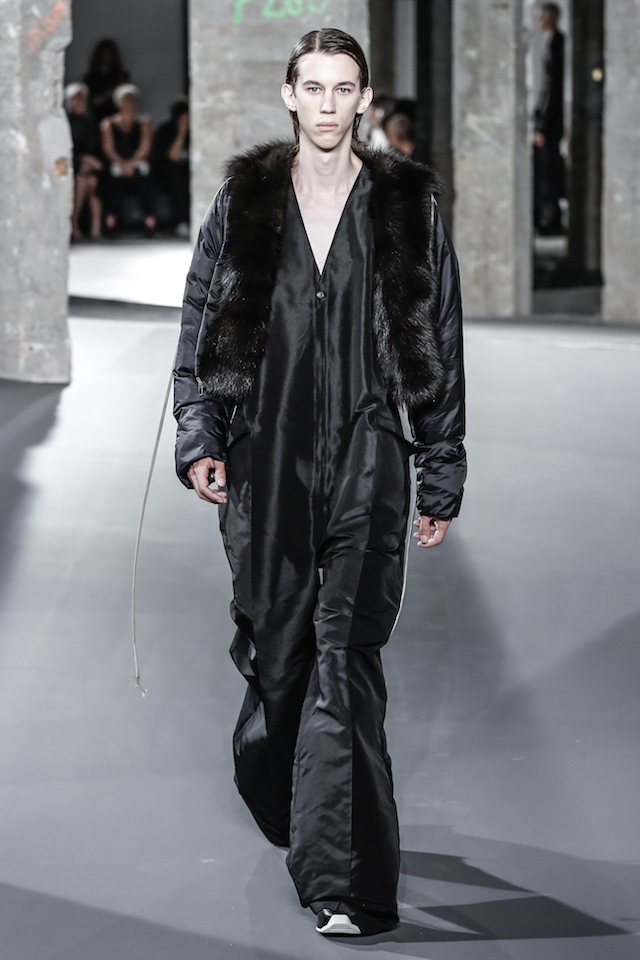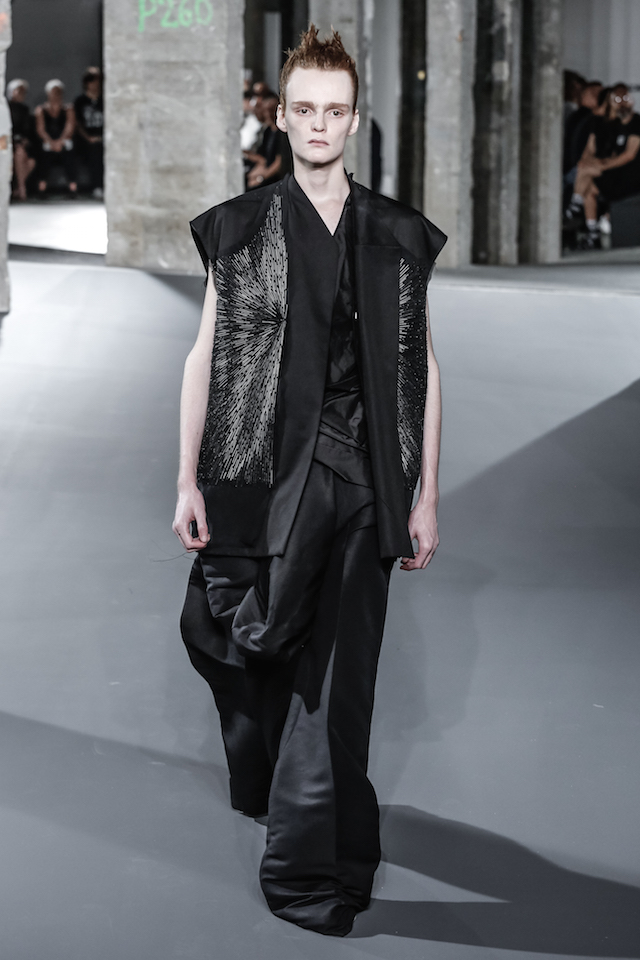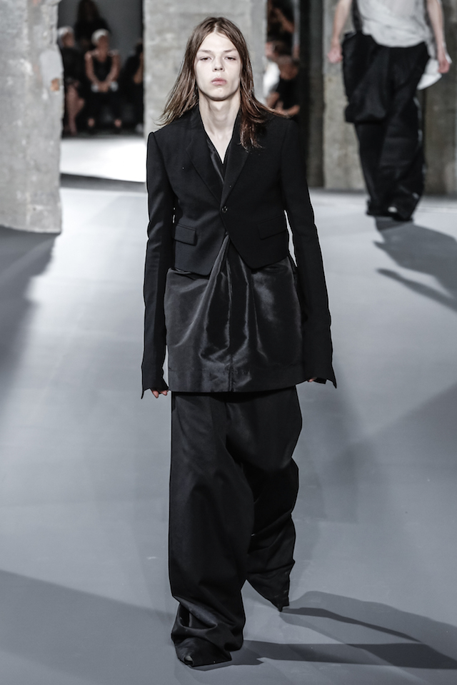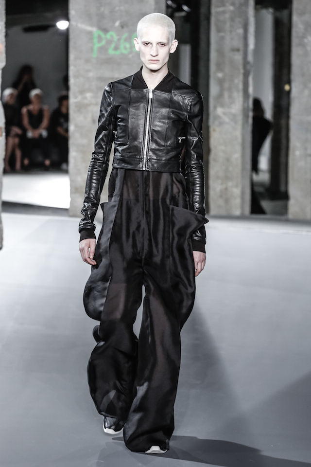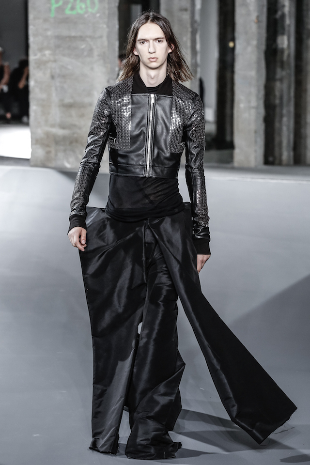 パリ ファッションウィーク2日目にあたる23日、Rick Owens (リック・オウェンス) による2017年春夏メンズコレクションが発表された。Palais de Tokyo (パレ・ド・トーキョー) を会場にした今季、「WALRUS (ワルラス=セイウチ)」をテーマにした42のルックが登場。クチュール史に残る Madame Grès (マダム・グレ) の作品に見るドレープ美学を現代へと継承したワードローブは、極めて薄手のシフォンや、シマーな輝きを放つシルクタフタを巧みに操り、アンドロジナスかつエレガントなスタイルへと昇華されている。
