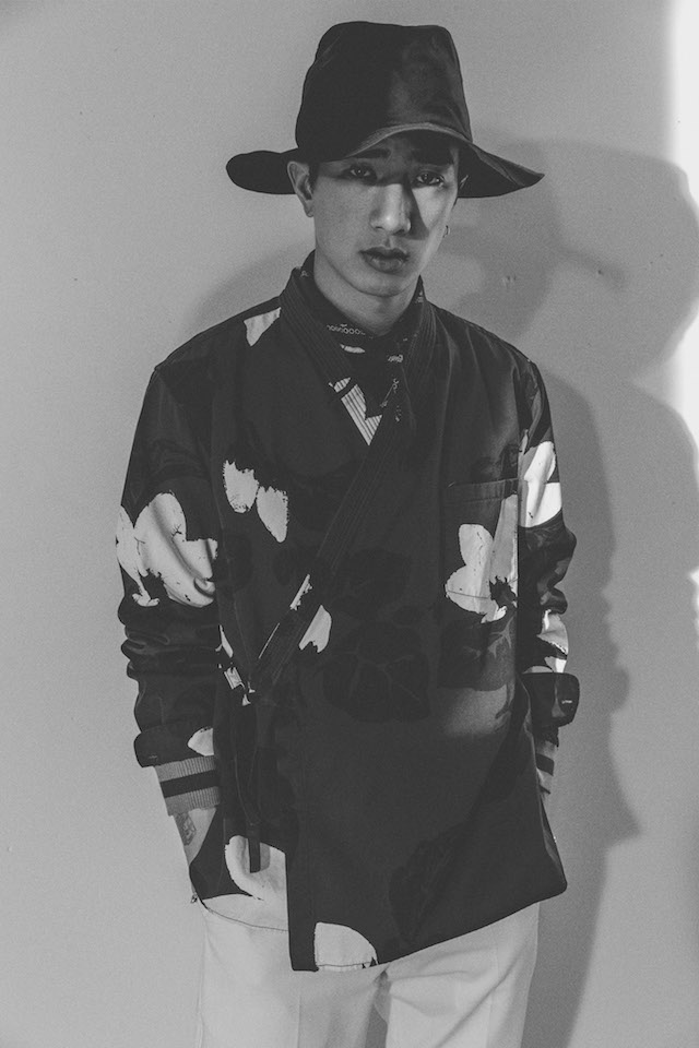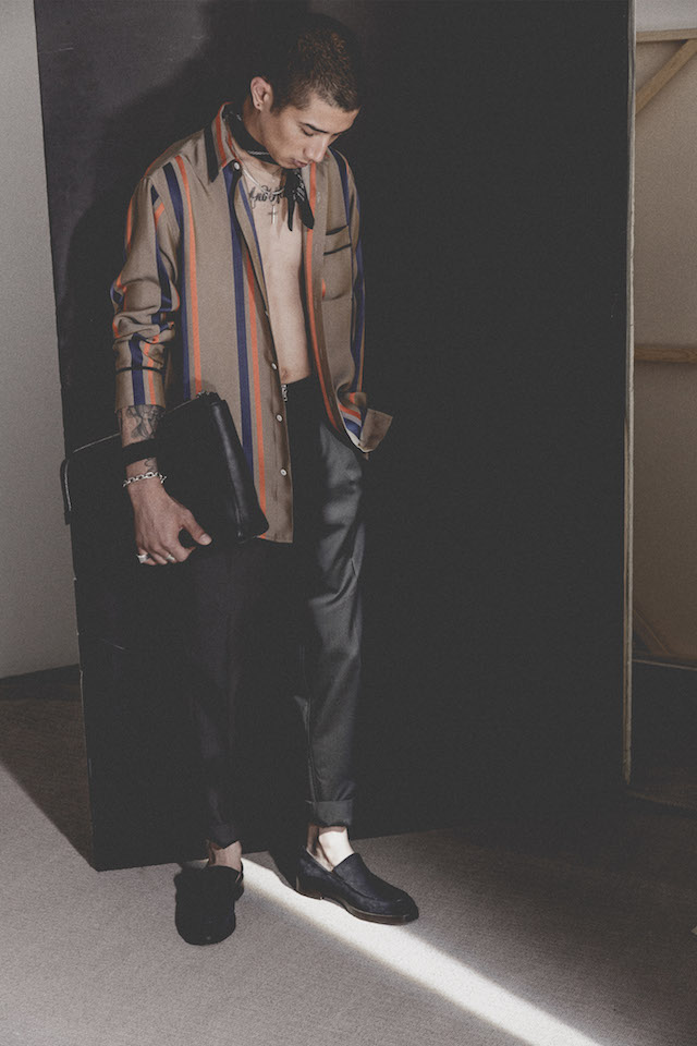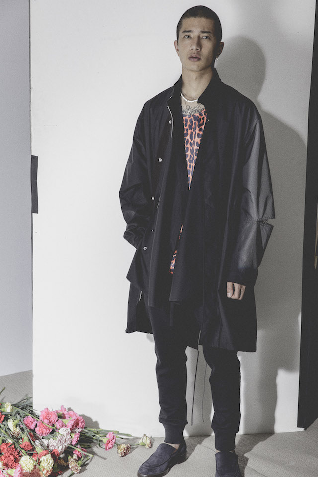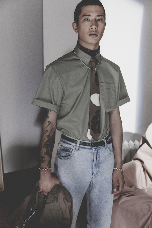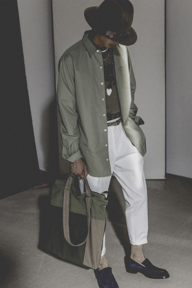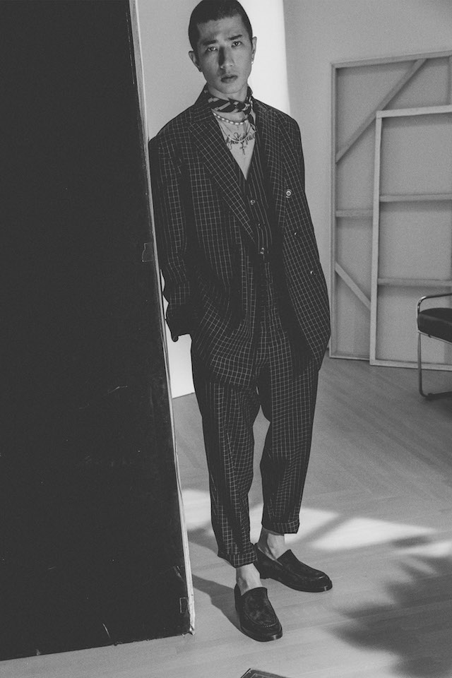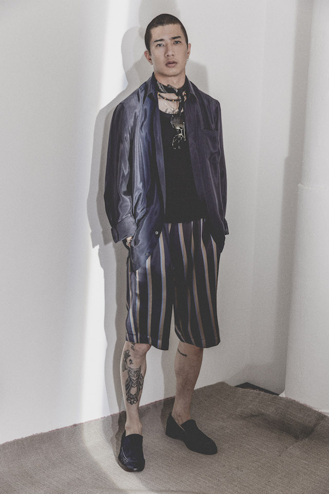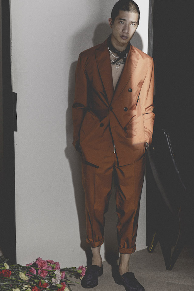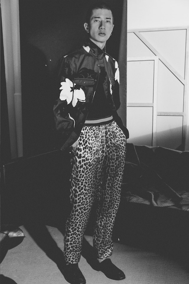 1950年代のメンズウェアに着用を得たクロップド丈のヘムラインが特徴的なダブルジャケットや、着物からインスパイアされたシャツなど、全体を通してリラックス感の漂うアイテムが揃う中、ミッドナイトフローラル柄のモチーフは、バッドボーイのロマンティックな一面を垣間見せた。