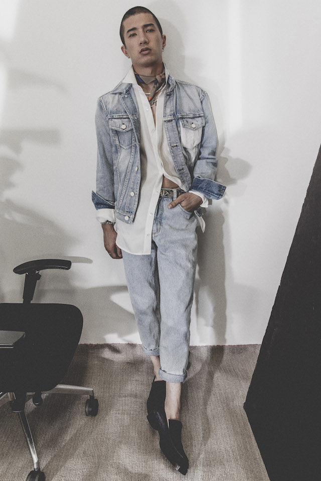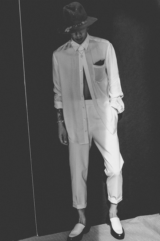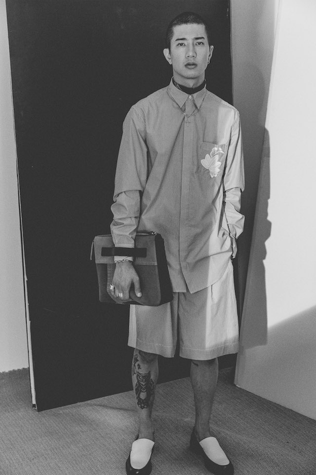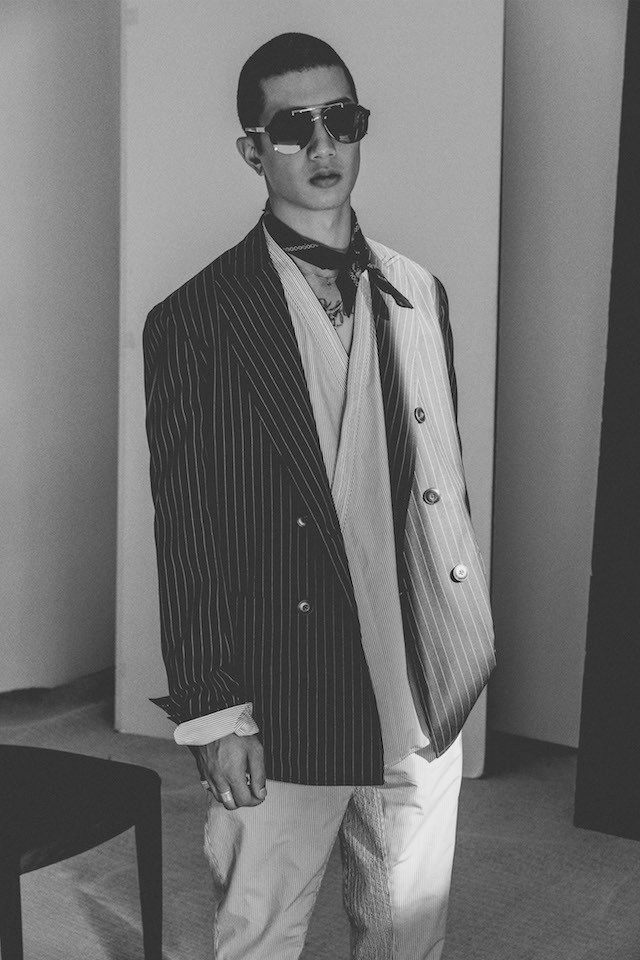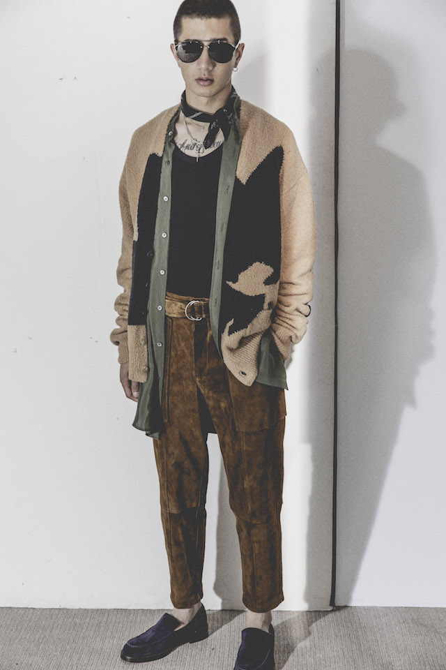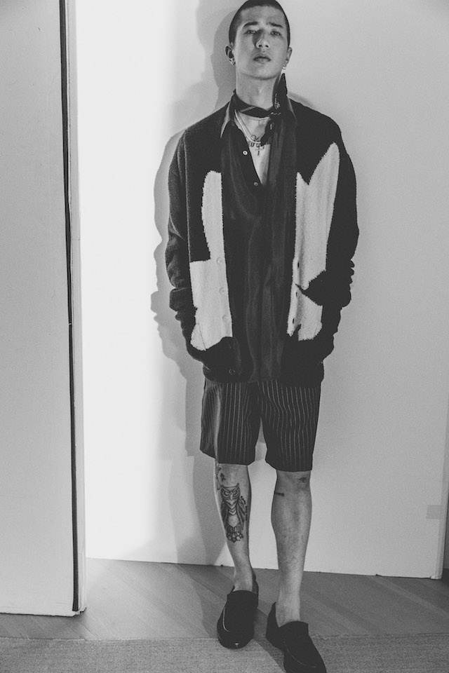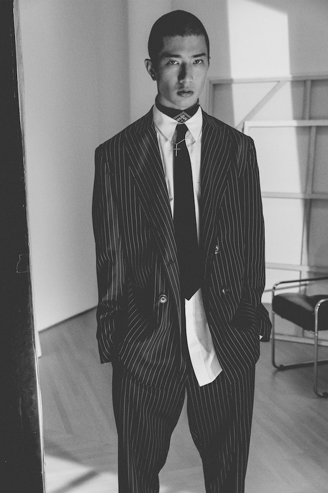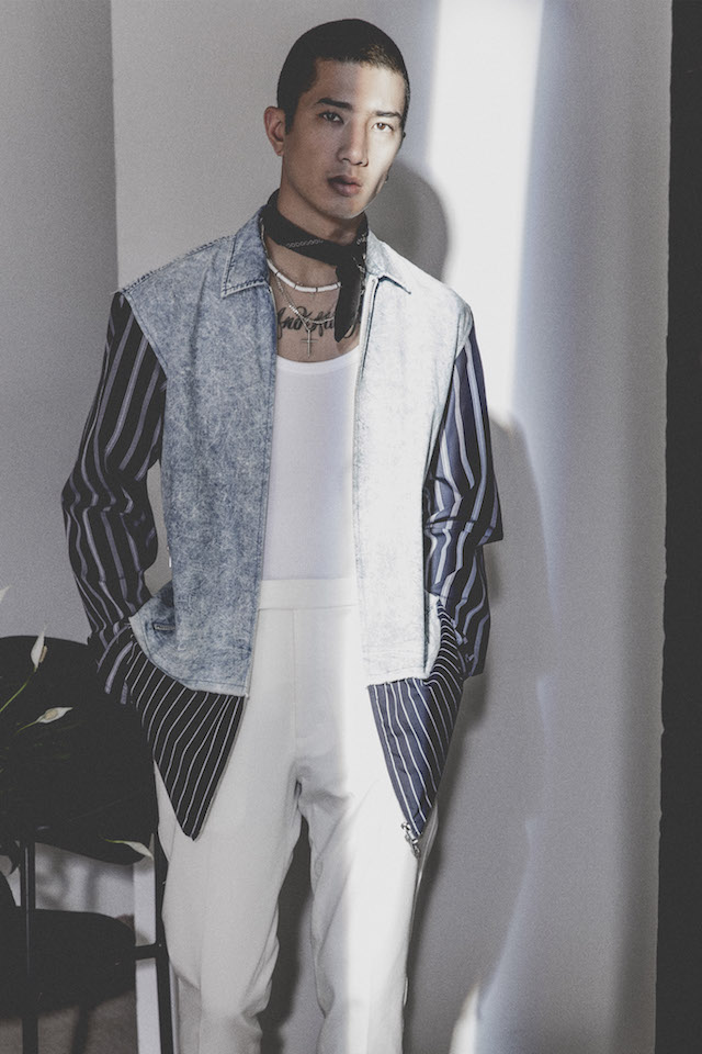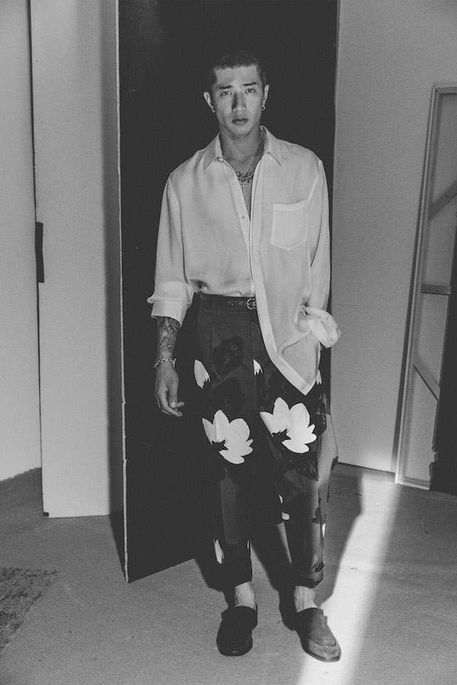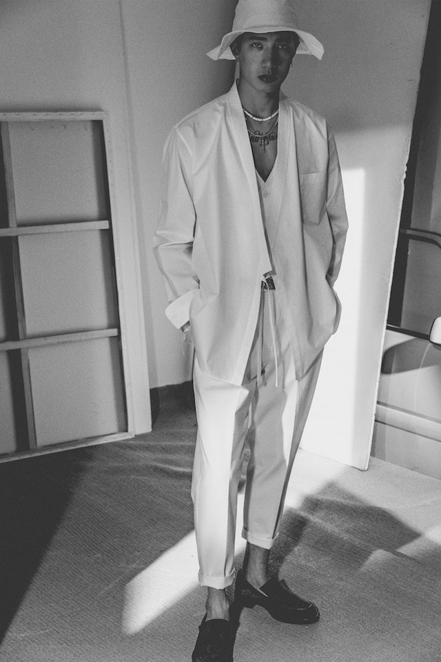 1950年代のメンズウェアに着用を得たクロップド丈のヘムラインが特徴的なダブルジャケットや、着物からインスパイアされたシャツなど、全体を通してリラックス感の漂うアイテムが揃う中、ミッドナイトフローラル柄のモチーフは、バッドボーイのロマンティックな一面を垣間見せた。