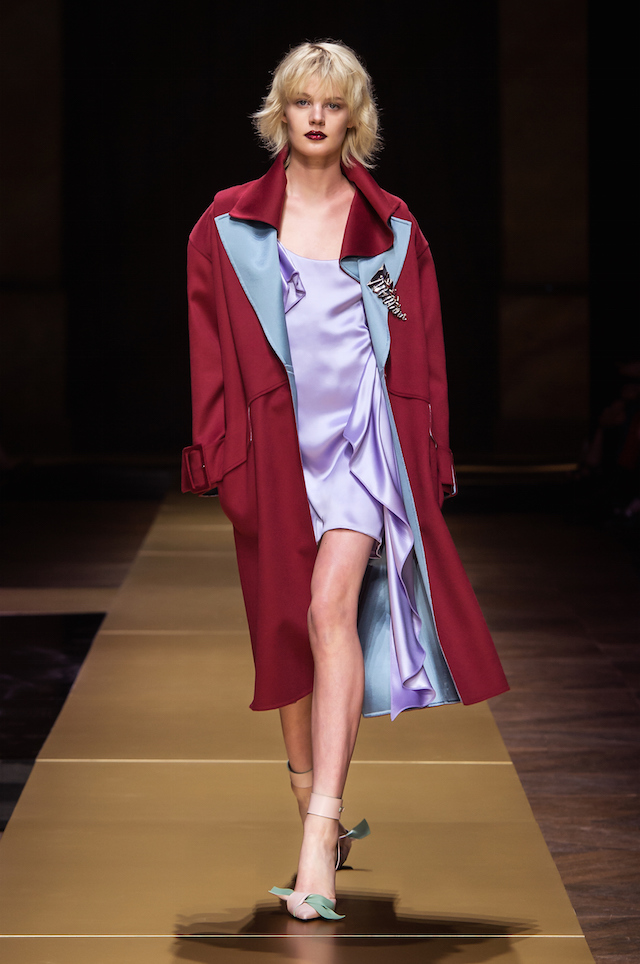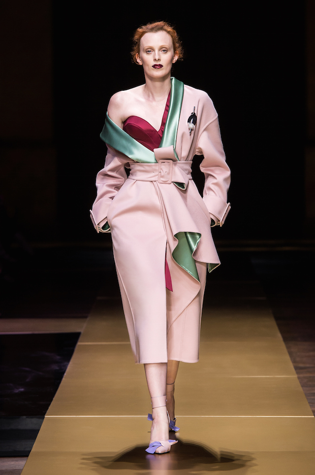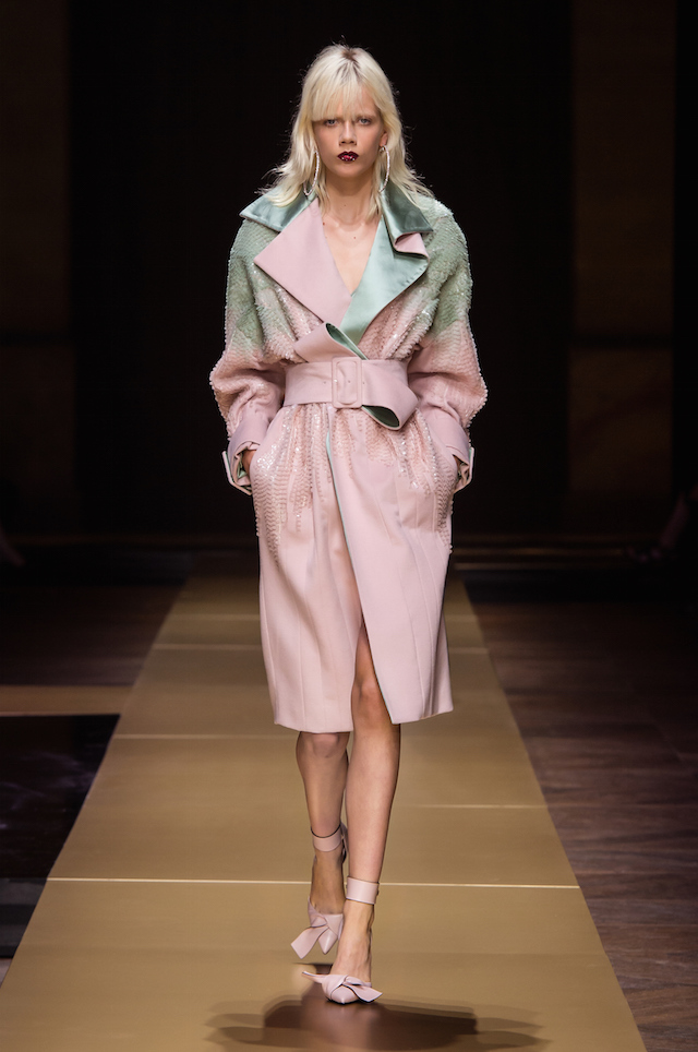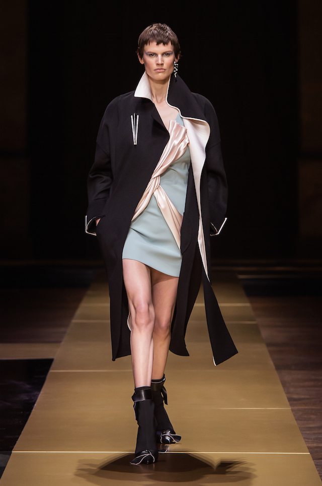 ファーストルックで幕を切ったのは、Karen Elson (カレン・エルソン)。ペールピンクとジェイドカラーのダブルフェイスで仕立てられたウールコートは、肩が落ちたようにざっくり羽織り、下からバーガンディのサテンガウンを合わせている。
