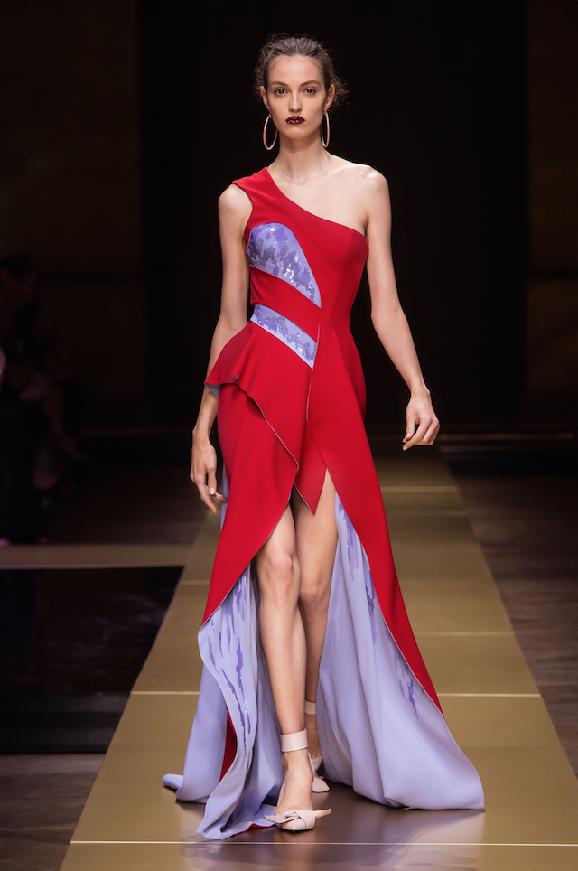 全体を通して、Versace (ヴェルサーチ) の DNA であるフェミニンなシルエットと、フレンチクチュールのような抜け感のあるフリュイッドなファブリック使いが目を引く今季のコレクションだが、その裏には当然想像を絶するアトリエの技巧が隠されている。中盤にて Bella Hadid (ベラ・ハディッド) が着用した真紅のガウンには、首元から右肩、そして胸元からバイアスのドレープがあしらわれているが、ラフに見えるこのディティールでさえ、ドレープの襞 (ひだ) ひとつひとつを完璧なフォルムに仕上げるため、目に見えないほど細やかなステッチワークが施されている。